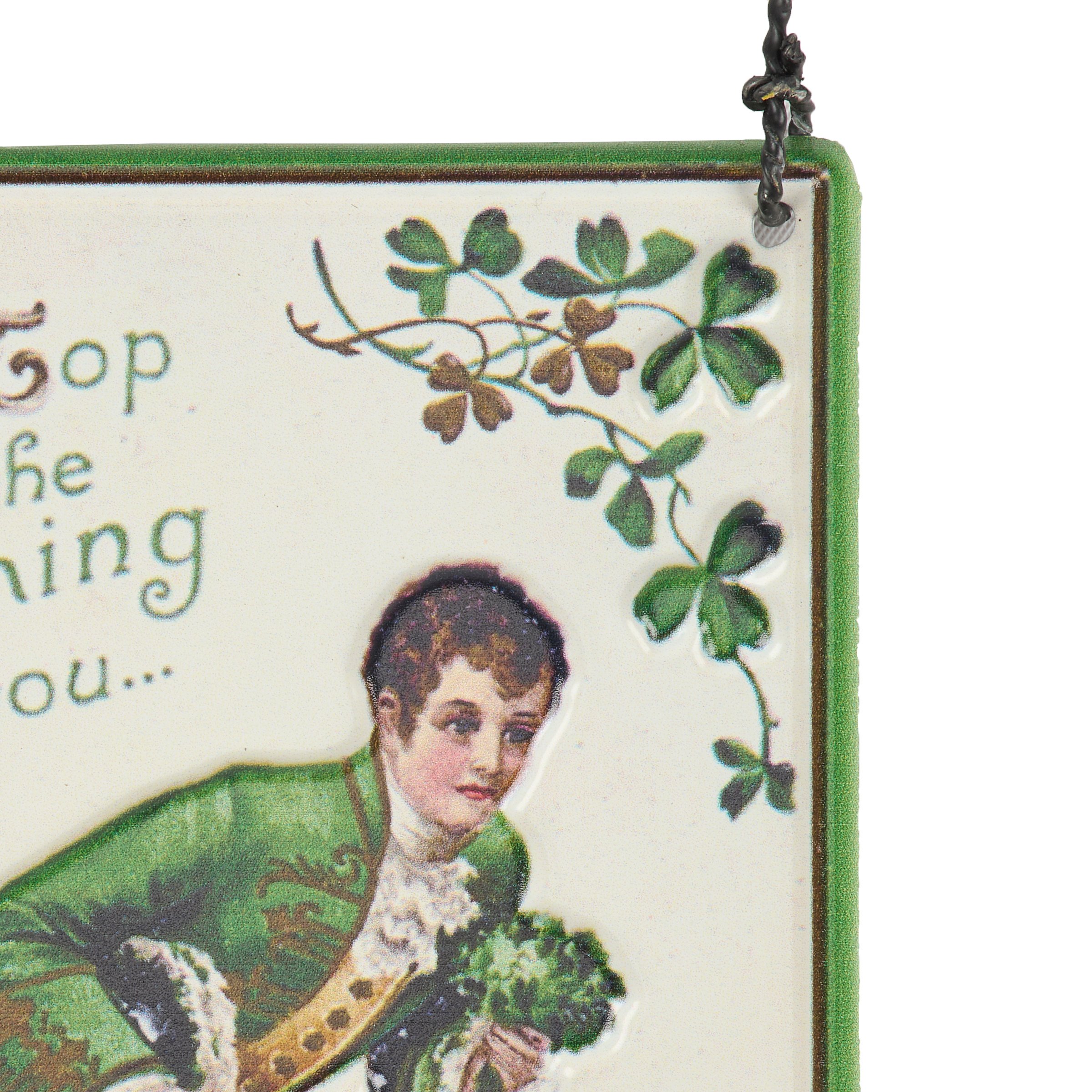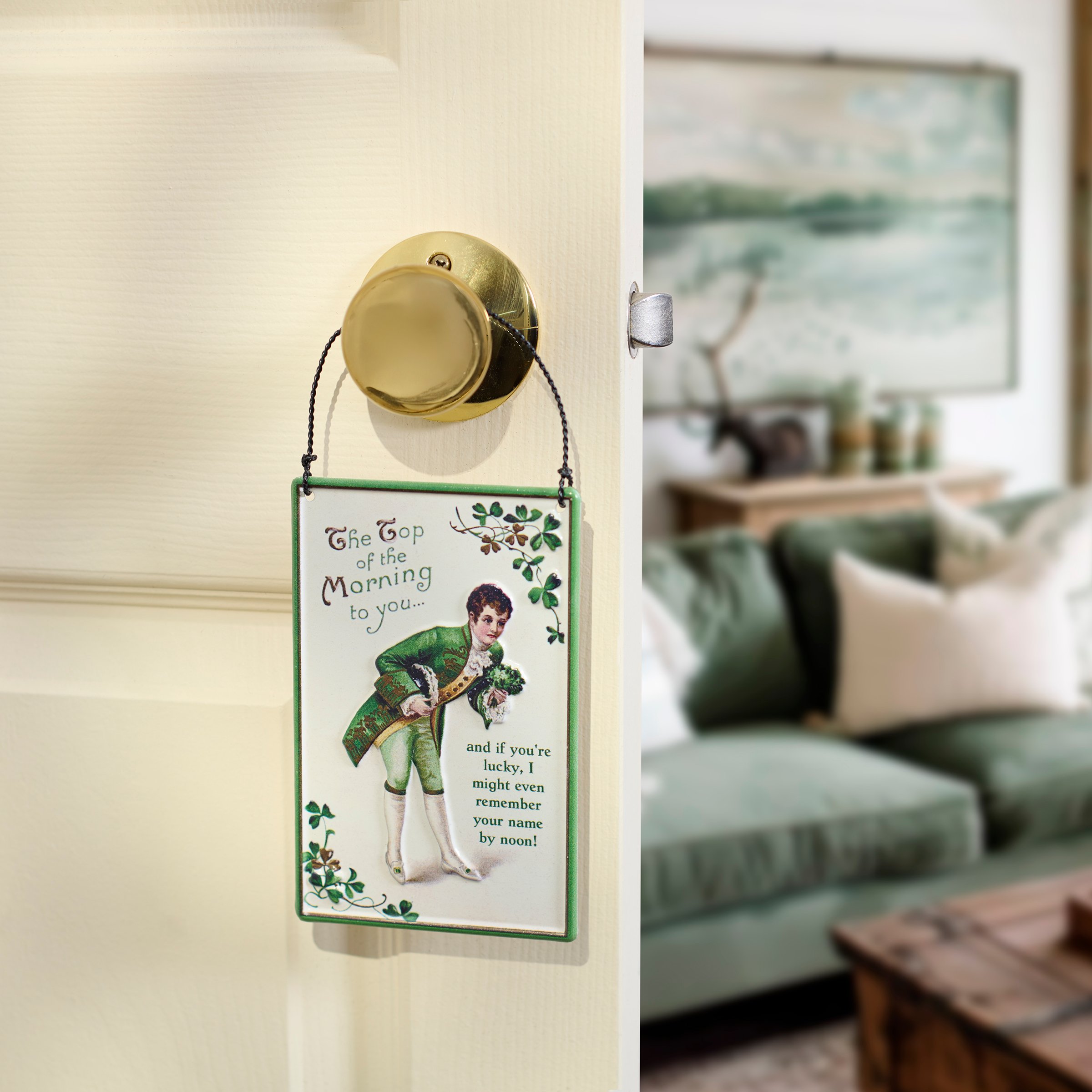 A metal ornament from our St. Patrick's Day Collection displaying vintage art of a fancy Irishman holding a bouquet with a sassy seasonal sentiment that reads "The Top Of The Morning To You... And If You're Lucky, I Might Even Remember Your Name By Noon!" St. Patrick's Day ornament features embossed details throughout for added dimension. Our Top Of The Morning ornament is ready to hang for display via attached twisted wire hanger. A fun St. Patrick's Day home accent that easily adds seasonal style to any home or work space.