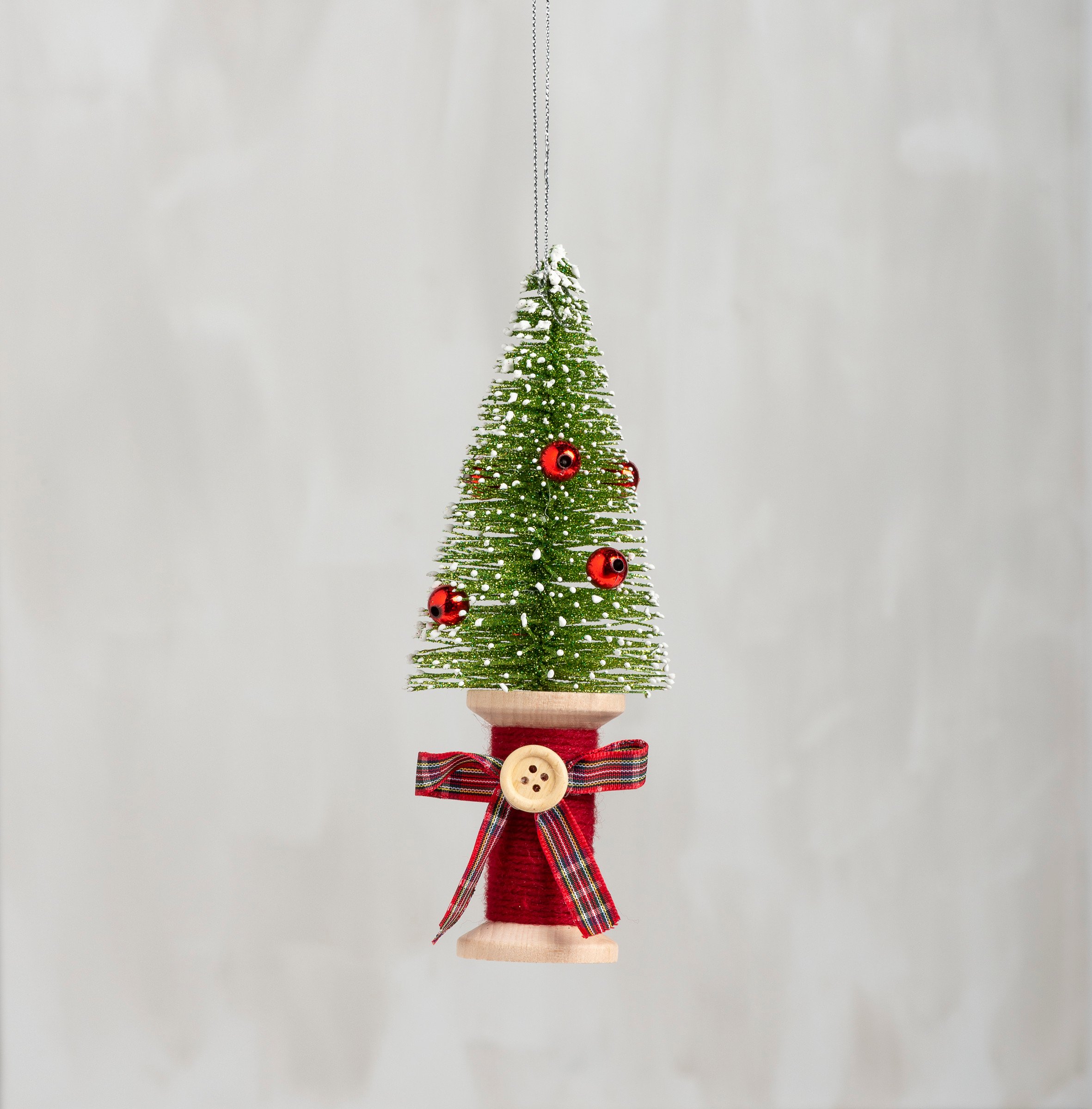 A bristled tree on a spool ornament for Christmas featuring glitter details. Contains top loop for easy hanging.