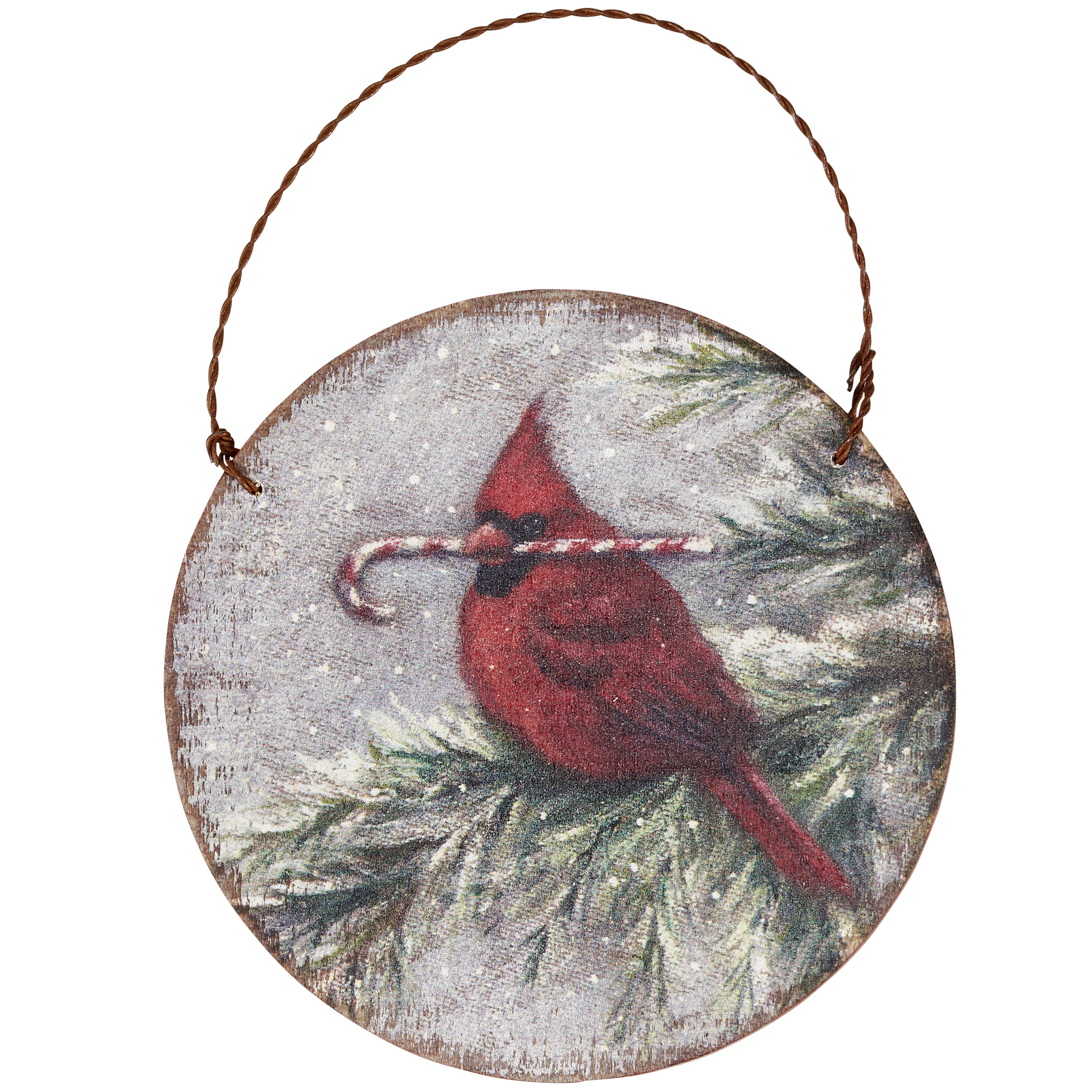 A round wooden ornament from our Christmas Collection displaying a charming winter scene of a cardinal. Design is replicated from original artwork painted onto burlap canvas, giving the art a unique depth and texture. Seasonal ornament features distressed details with coordinating red color on the sides and back. Our Winter Cardinal ornament is easy to hang for display via attached twisted wire hanger. A rustic winter-themed ornament perfect for seasonal display.