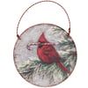 A round wooden ornament from our Christmas Collection displaying a charming winter scene of a cardinal. Design is replicated from original artwork painted onto burlap canvas, giving the art a unique depth and texture. Seasonal ornament features distressed details with coordinating red color on the sides and back. Our Winter Cardinal ornament is easy to hang for display via attached twisted wire hanger. A rustic winter-themed ornament perfect for seasonal display.