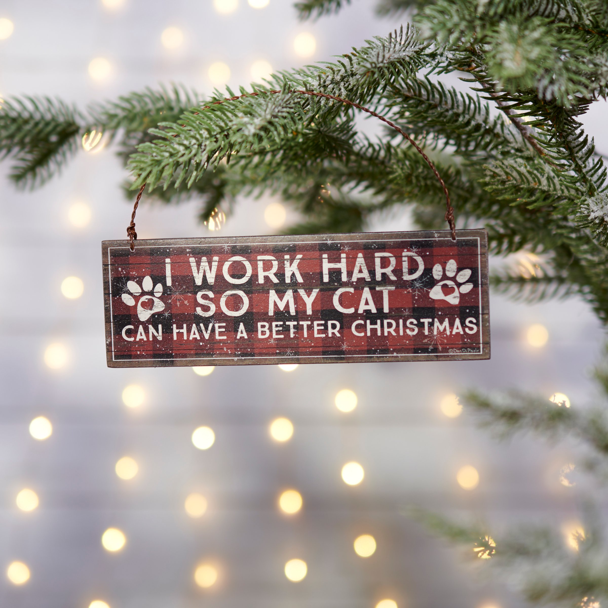 A wooden ornament from our Holiday Pet Collection/ featuring a pet inspired holiday design in a rustic style. Design displays a fun pet-themed sentiment that reads "I Work Hard So My Cat Can Have A Better Christmas." Seasonal ornament also features distressed details with coordinating black color on the sides and back. Our Work Hard Cat ornament is easy to hang for display via attached twisted wire hanger. A fun pet-themed ornament perfect for seasonal display.