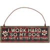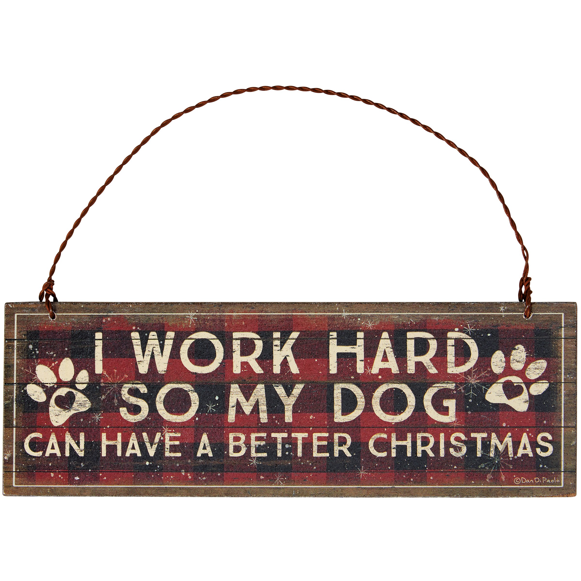 A wooden ornament from our Holiday Pet Collection/ featuring a pet inspired holiday design in a rustic style. Design displays a fun pet-themed sentiment that reads "I Work Hard So My Dog Can Have A Better Christmas." Seasonal ornament also features distressed details with coordinating black color on the sides and back. Our Work Hard Dog ornament is easy to hang for display via attached twisted wire hanger. A fun pet-themed ornament perfect for seasonal display.