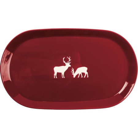 A red stoneware oval platter featuring deer designs in the center. Microwave, dishwasher, and food safe.