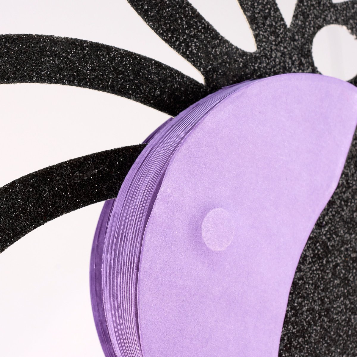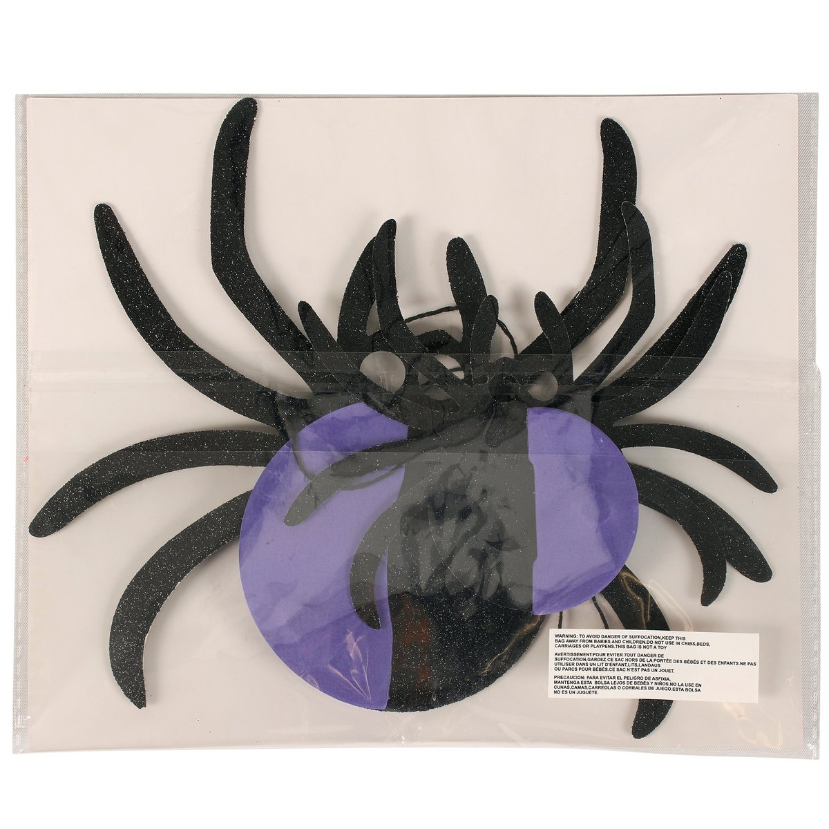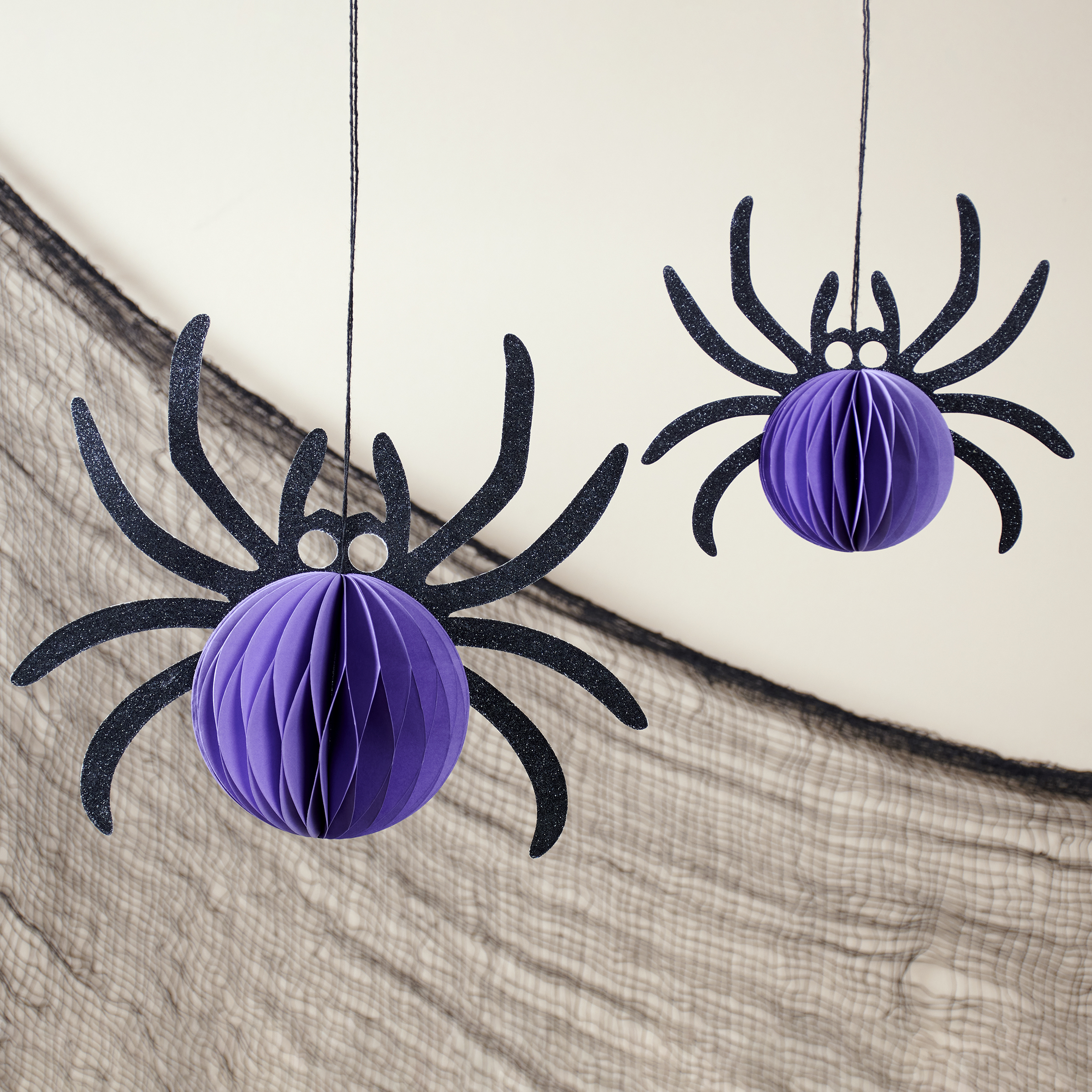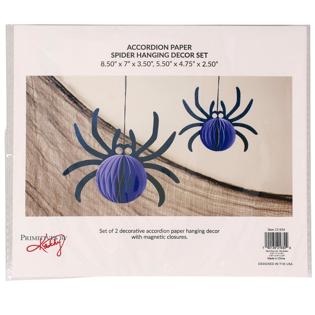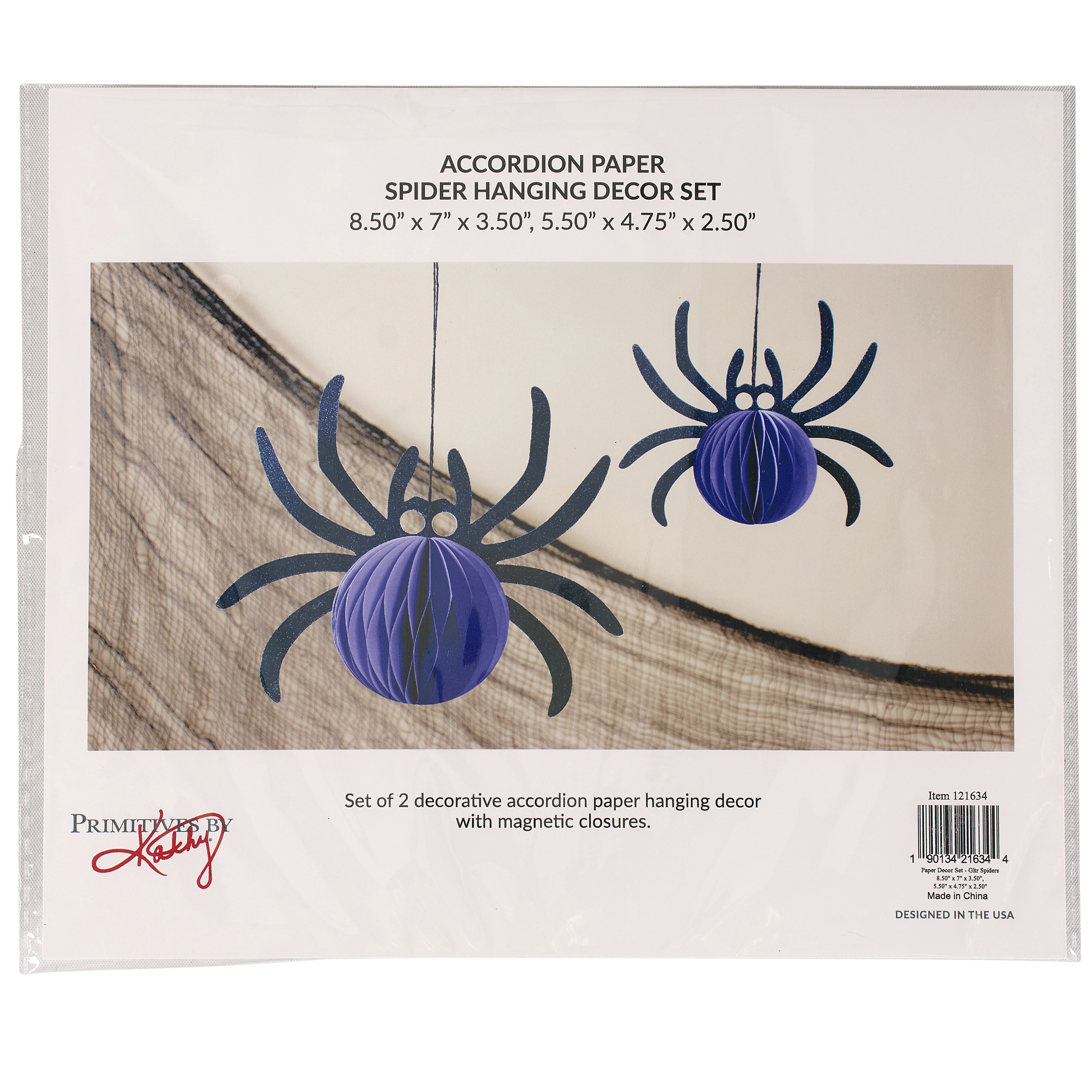 A set of paper décor pieces from our Halloween Collection including 2 different size spider designs in a vintage folding paper style. Halloween paper decor features spider cutouts with black glitter finish and purple accordion paper pieces on both sides for a fun 3D design. Our Glitter Spiders paper decor set is easy to hang for display via the attached black string hangers. Seasonal paper decor folds up flat for compact storage and includes magnets to easily unfold and hold shape after storing. Paper decor set is packaged together flat in a polybag with card displaying full design and product information for easy store display. A set of fun vintage Halloween home accents perfect for seasonal decorating.