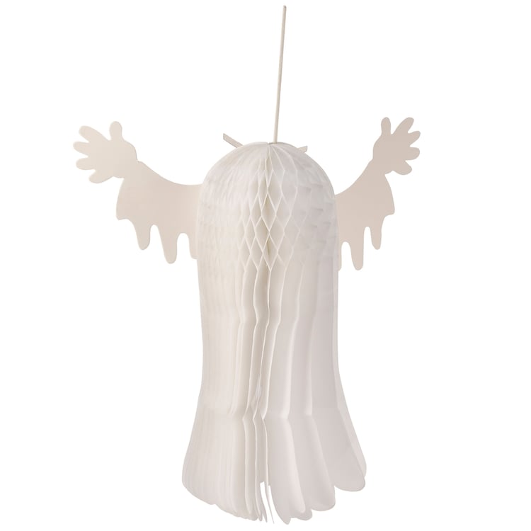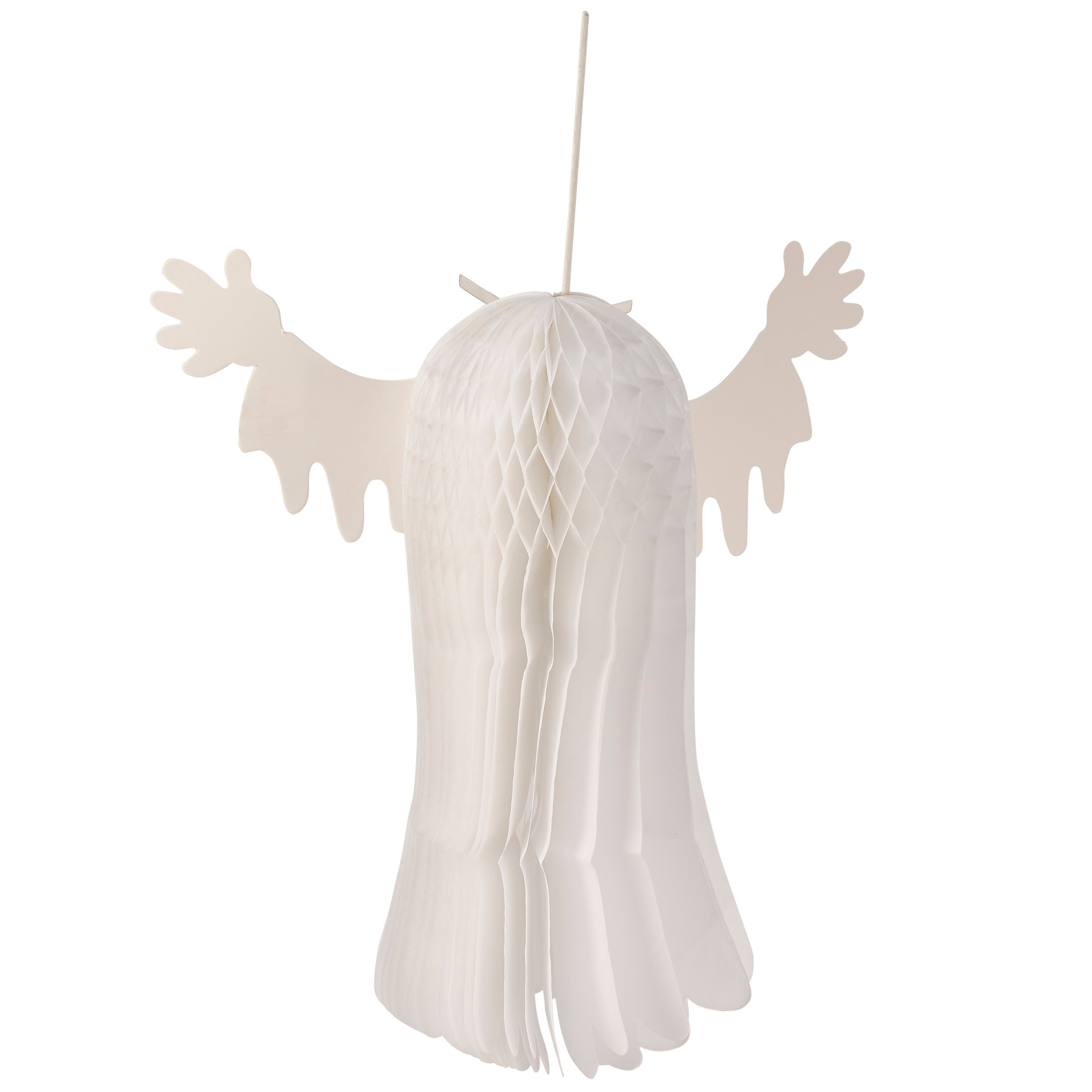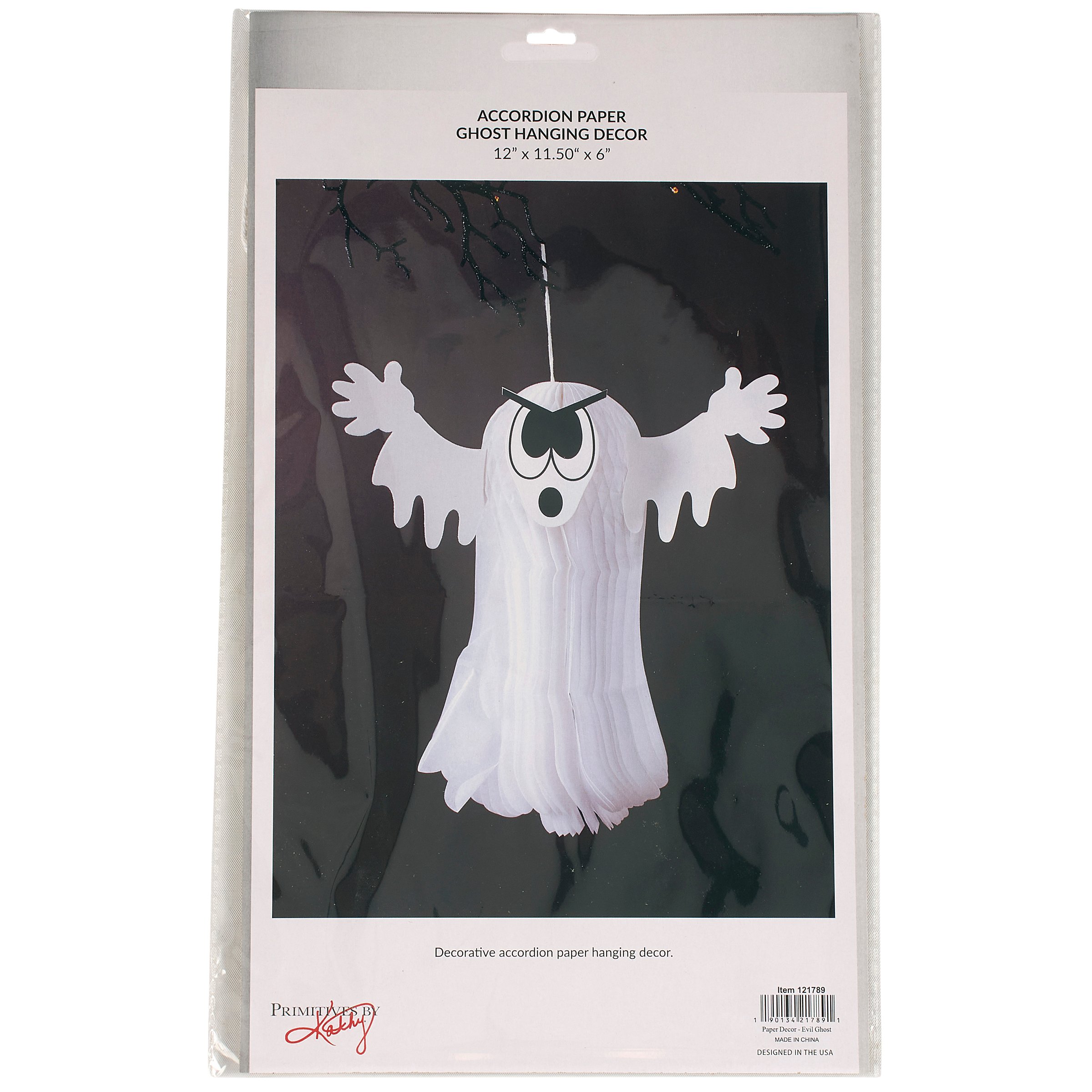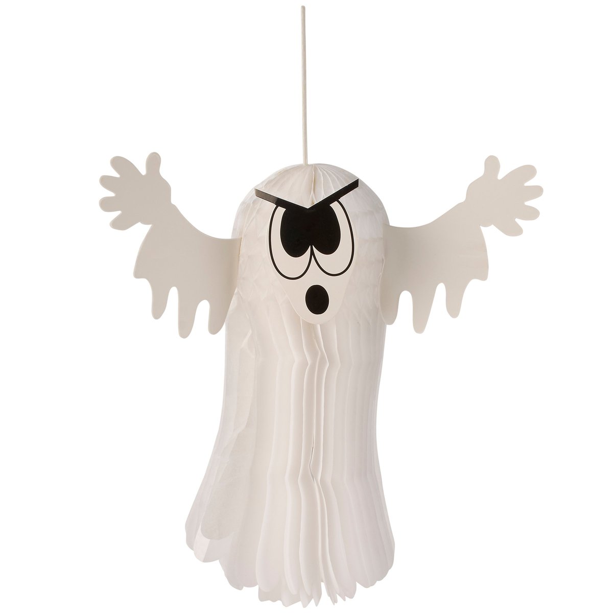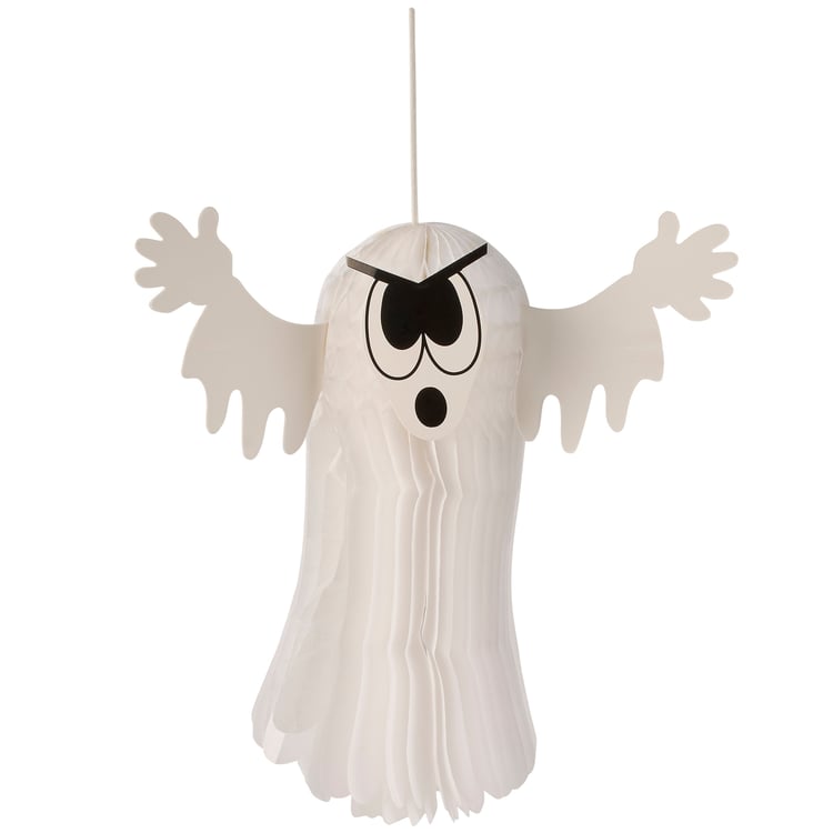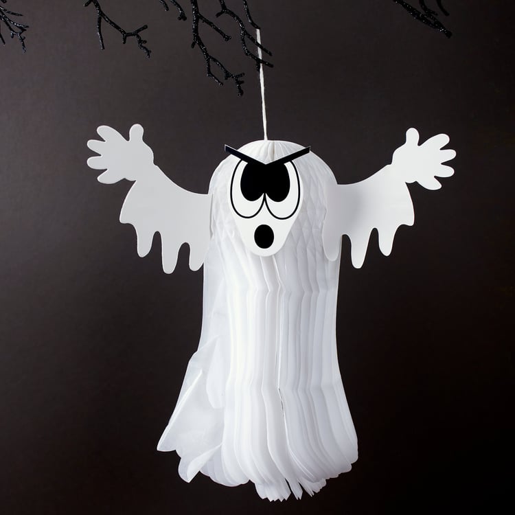 A paper decoration from our Halloween Collection displaying an evil ghost design in a vintage folding paper style. Halloween paper decoration features ghost face and arm cutouts attached to a white accordion paper piece for a fun 3D design. Our Evil Ghost paper decoration is easy to hang for display via the attached white string hanger. Seasonal paper decoration folds up flat for compact storage and easily unfolds to display again. Paper decoration is packaged flat in a polybag with card displaying full design and product information for easy store display. A fun vintage Halloween home accent perfect for seasonal decorating.