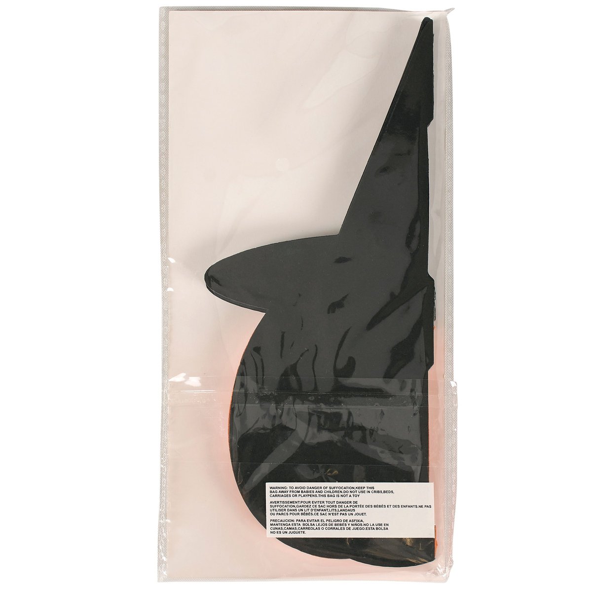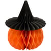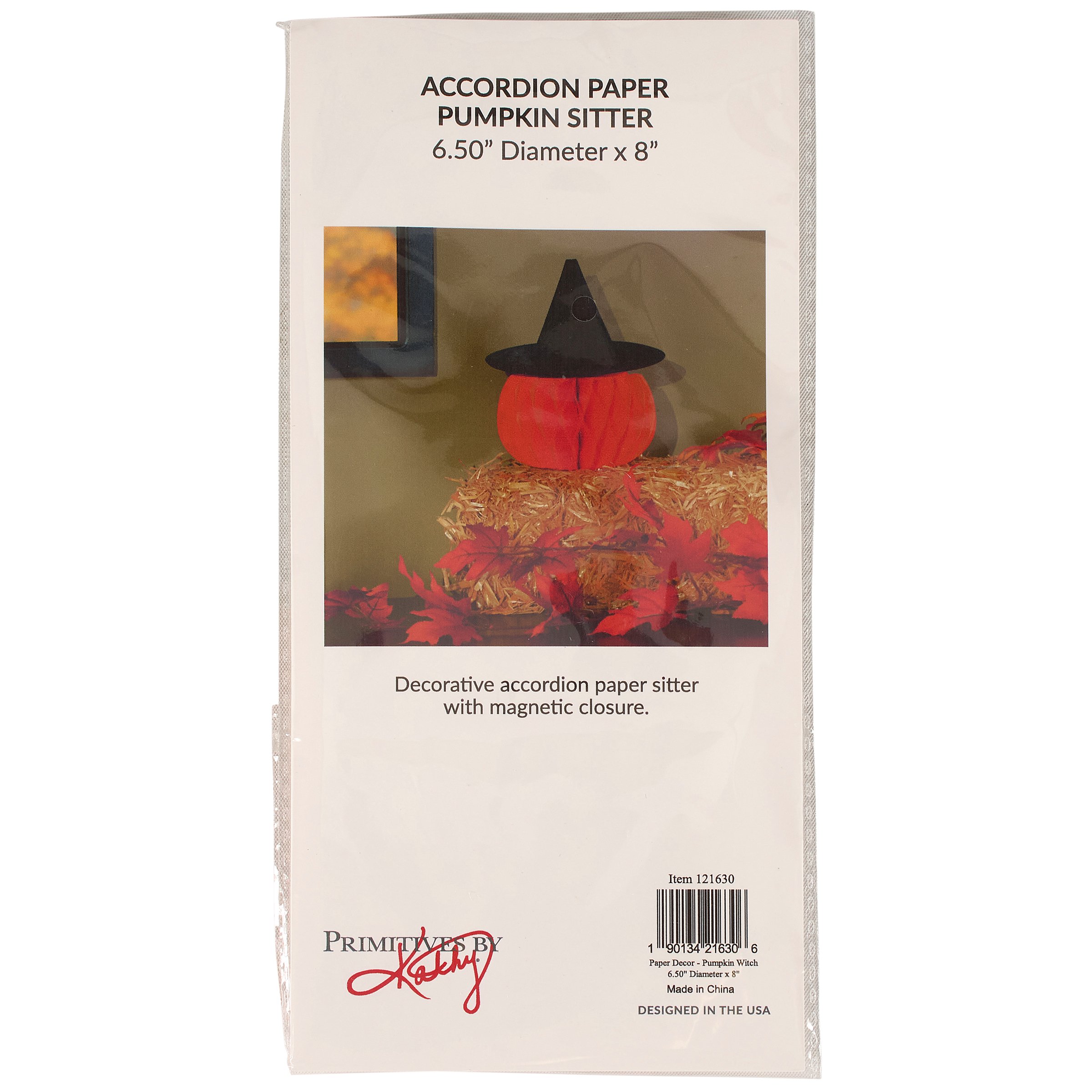 A paper decoration from our Halloween Collection displaying a fun pumpkin and witch hat design in a vintage folding paper style. Halloween paper decoration features orange and black accordion paper pieces attached together for a fun 3D design. Our Pumpkin Witch paper decoration is designed to free stand on flat surface for easy display. Seasonal paper decoration folds up flat for compact storage and includes a magnet to easily unfold and hold shape after storing. Paper decoration is packaged flat in a polybag with card displaying full design and product information for easy store display. A fun vintage Halloween home accent perfect for seasonal decorating.