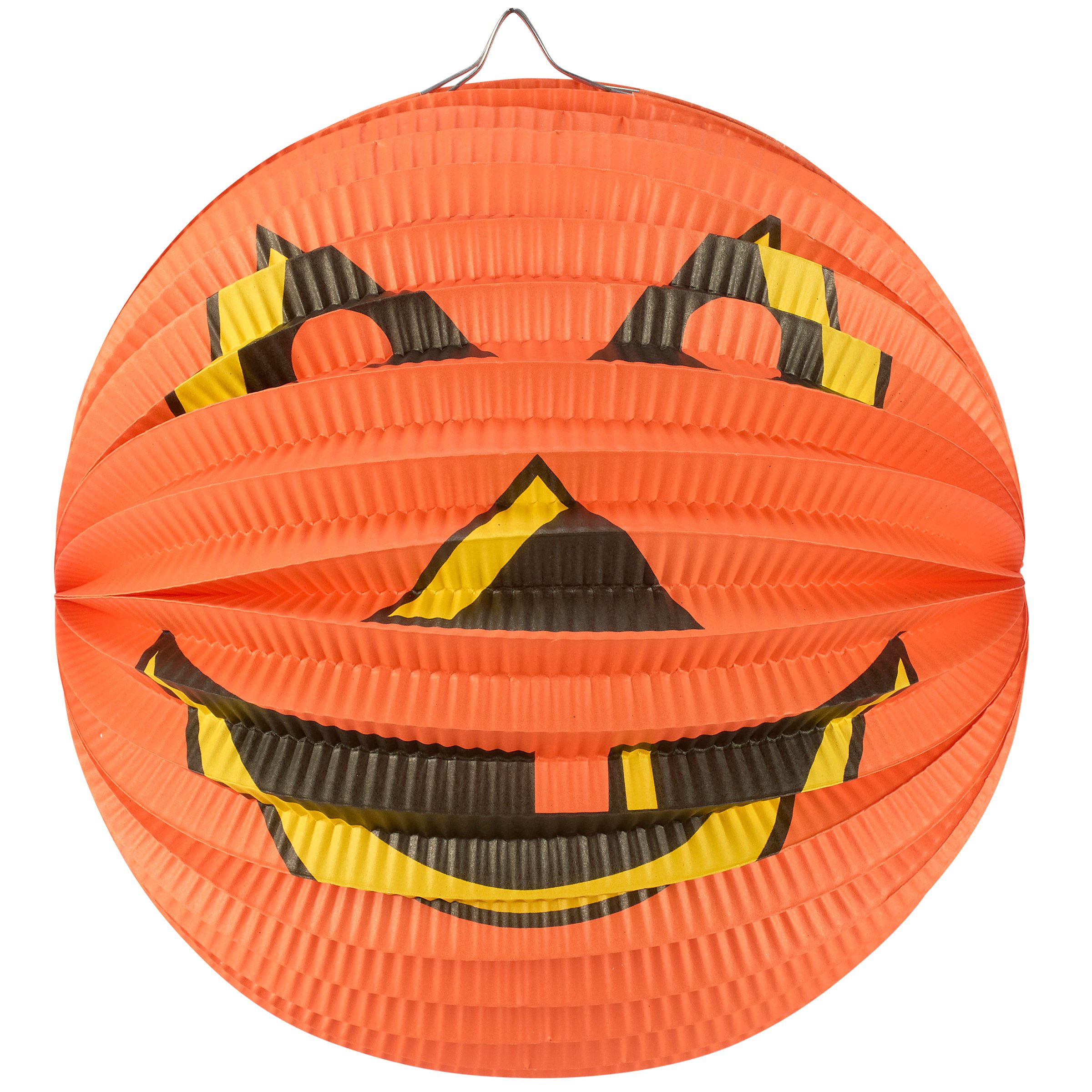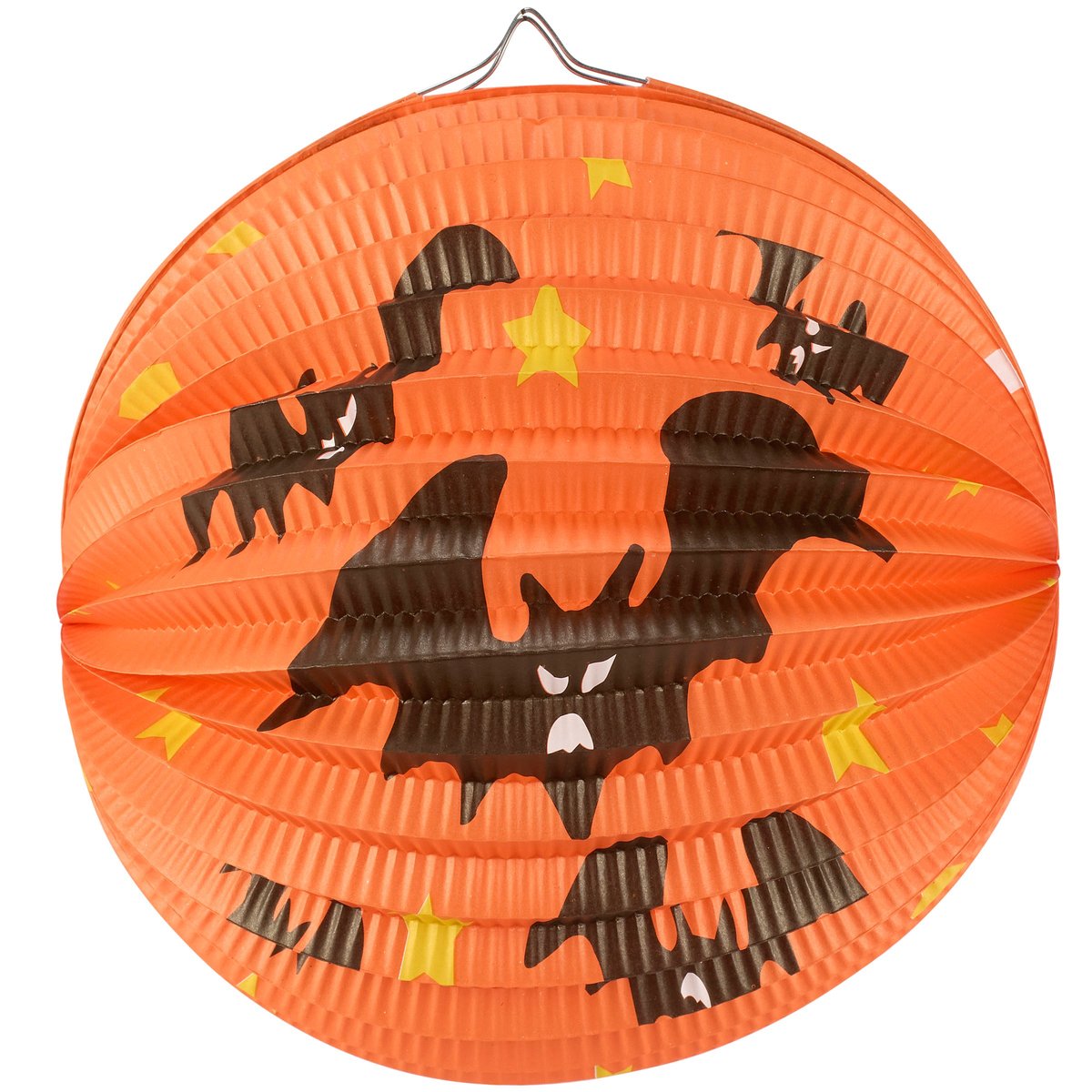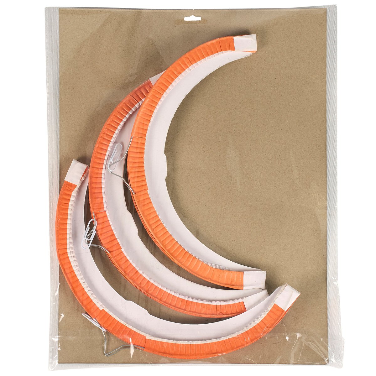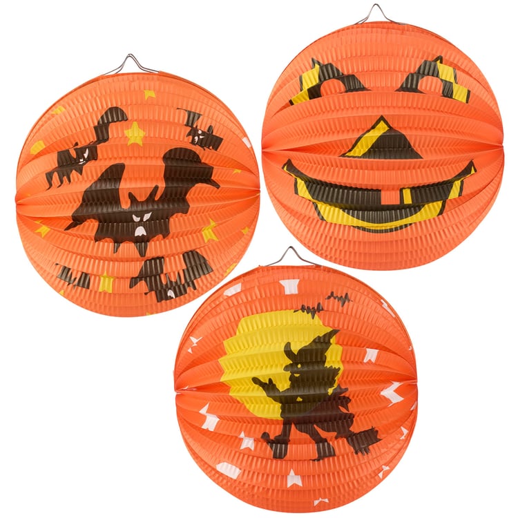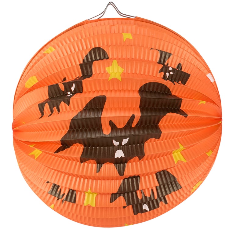 A paper decoration set from our Halloween Collection displaying 3 individual Halloween themed designs in a vintage folding paper style. Halloween paper decorations feature art of a jack o'lantern, bats, and flying witch on orange accordion paper pieces for a fun 3D design. Our Halloween paper decoration set is easy to hang for display via the metal hangers at the end of each side of the accordion paper pieces. Seasonal paper decorations fold up flat for compact storage and easily unfold to display again. Paper decoration set is packaged together flat in a polybag with card displaying full design and product information for easy store display. A set of fun vintage Halloween home accents perfect for seasonal decorating.