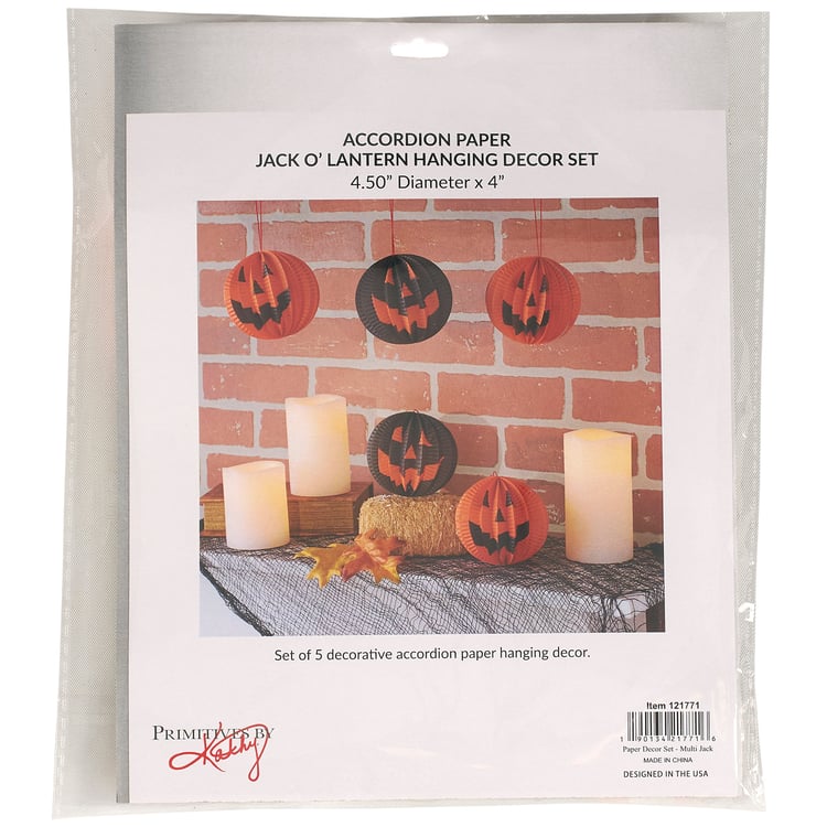 A paper decoration set from our Halloween Collection displaying 5 jack o'lanterns in a vintage folding paper style. Halloween paper decorations feature jack o'lantern faces printed on orange or black accordion paper pieces for a fun 3D design. Our Multi Jack paper decoration set is easy to hang for display via attached string hangers or can free stand on flat surface. Seasonal paper decorations fold up flat for compact storage and easily unfold to display again. Paper decoration set is packaged together flat in a polybag with card displaying full design and product information for easy store display. A set of fun vintage Halloween home accents perfect for seasonal decorating.