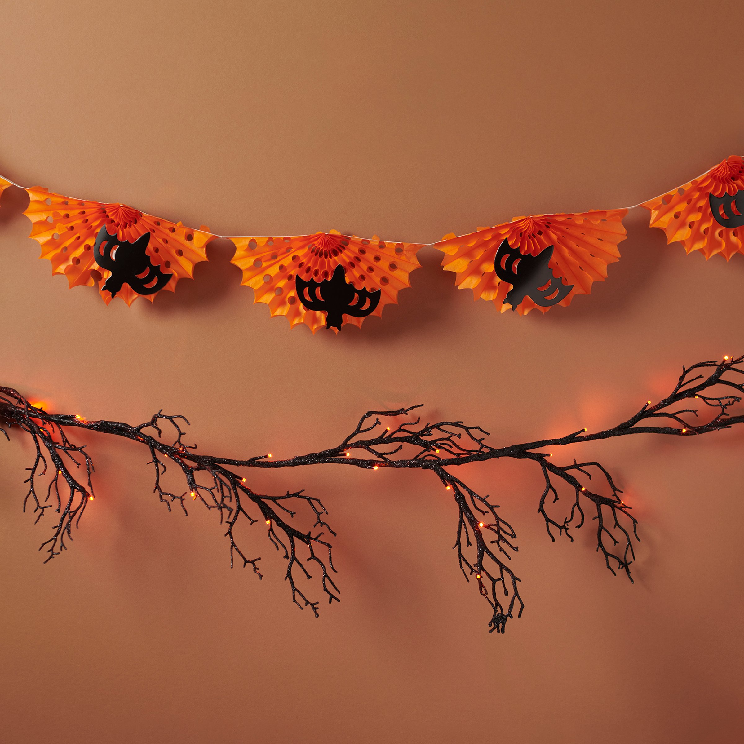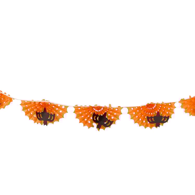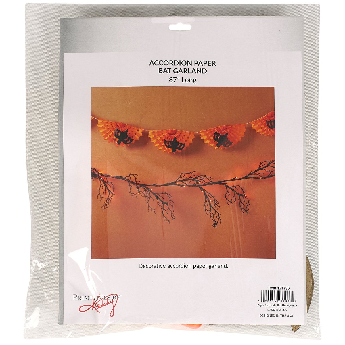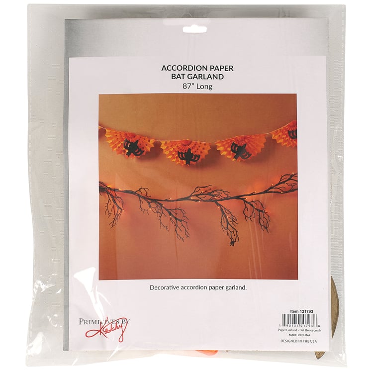 A paper garland from our Halloween Collection displaying bat designs and vintage folding paper accents. Halloween paper garland features black bat cutouts attached to orange accordion paper pieces for a fun 3D design. Our Bat Honeycomb paper garland is easy to hang for display via string loops each end. Seasonal paper garland folds up flat for compact storage and easily unfolds to display again. Paper garland is packaged flat in a polybag with card displaying full design and product information for easy store display. A fun vintage Halloween home accent perfect for seasonal decorating.