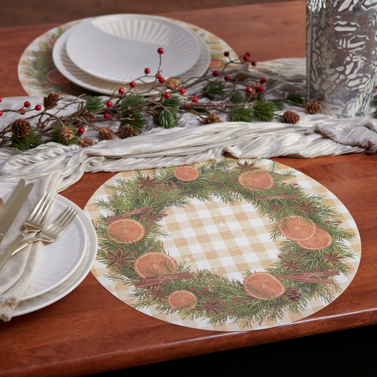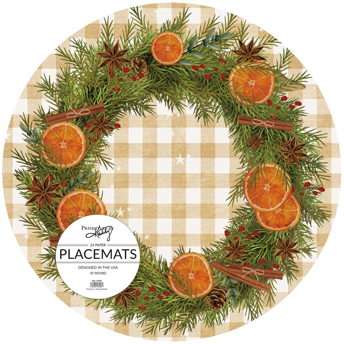 Great for customizing place settings and making clean-up a breeze, these round paper placemats from our Christmas Collection display a rustic design of a wreath with oranges and cinnamon. Our Orange Wreath placemats are shrink-wrapped for protection as well as easy storage and shelf display. Each pack includes 24 single-use, tear-off placemats. A rustic tabletop accessory perfect for customizing seasonal place settings.
