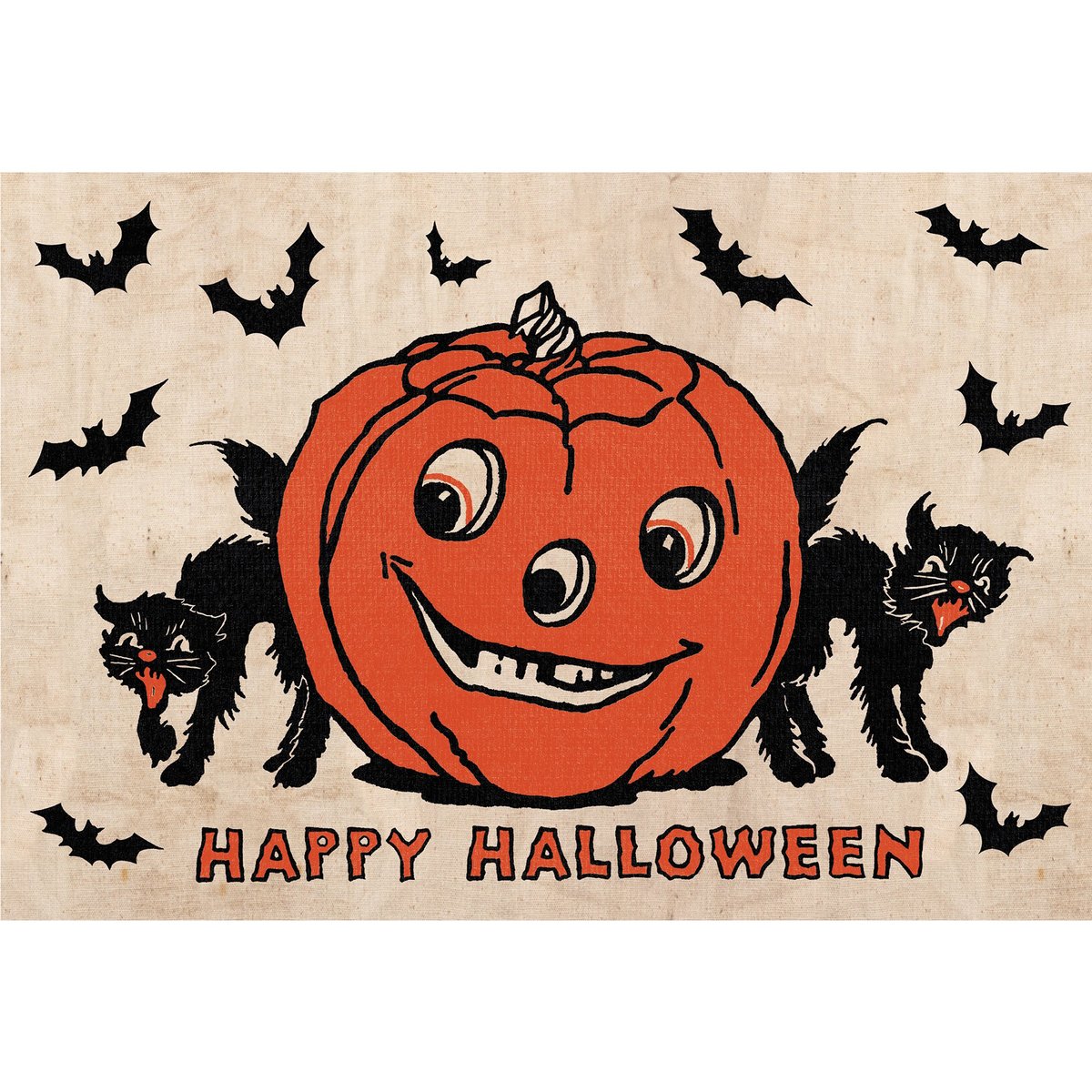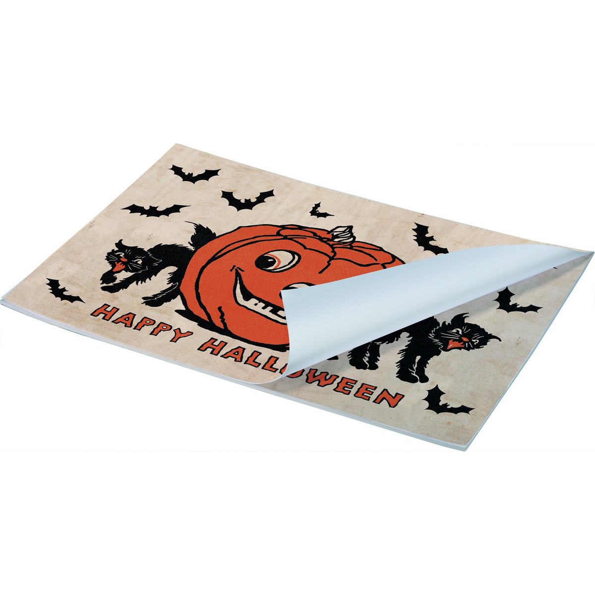 Great for customizing place settings and making clean-up a breeze, these paper placemats from our Halloween Collection feature a "Happy Halloween" sentiment with a retro-style Halloween design featuring a central Jack-'O-Lantern surrounded by black cats and bats. Placemat pad includes 24 single-use, tearaway placemats. Our Happy Halloween placemat pad is shrink-wrapped for protection and storage.