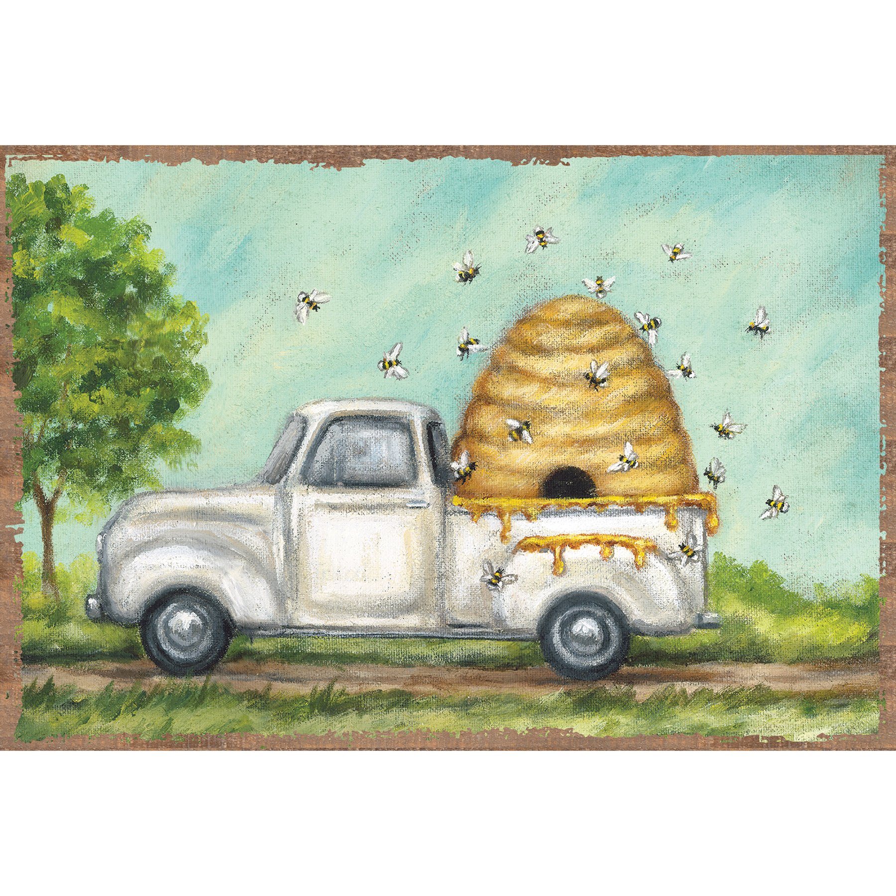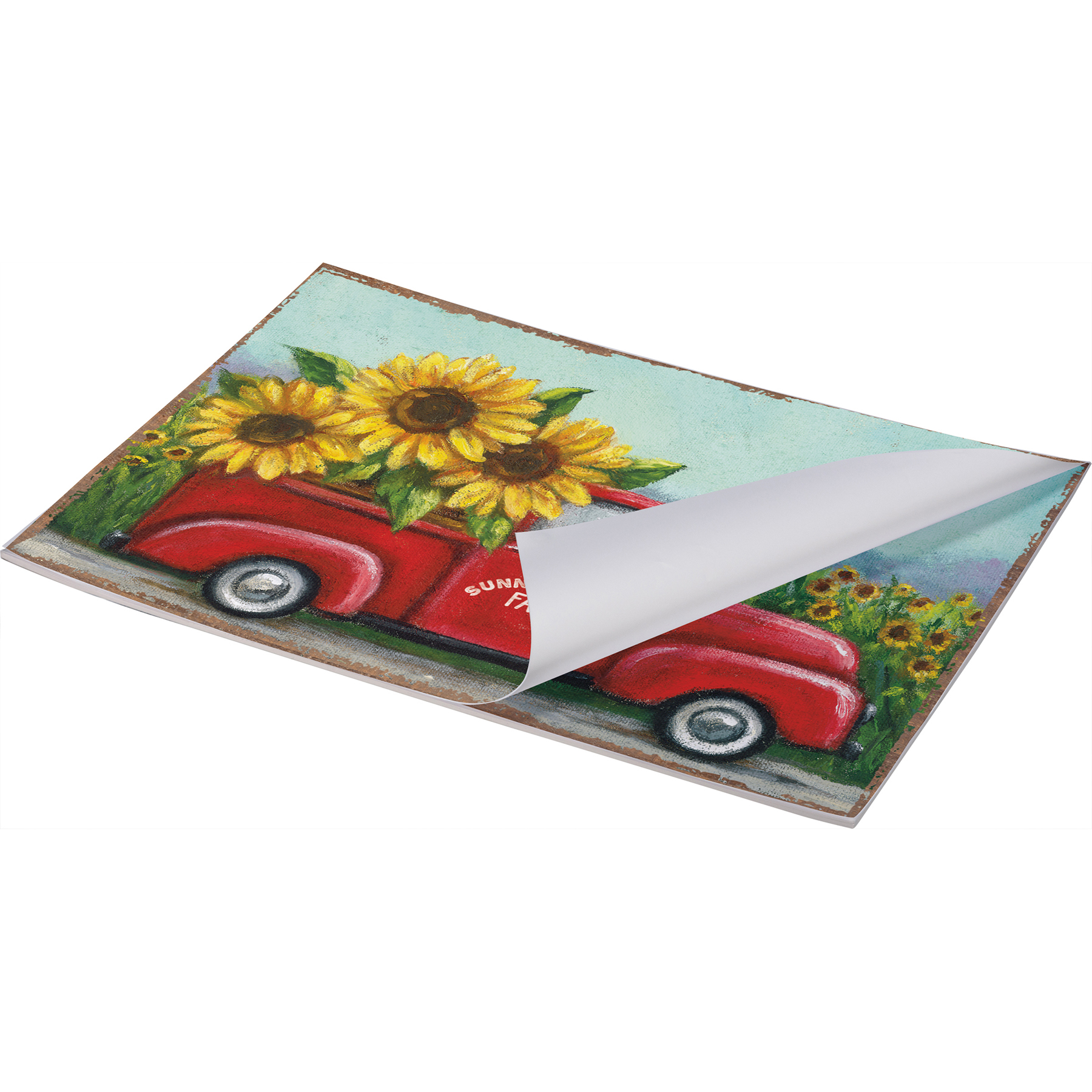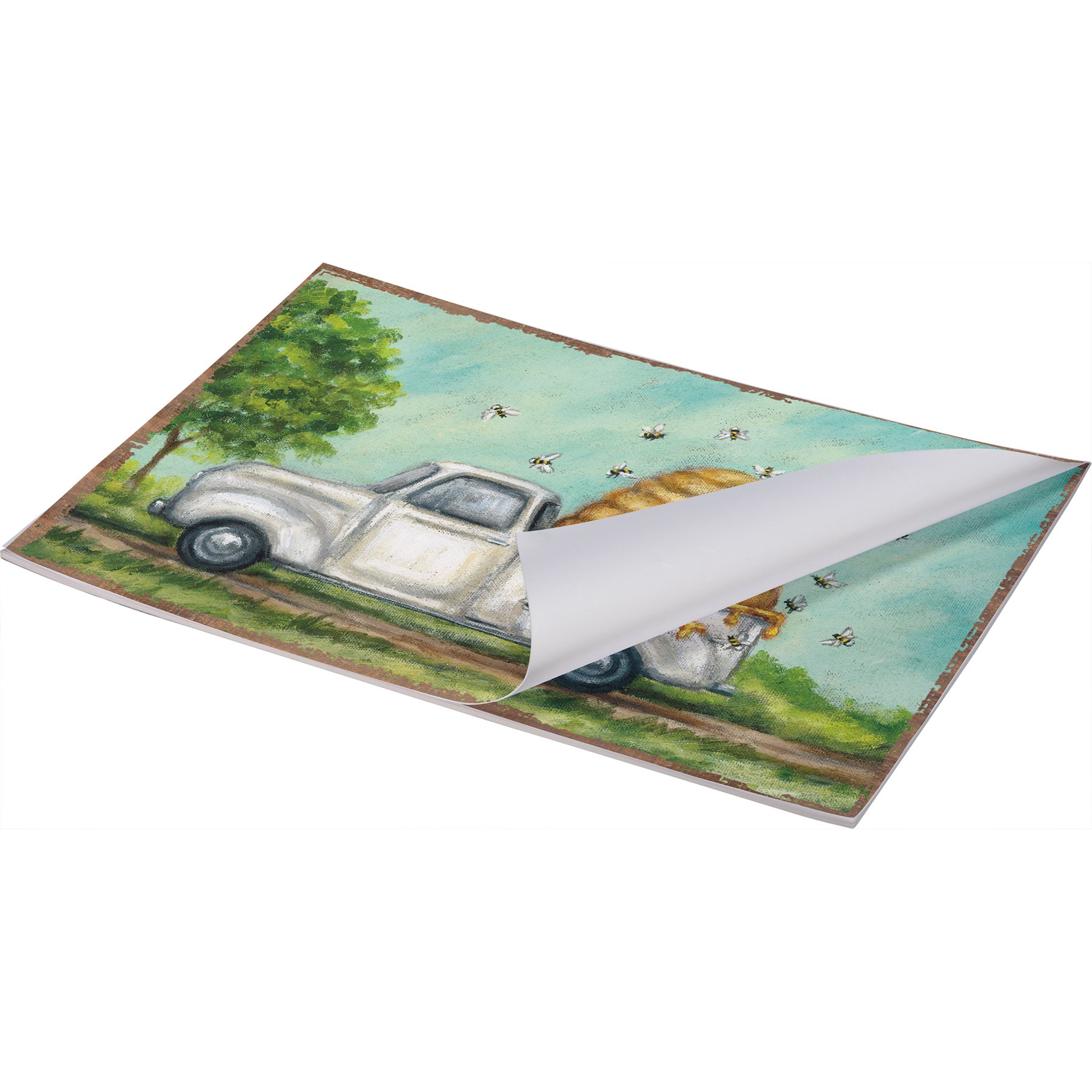 Great for customizing settings and making clean-up a breeze, these paper placemats feature two different truck designs; one hauling oversized sunflowers and the other hauling an oversized beehive. Designs are replicated from original artwork painted onto burlap canvas, giving the art a unique depth and texture. Placemat pad includes 24 single-use, tearaway placemats. Our Trucks placemat pad is shrink-wrapped for protection and storage. Made in the USA.