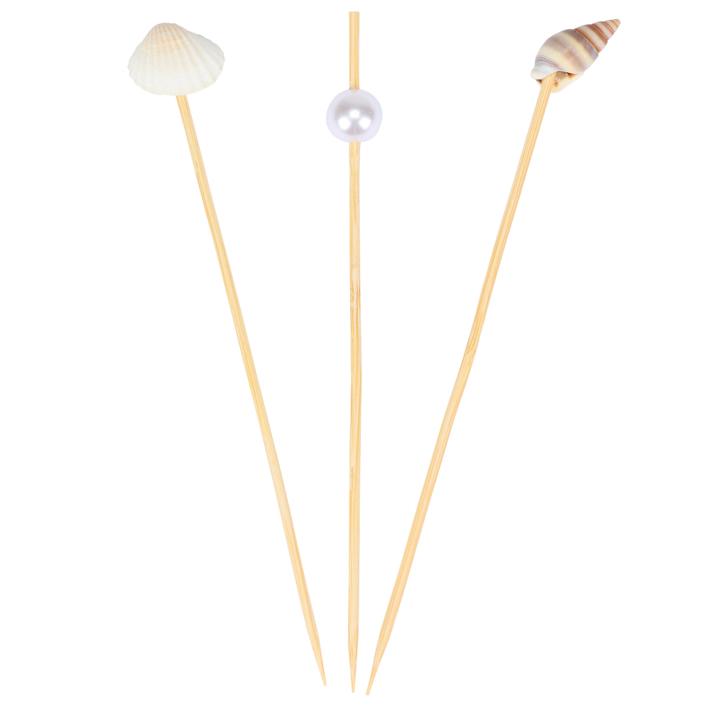 A set of party picks from our Beach Collection featuring 20 long bamboo picks with a mix of faux seashells and oyster pearls attached to the tops that add beach themed charm to food displays. Our Beach party pick set comes packaged in an acrylic box to easily see designs with a hole for hanging on store racks. A set of fun ocean inspired party accessories perfect for beach themed tablescapes.