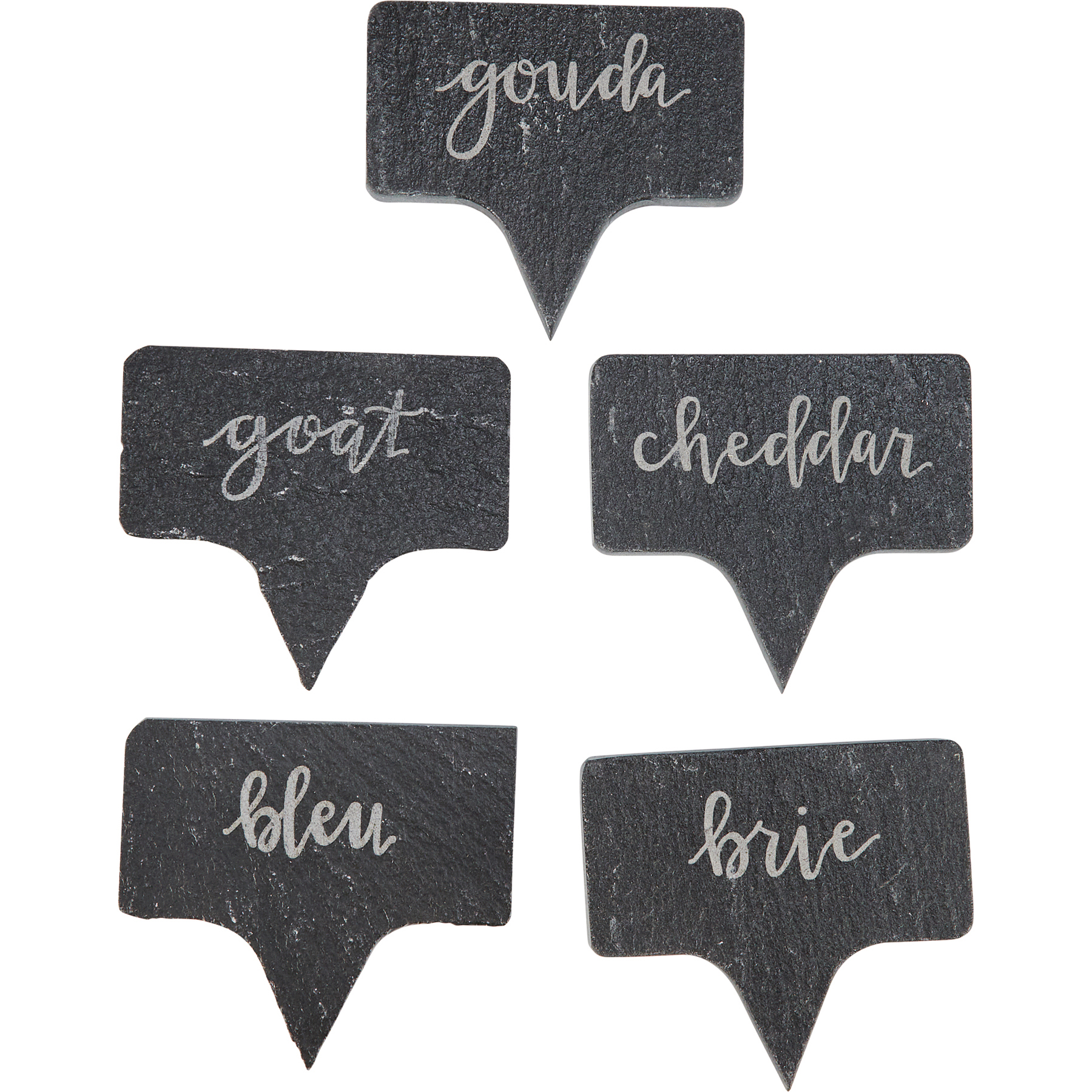 A set of five stone party picks from our Room By Room Collection displaying cheese label sentiments in a hand illustrated style. Sentiments read "Gouda - Goat - Cheddar - Bleu - Brie." Each pick also features the option to customize using chalk on blank side (chalk not included). Set is dishwasher safe for convenient cleaning. Our Cheeses party pick set comes packaged in cardboard box with acrylic lid to easily see designs and finished with cotton tape ribbon around corners. A fun everyday kitchen accessory.