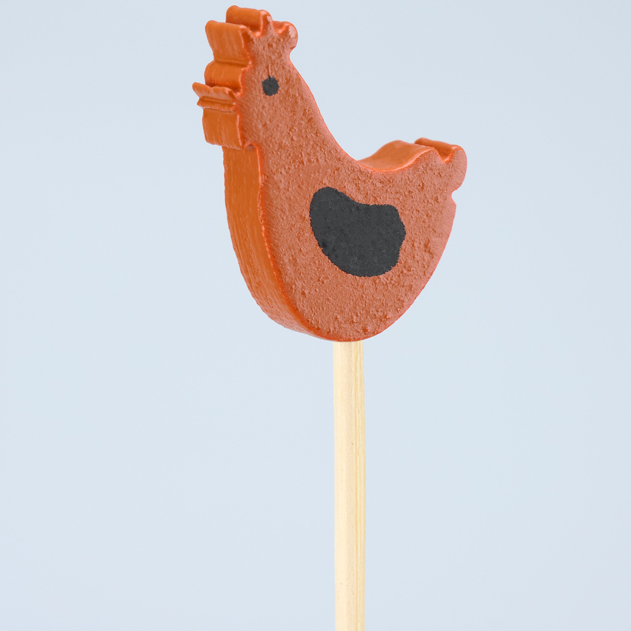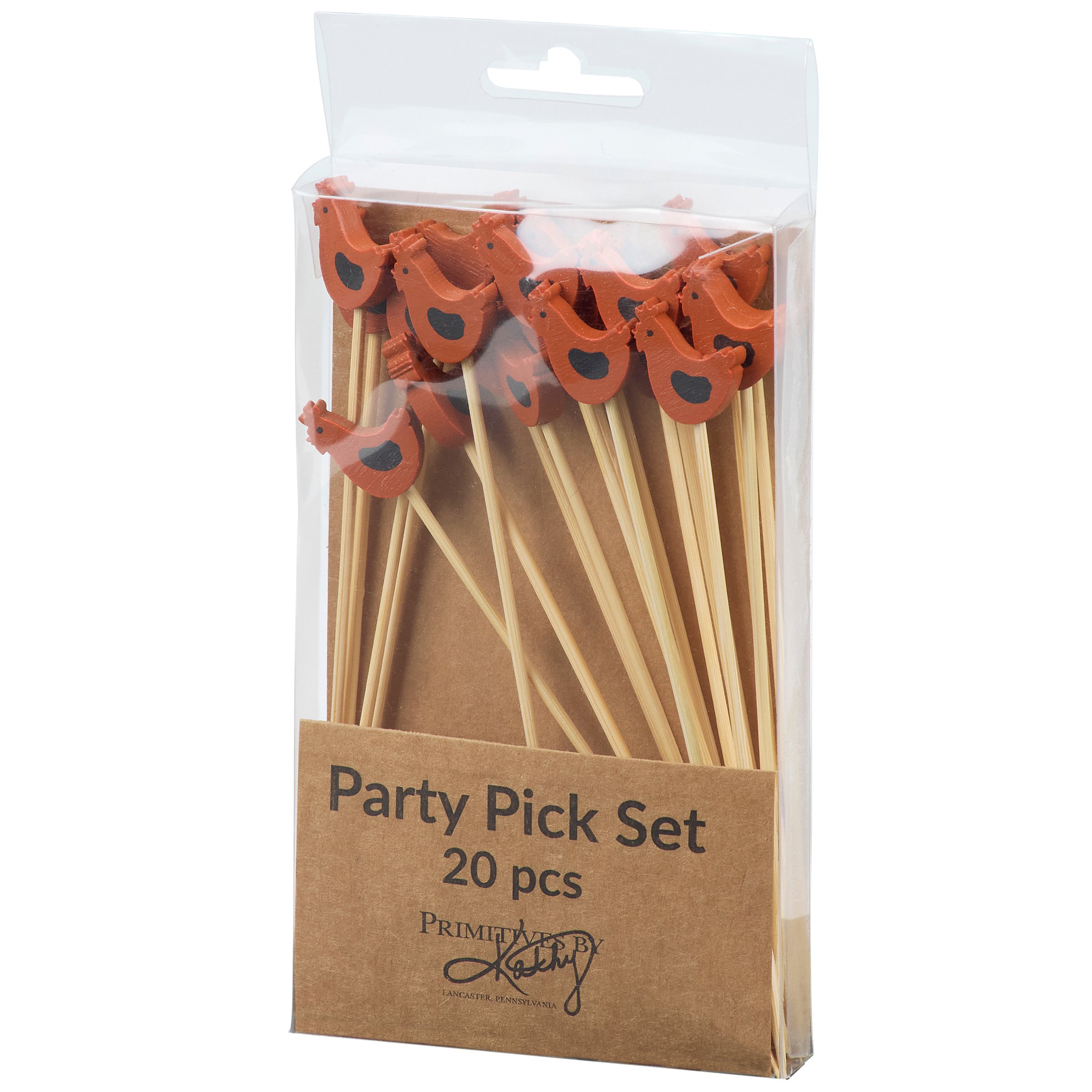 A set of party picks from our Farmhouse Collection featuring 20 long bamboo picks with chicken shaped wood pieces attached to the top displaying painted details that add farm themed charm to food displays. Our Chickens party pick set comes packaged in an acrylic box to easily see designs with a hole for hanging on store racks. A set of fun chicken inspired party accessories perfect for farm themed tablescapes.