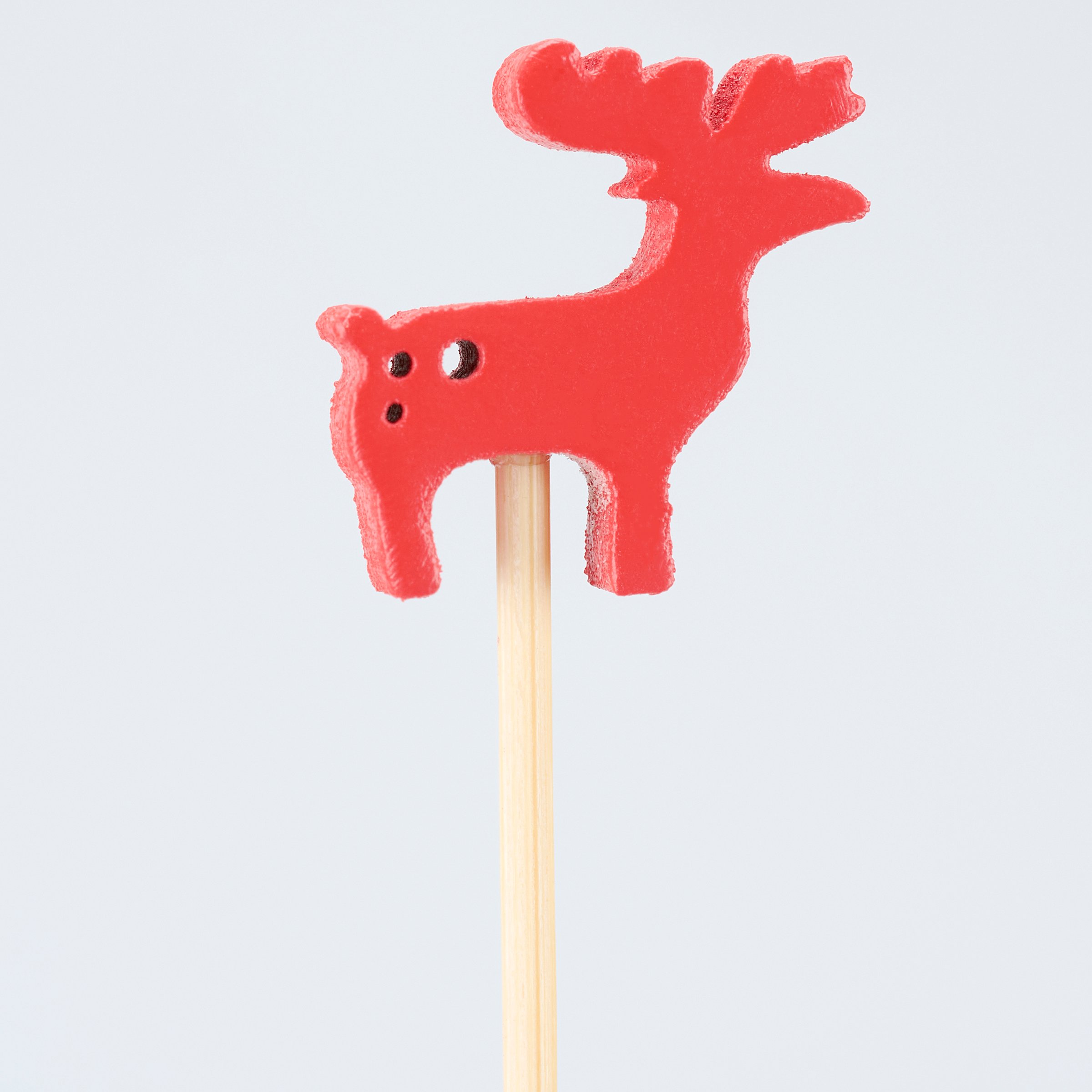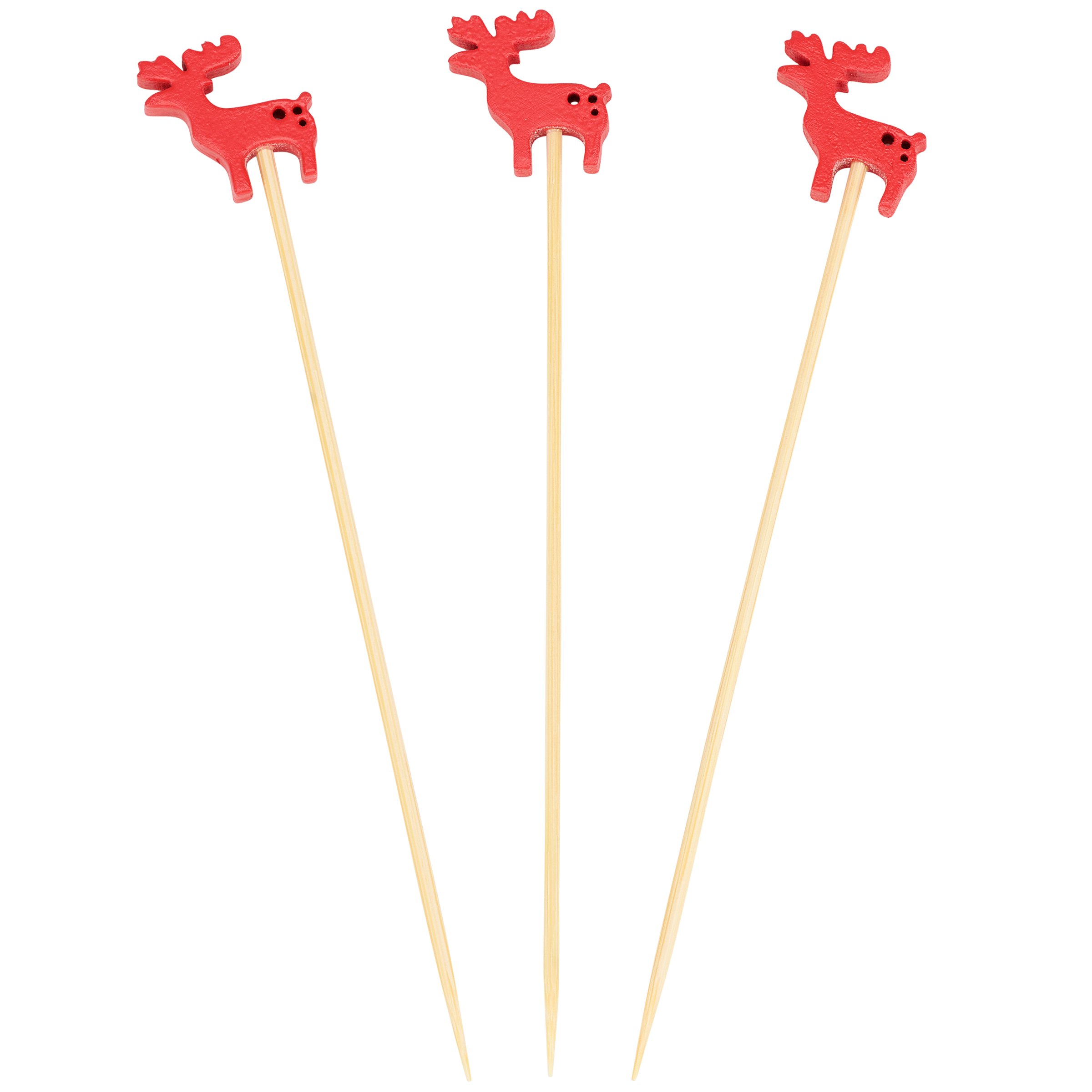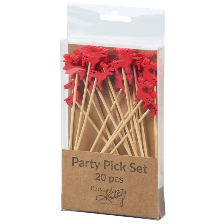 A set of party picks from our Christmas Collection featuring 20 long bamboo picks with red moose shaped wood pieces attached to the top displaying painted details that add fun seasonal style to food displays. Our Moose party pick set comes packaged in an acrylic box to easily see designs with a hole for hanging on store racks. A set of fun winter party accessories perfect for themed tablescapes.