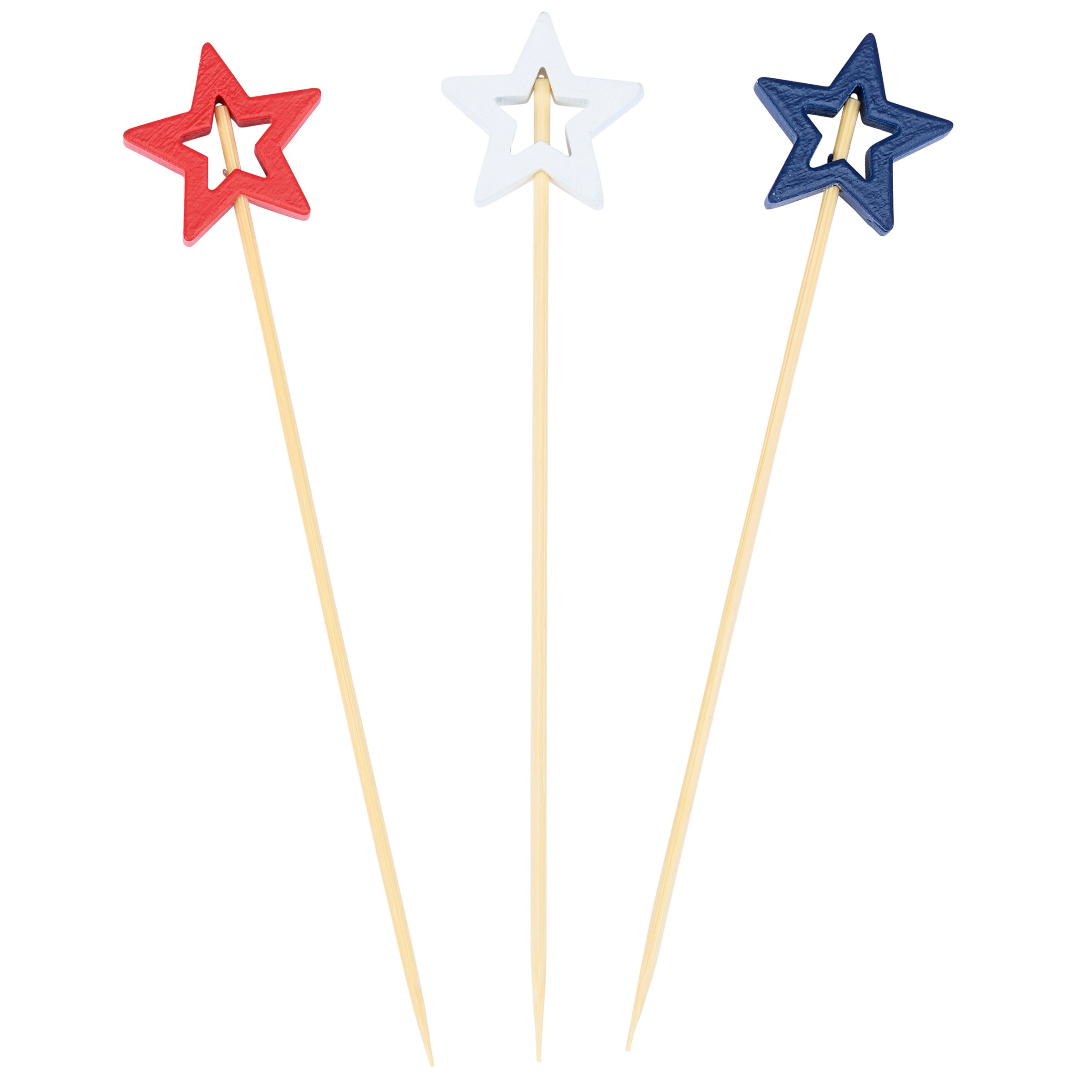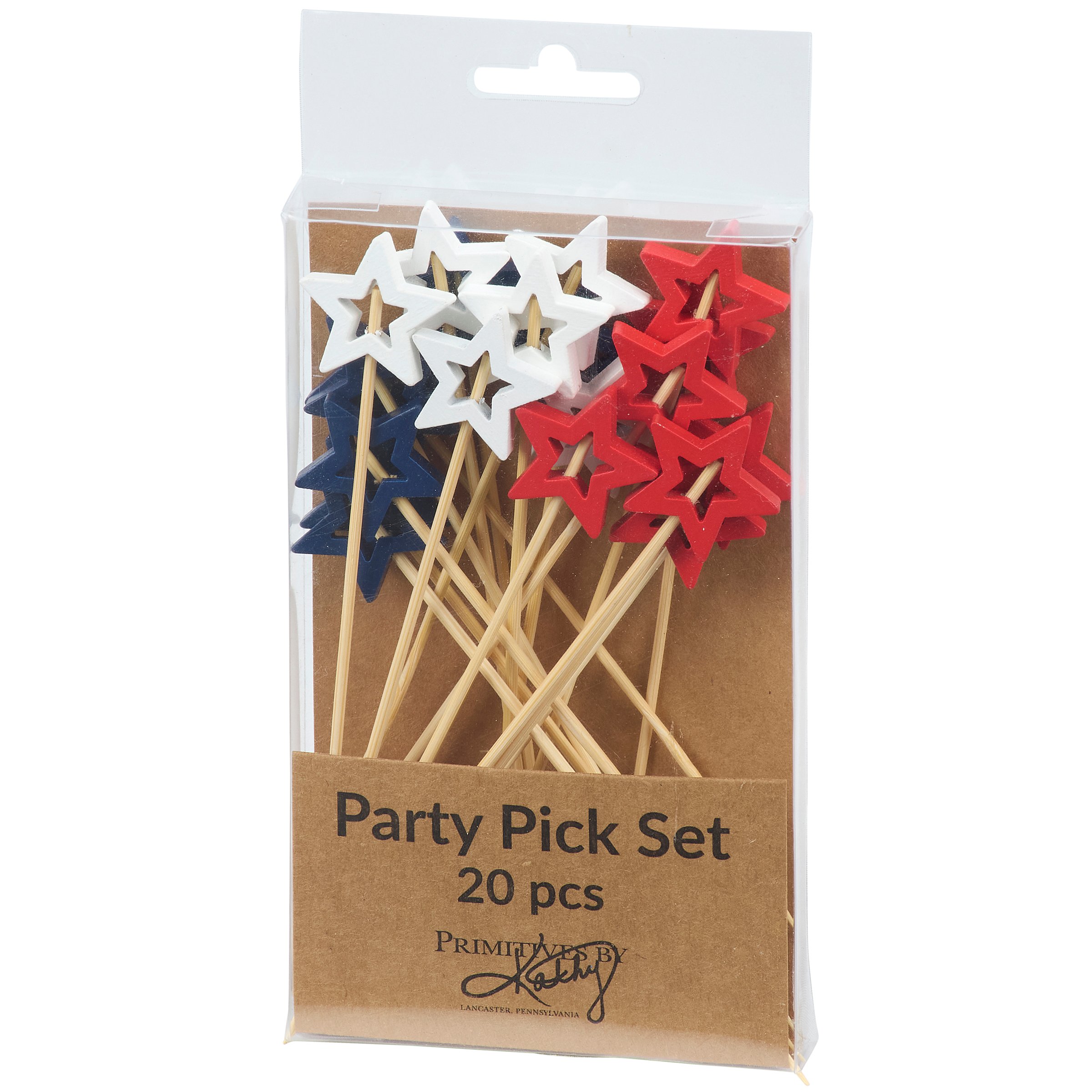 A set of party picks from our Patriotic Collection featuring 20 long bamboo picks with star shaped wood pieces attached to the top displaying a mix of red, white, and blue painted details that add patriotic charm to food displays. Our Open Stars party pick set comes packaged in an acrylic box to easily see designs with a hole for hanging on store racks. A set of fun USA inspired party accessories perfect for patriotic tablescapes.