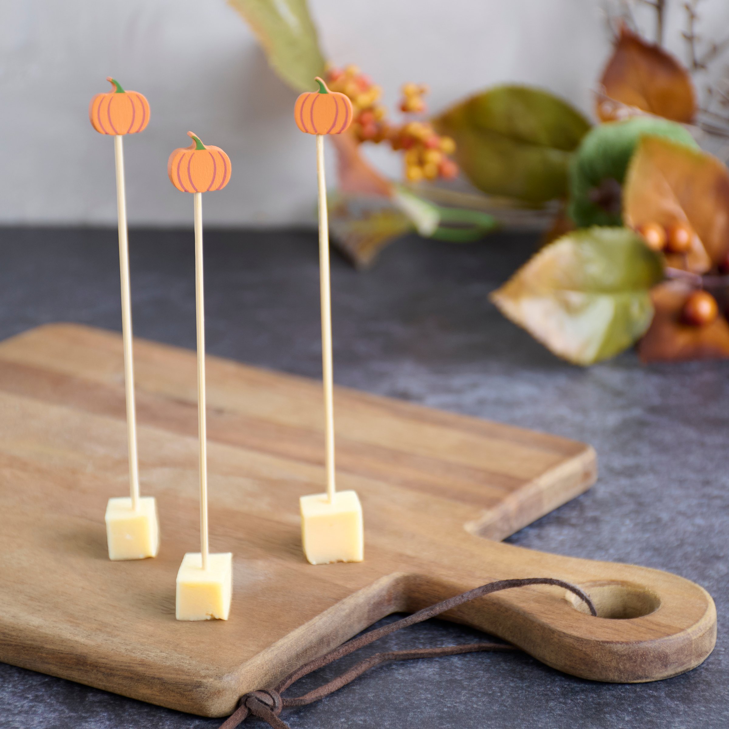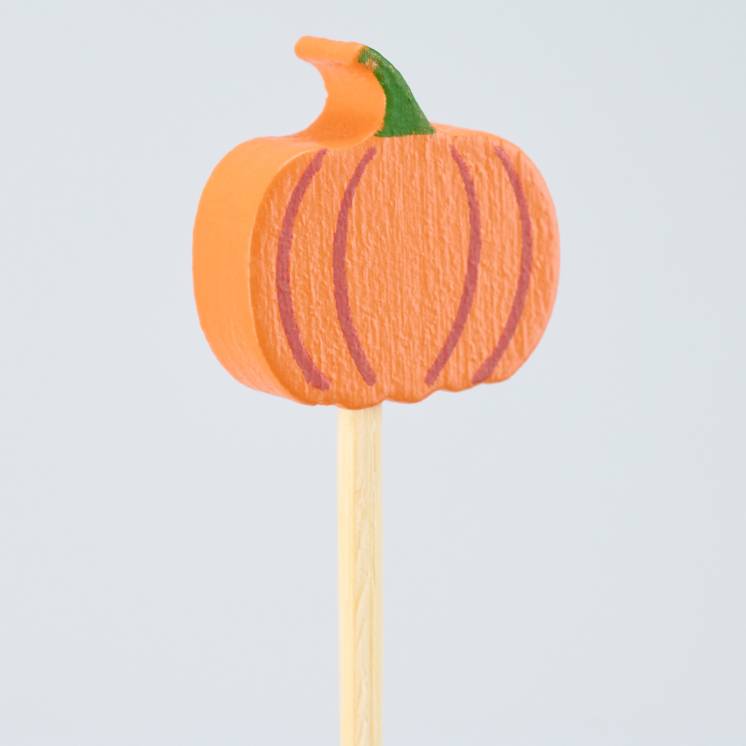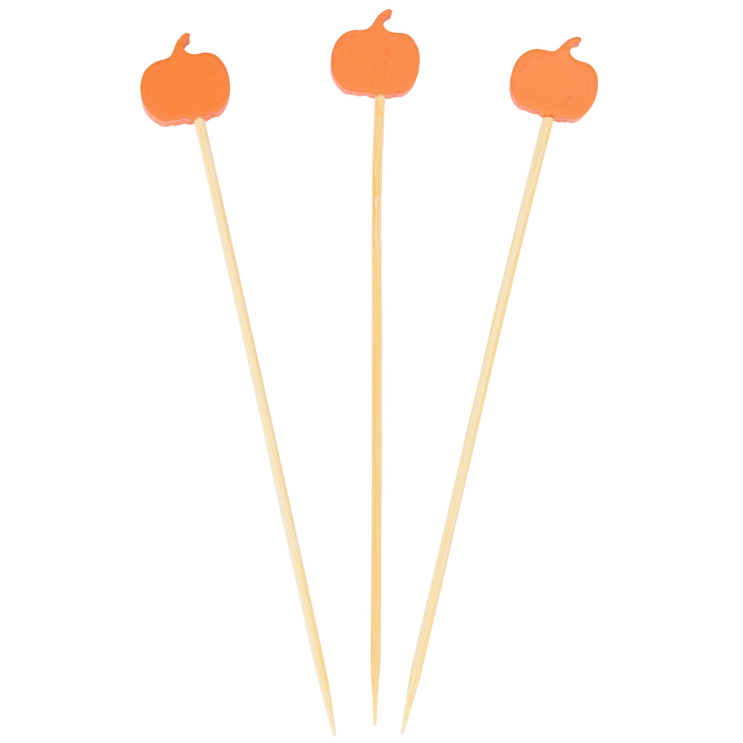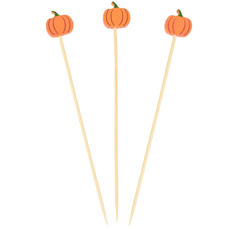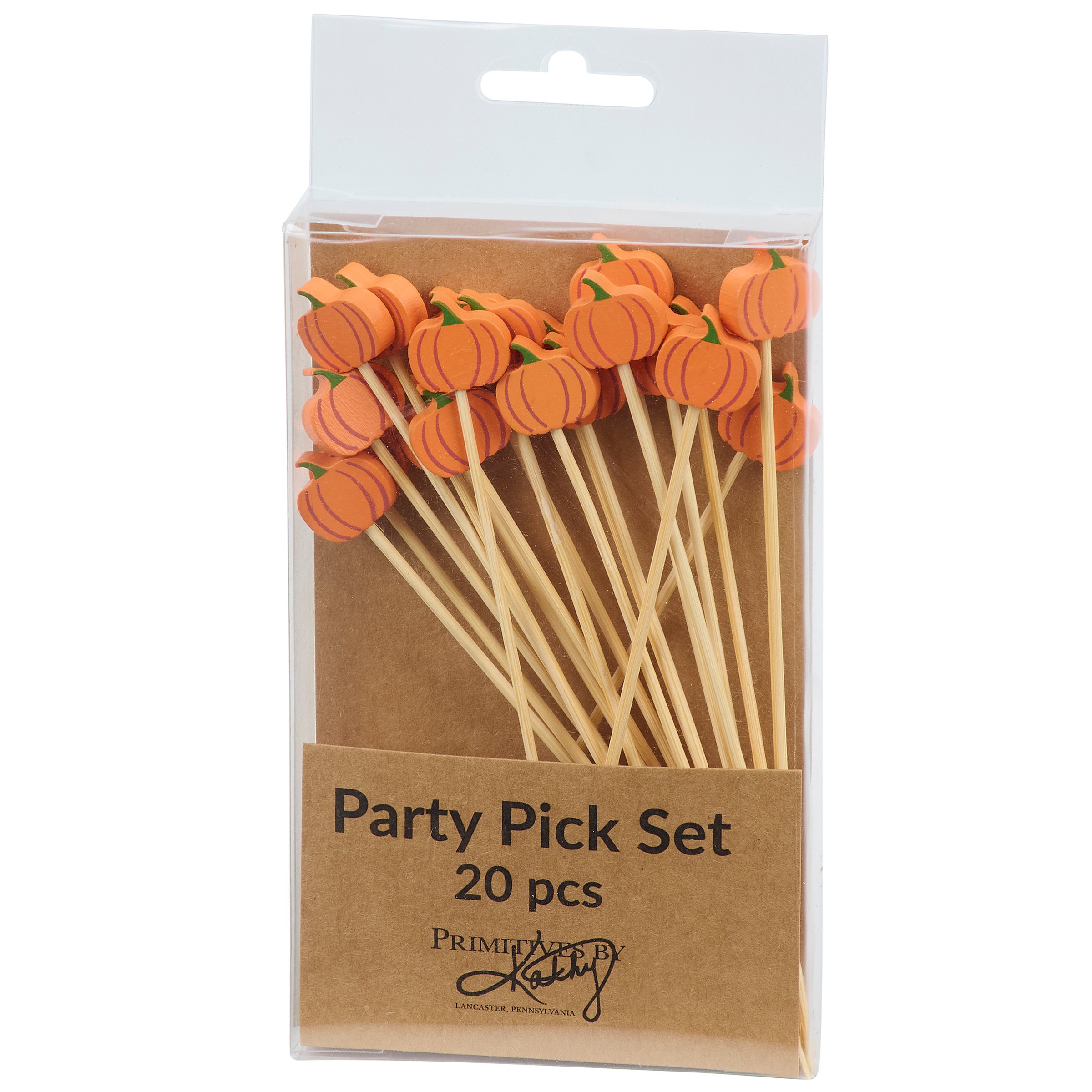 A set of party picks from our Fall & Harvest Collection featuring 20 long bamboo picks with pumpkin shaped wood pieces attached to the top displaying painted details that add fun seasonal style to food displays. Our Pumpkins party pick set comes packaged in an acrylic box to easily see designs with a hole for hanging on store racks. A set of fun fall party accessories perfect for themed tablescapes.