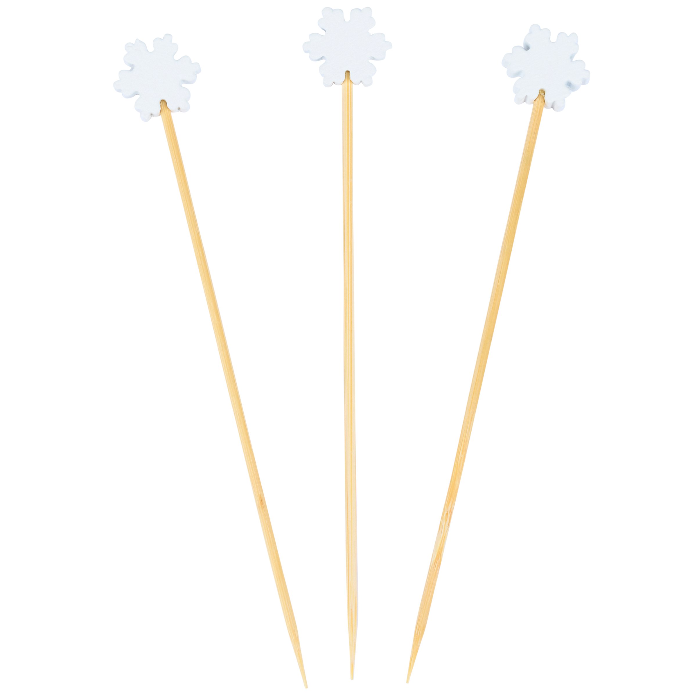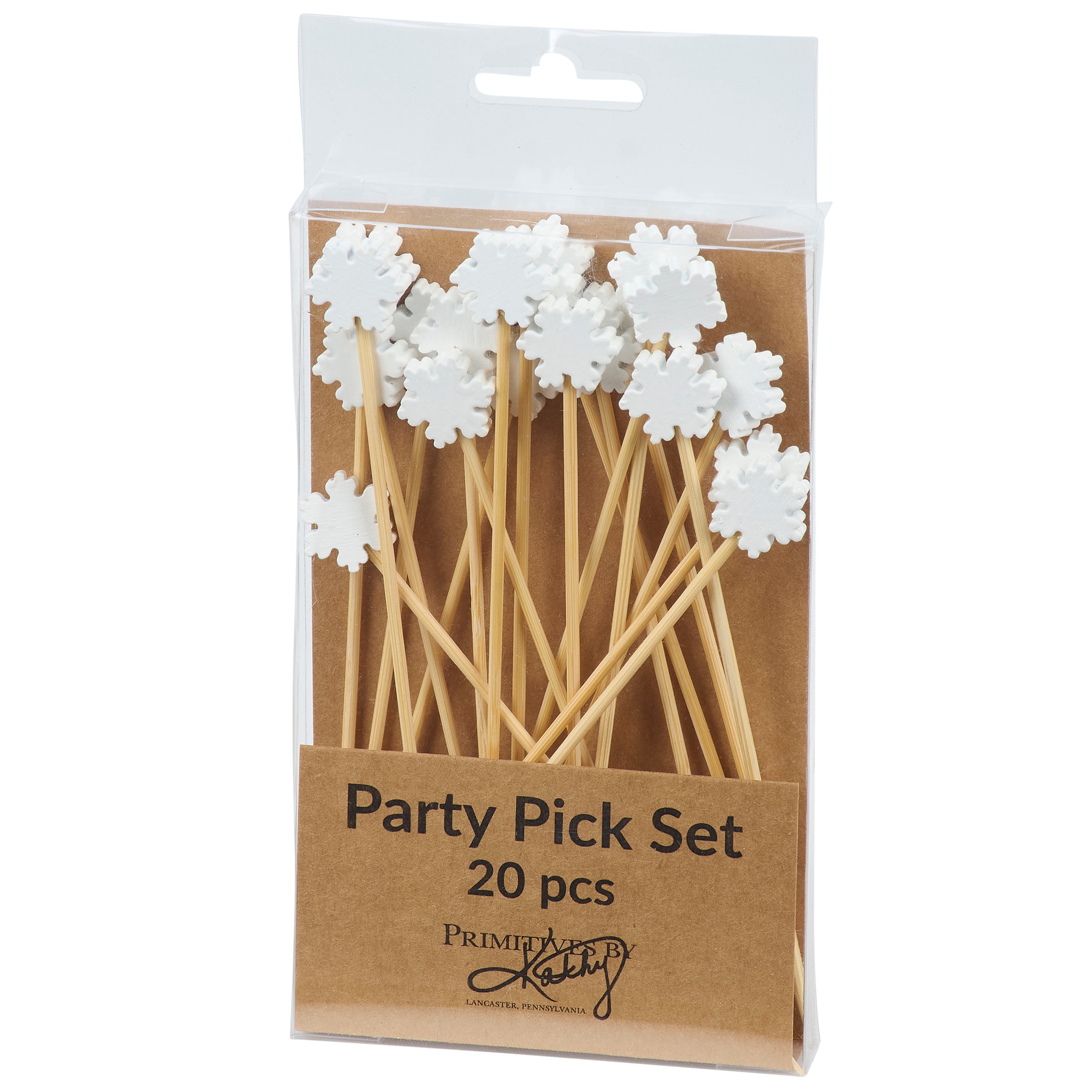 A set of party picks from our Christmas Collection featuring 20 long bamboo picks with white snowflake shaped wood pieces attached to the top that add fun seasonal style to food displays. Our Snowflakes party pick set comes packaged in an acrylic box to easily see designs with a hole for hanging on store racks. A set of fun Christmas party accessories perfect for themed tablescapes.