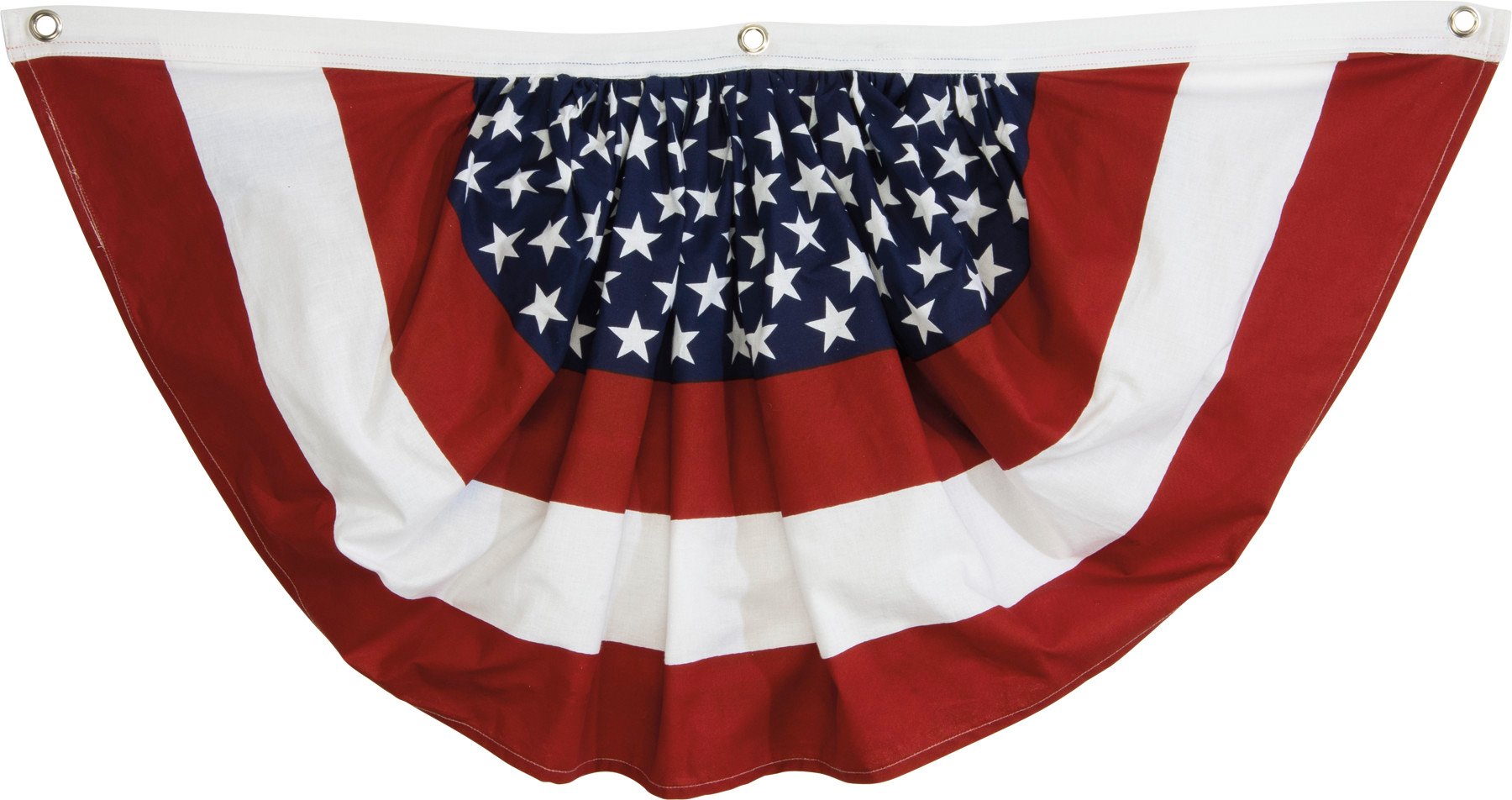 Perfect for displaying all year round, our fabric patriotic bunting from our Patriotic Collection coordinates well with seasonal or everyday home décor adding a patriotic flair to any space. Our patriotic bunting is easy to hang using the metal grommets along the top. Hang as a stand-alone statement or use multiple patriotic buntings on house or along a table for a bold Independence Day display. The top of patriotic bunting measures 36 inches across for plenty of coverage. A patriotic everyday home accent with a variety of display options.