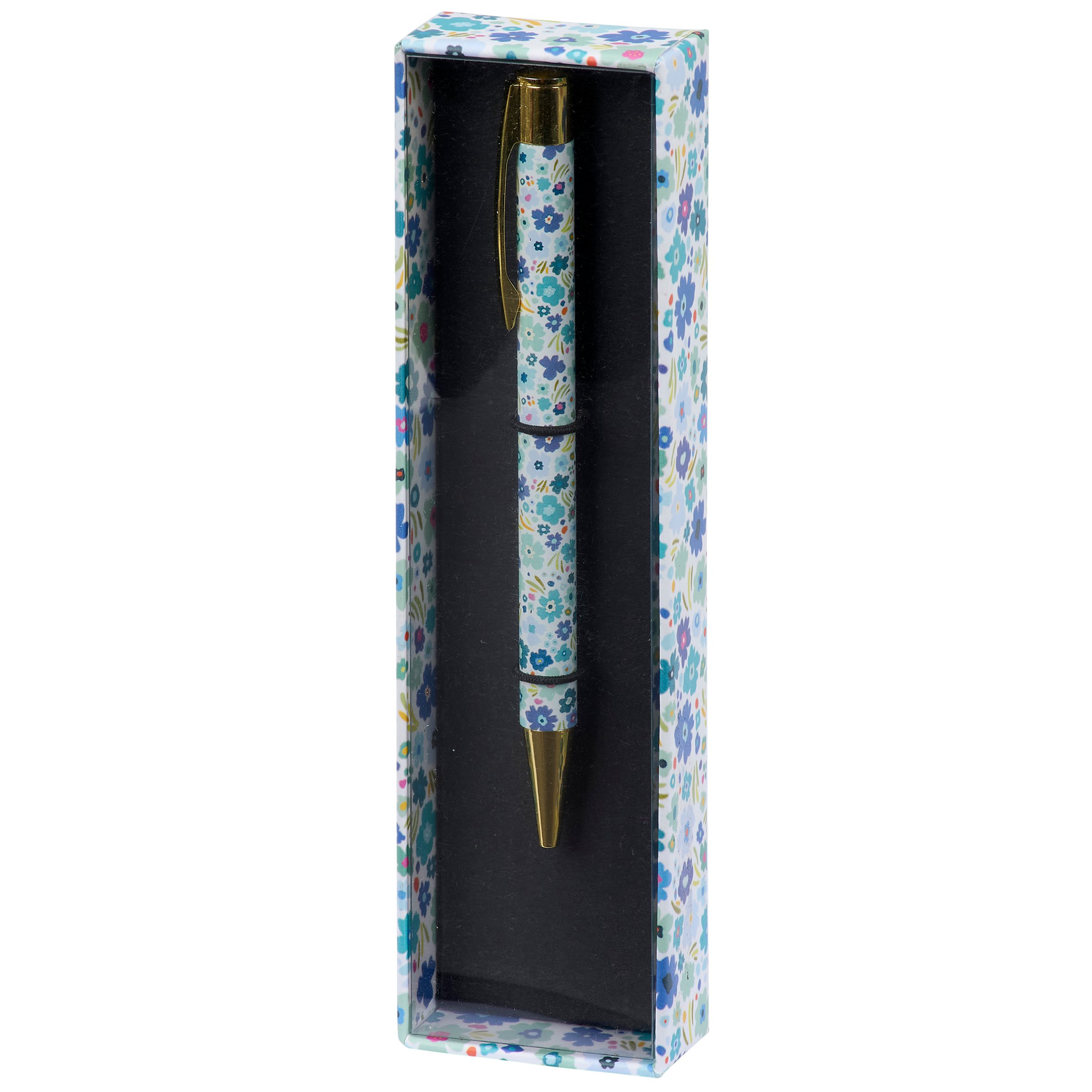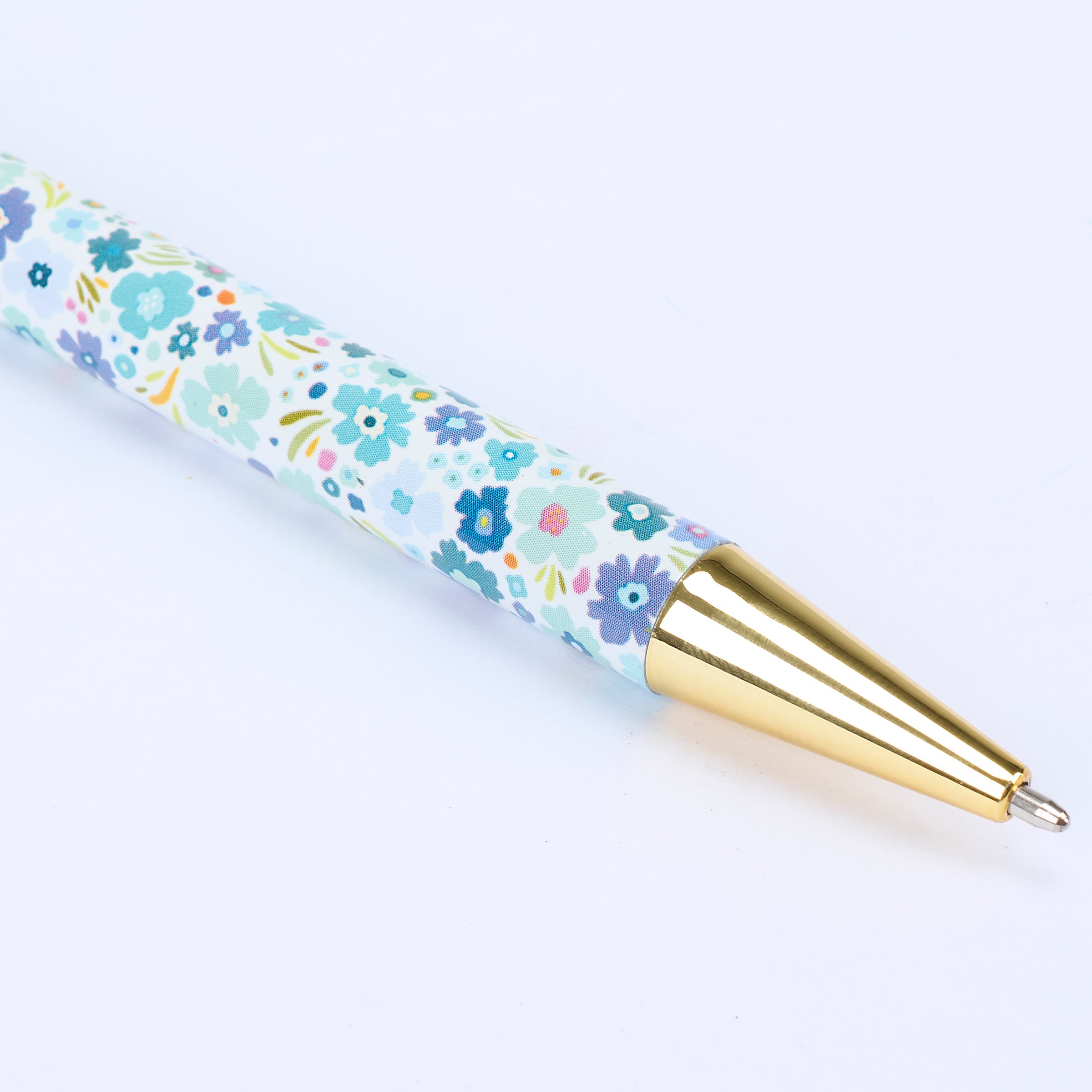 A metal pen from our Inspiration & Blooms Collection featuring a full wrap-around design of florals in a cool blue color palette replicated from original hand illustrated artwork with gold accents on each end. This stylish floral pen also features a clip that rotates to reveal and retract pen point with black ink. Our Blue Floral pen is packaged in a decorative box displaying matching pattern with acrylic lid to easily view pen making it great for gifting and store display. A stylish gift perfect for everyday moments.