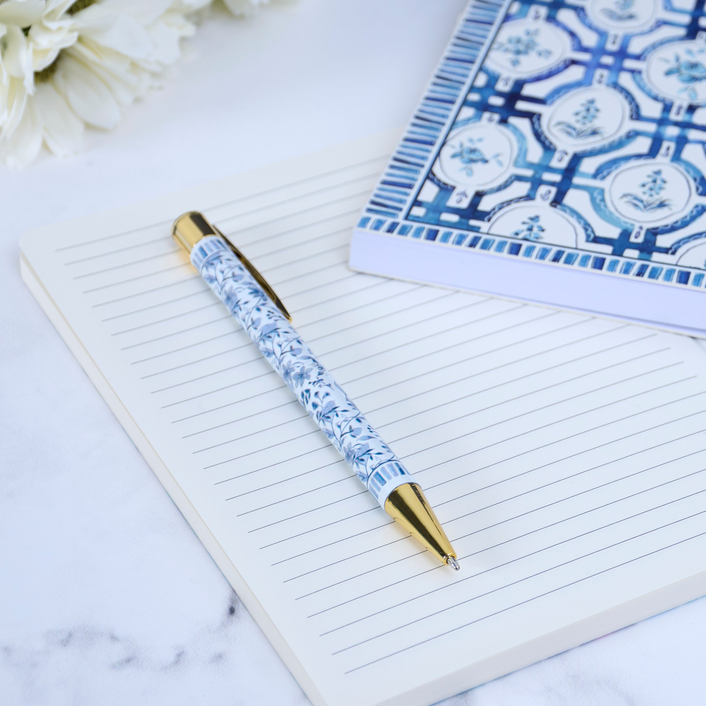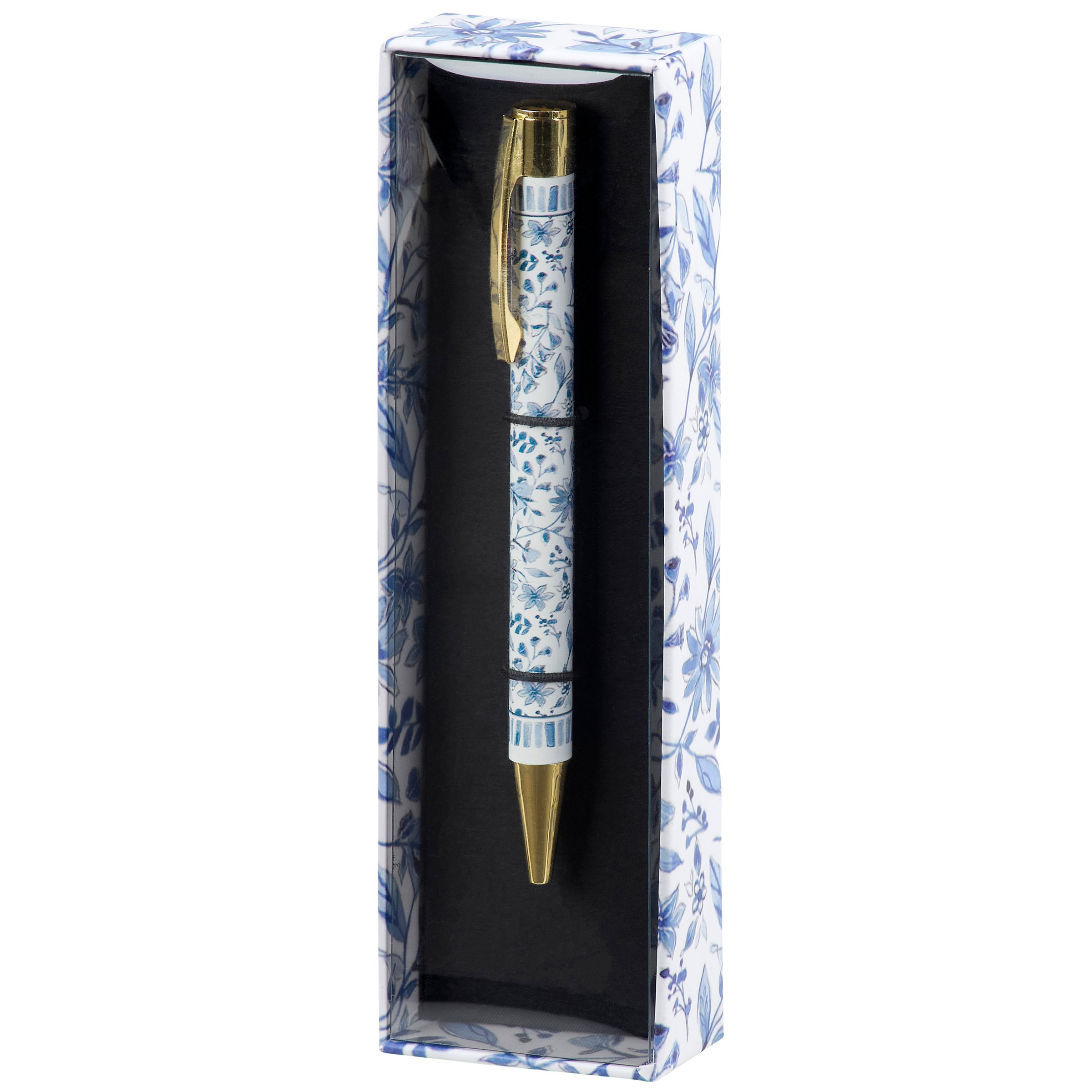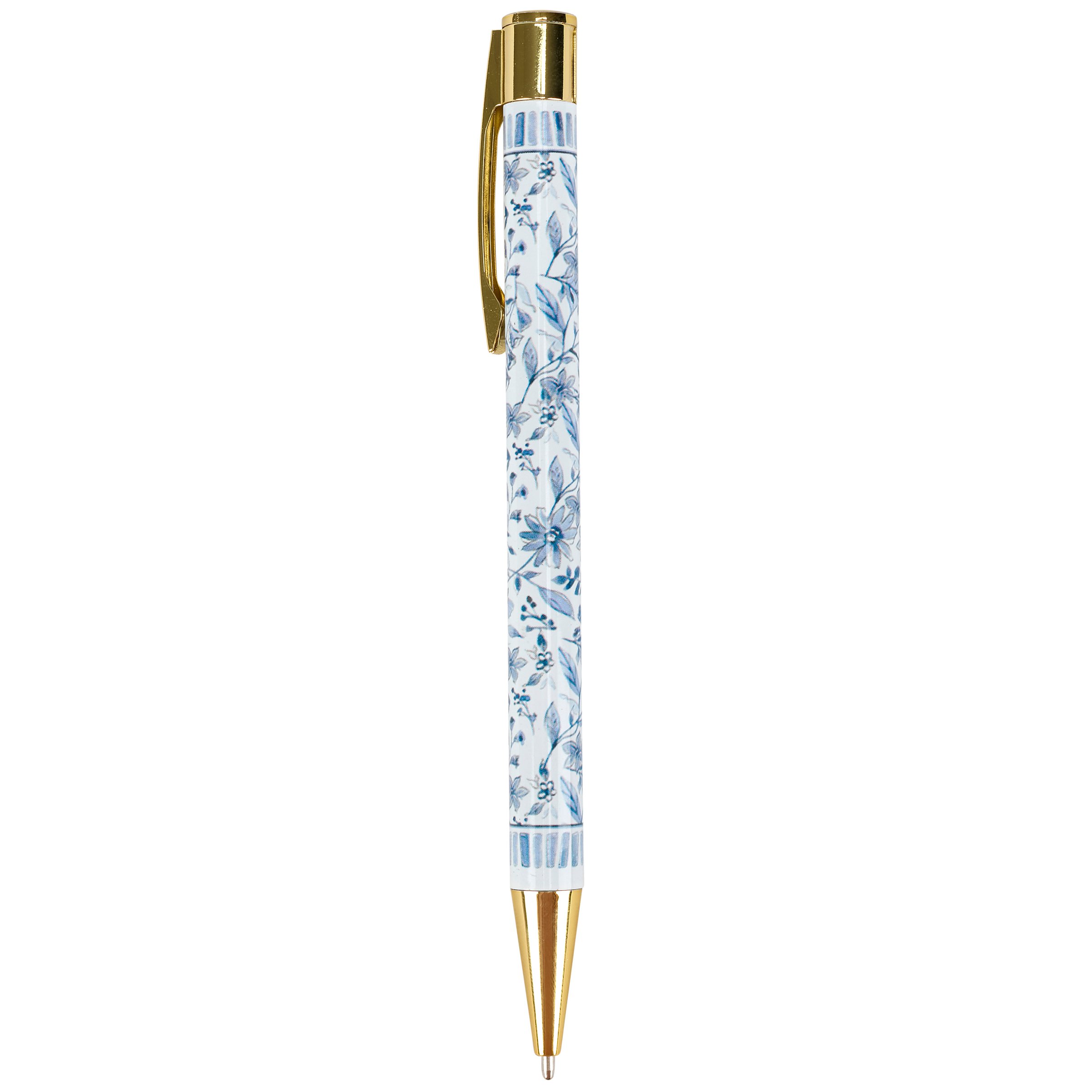 A metal pen from our Home Collection featuring a full wrap-around design of florals in a calming indigo blue color palette replicated from original hand painted watercolor art with gold accents on each end. This indigo floral pen also features a clip that rotates to reveal and retract pen point with black ink. Our Indigo Blue Florals pen is packaged in a decorative box displaying matching pattern with acrylic lid to easily view pen making it great for gifting and store display. A stylish gift perfect for everyday moments.