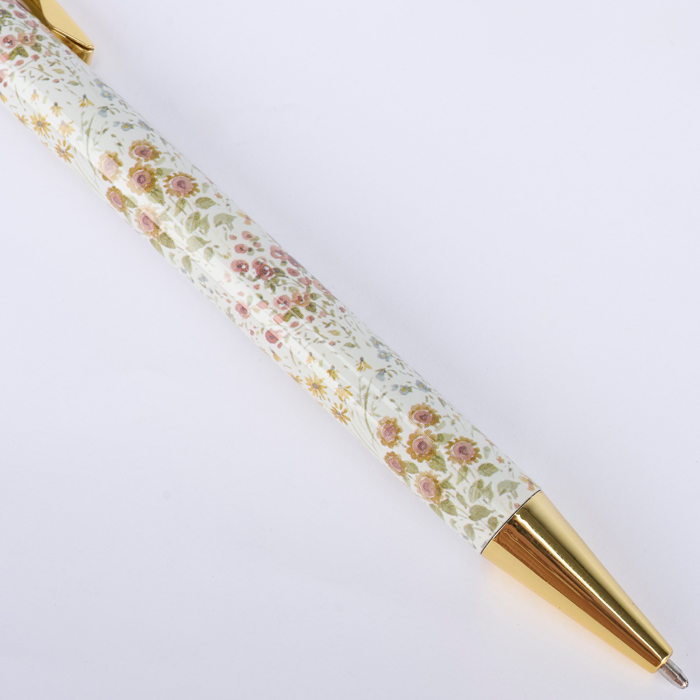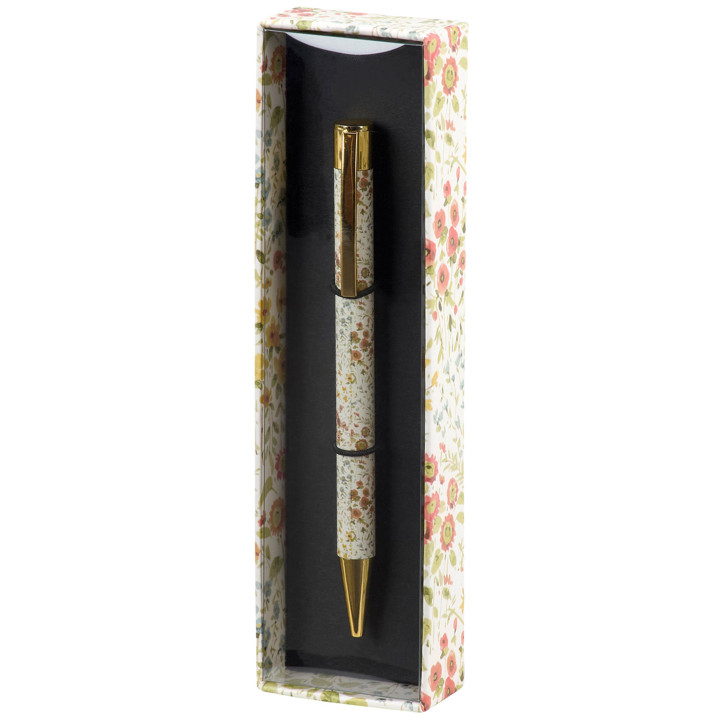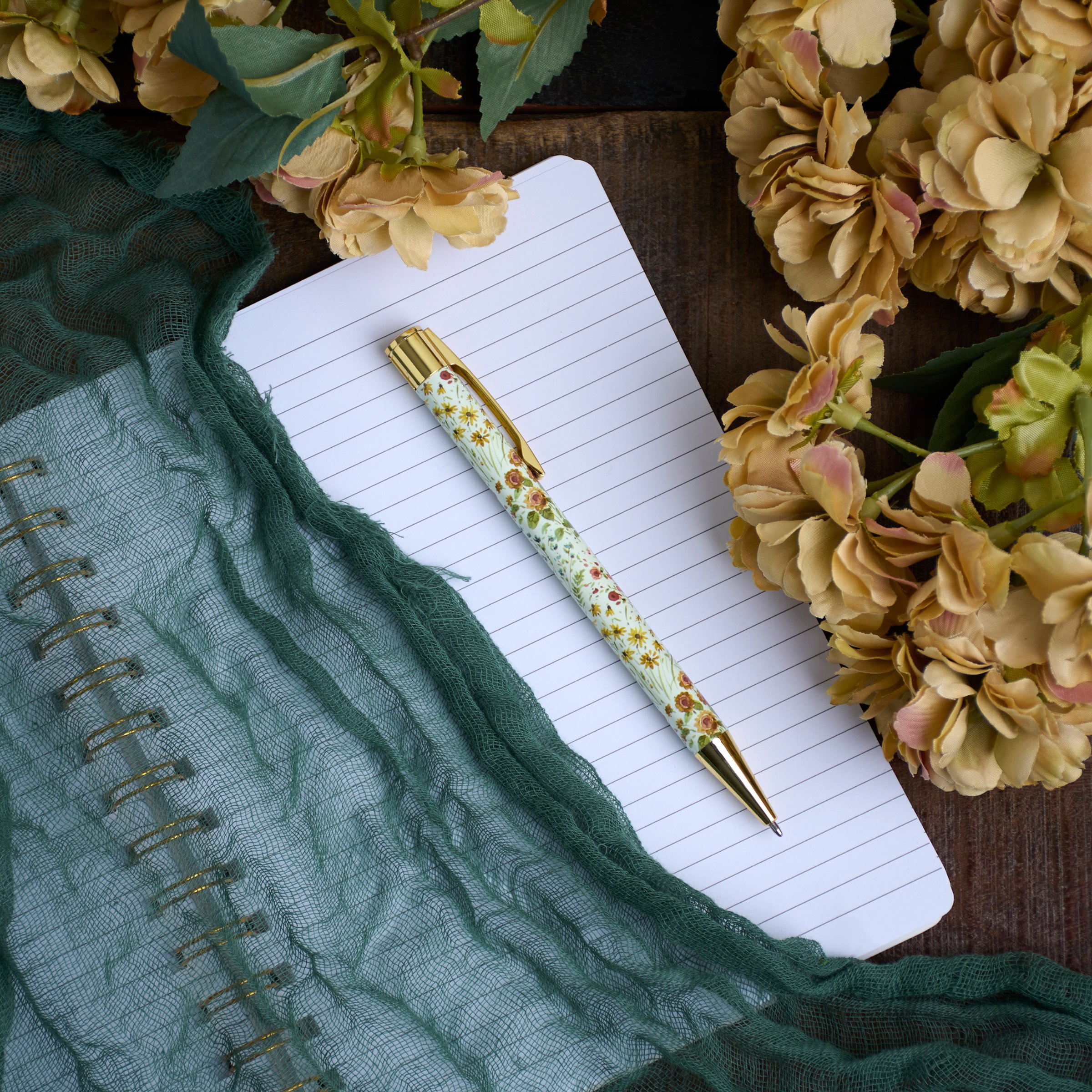 A metal pen from our Fall & Harvest Collection featuring a full wrap-around design displaying a pattern of fall wildflowers replicated from original hand painted watercolor art with gold accents on each end. This fall wildflower pen also features a clip that rotates to reveal and retract the pen point with black ink. Our Fall Wildflowers pen is packaged in a decorative box displaying a matching design with acrylic lid to easily view pen making it great for gifting and store display. A fall themed gift perfect for seasonal moments.