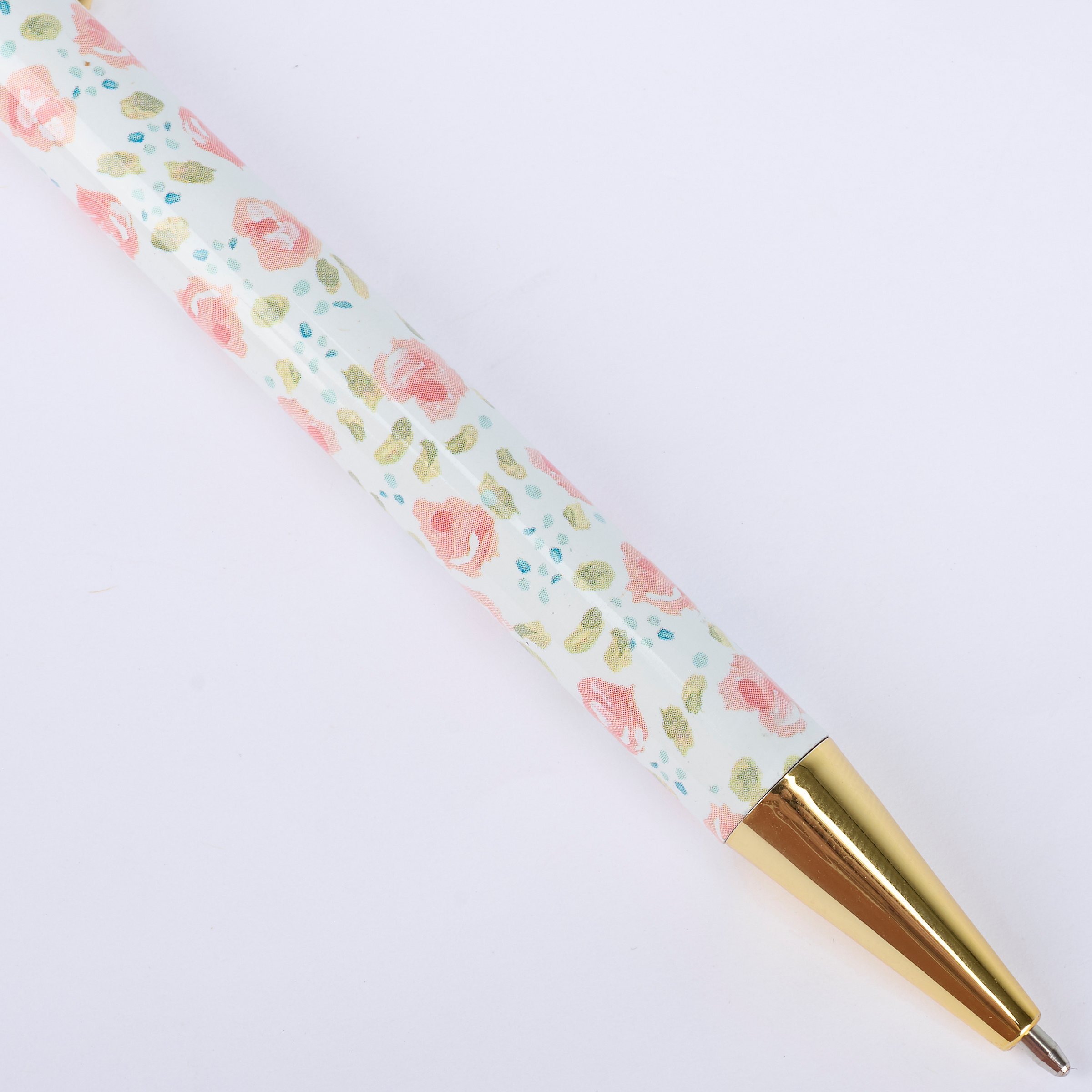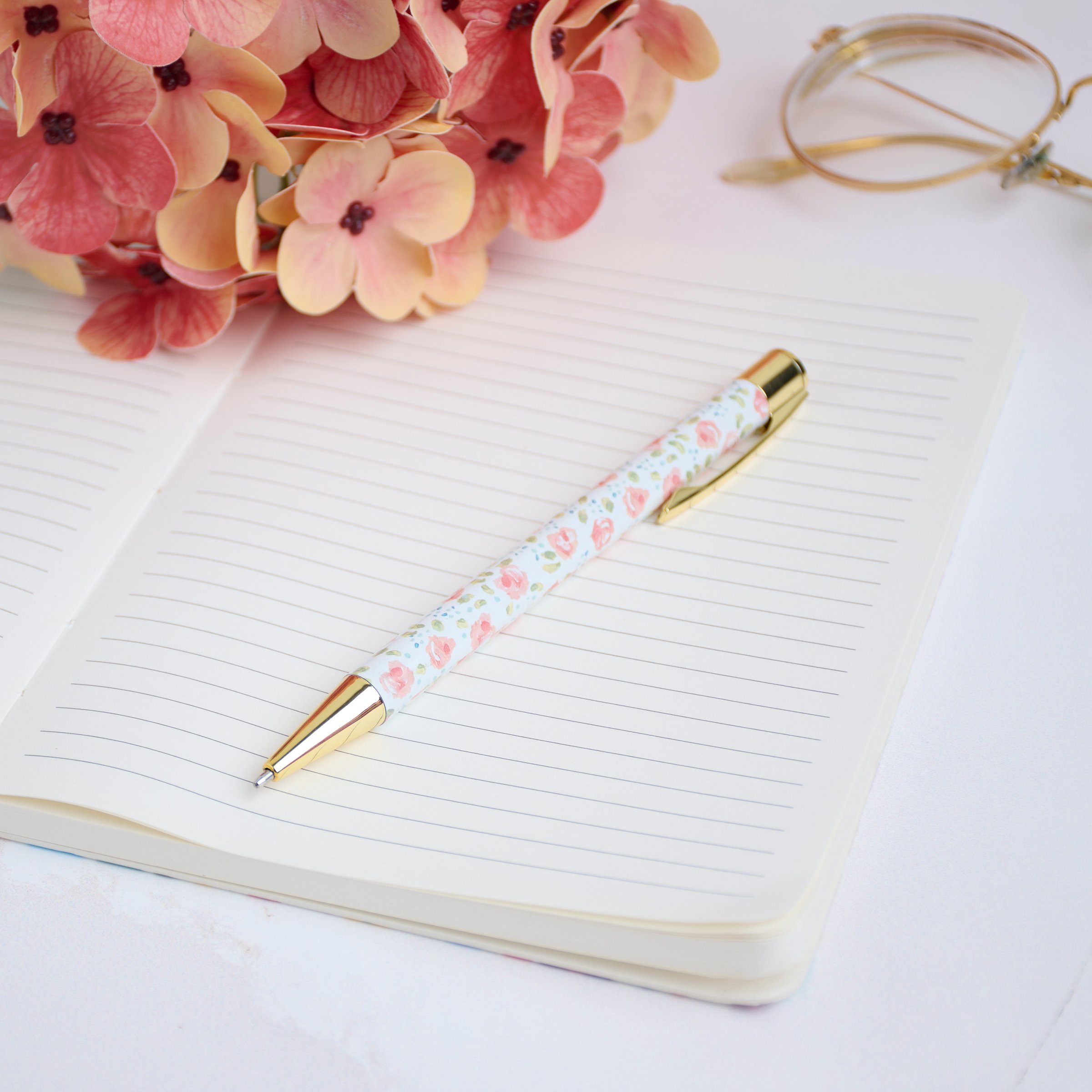 A metal pen from our Watercolor Collection featuring a full wrap-around design of pink roses replicated from original hand painted watercolor art with gold accents on each end. This stylish pen also features a clip that rotates to reveal and retract pen point with black ink. Our Pink Rose pen is packaged in a decorative box displaying matching pattern with acrylic lid to easily view pen making it great for gifting and store display. A stylish gift perfect for everyday moments.