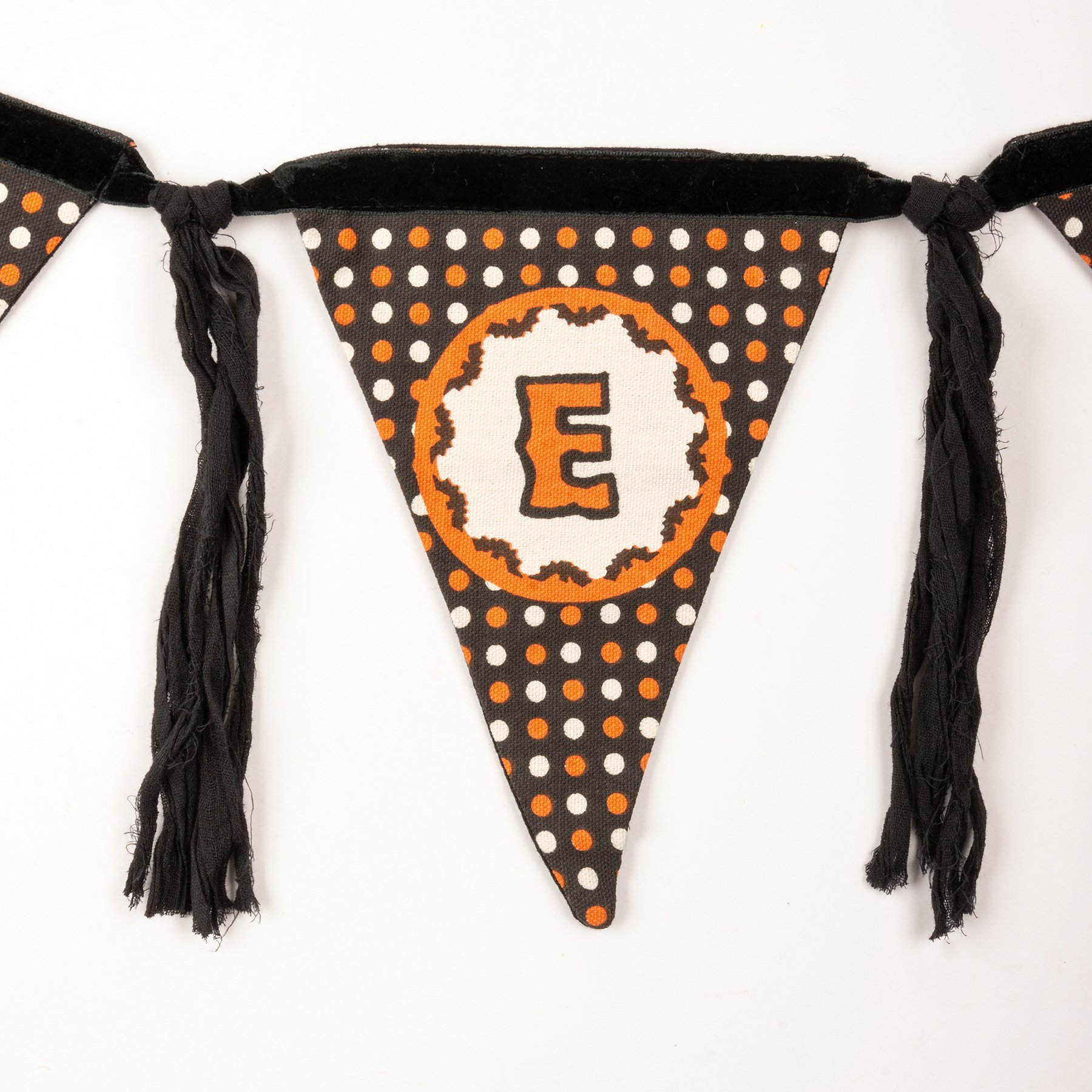 A vintage-inspired fabric pennant garland from our Halloween Collection featuring a "Beware" sentiment with patterned background, cat designs, and strips of distressed fabric streamers.