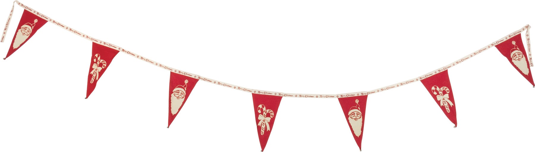 A fabric pennant garland for the holidays featuring alternating Santa Claus and candy cane designs with top replicated "Merry Christmas" trim sentiments.