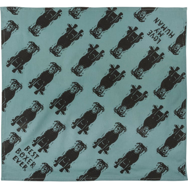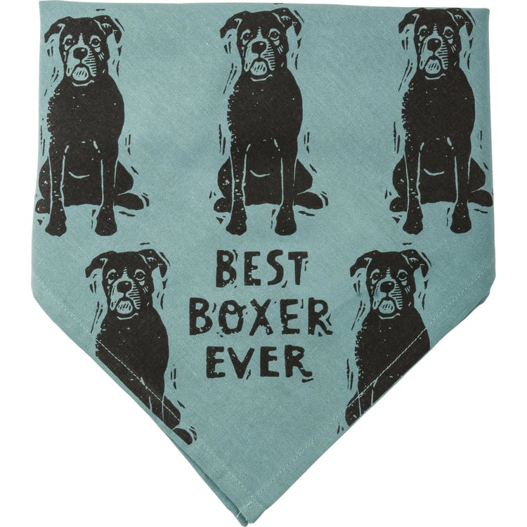 A large reversible pet bandana from our Pet Collection featuring "Best Boxer Ever" and "Love My Human" sentiments on opposite corners with an all-over block print boxer design. Bandana is made of cotton and is machine-washable. Best Boxer Ever pet bandana coordinates with our Love My Boxer Baseball Cap for matching dog and owner outfits.