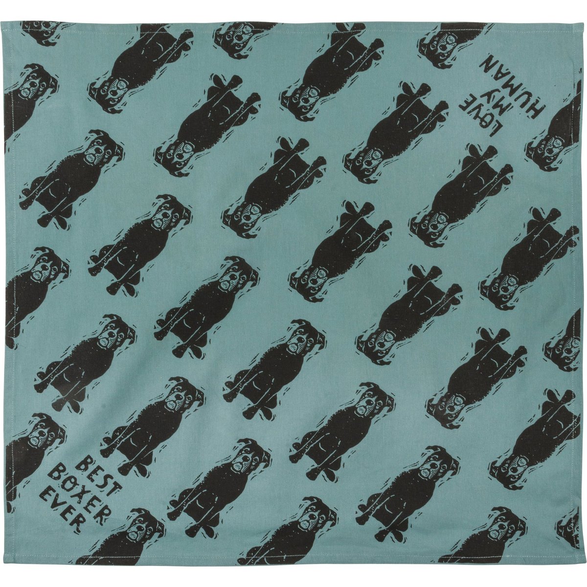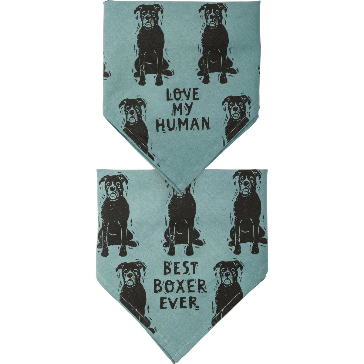 A large reversible pet bandana from our Pet Collection featuring "Best Boxer Ever" and "Love My Human" sentiments on opposite corners with an all-over block print boxer design. Bandana is made of cotton and is machine-washable. Best Boxer Ever pet bandana coordinates with our Love My Boxer Baseball Cap for matching dog and owner outfits.