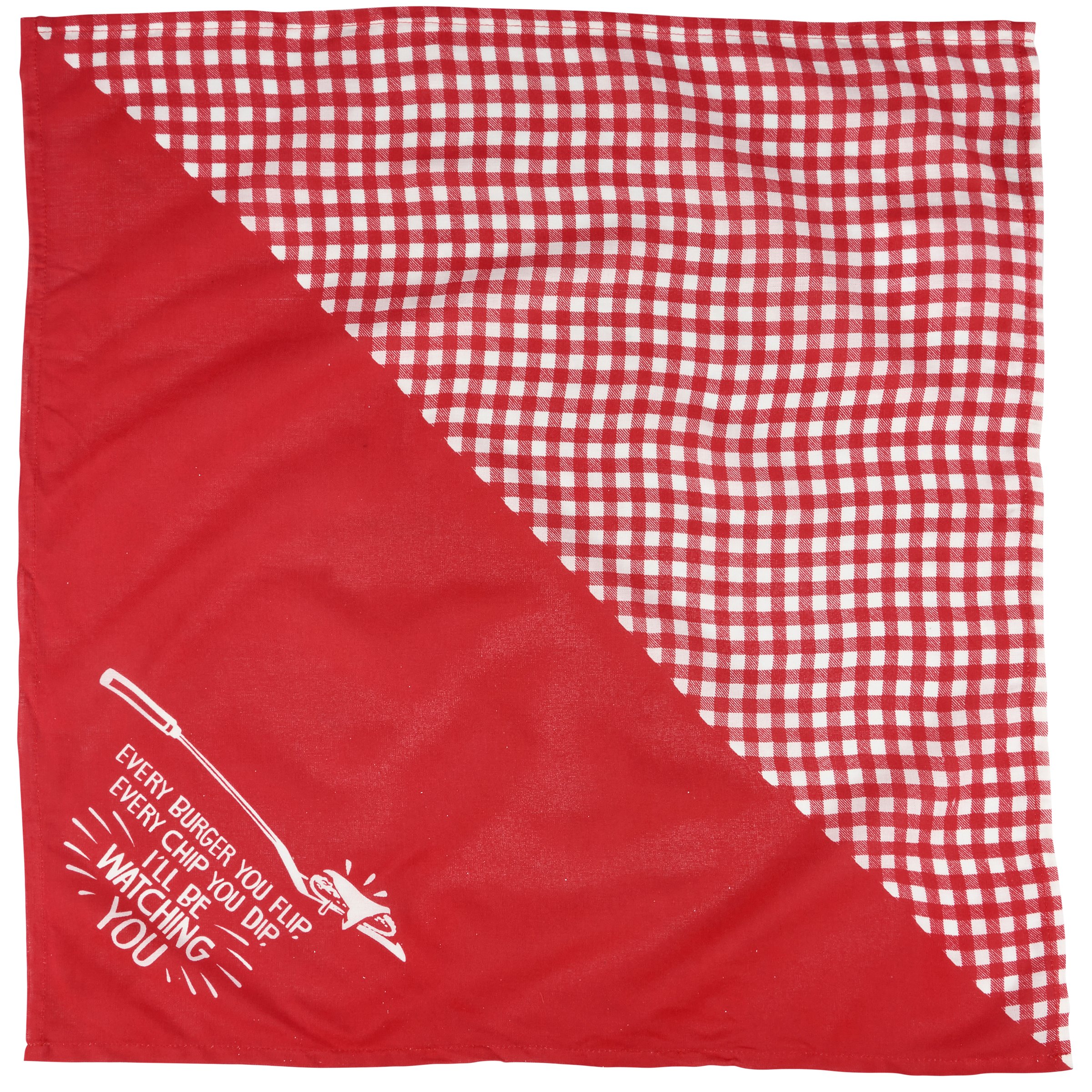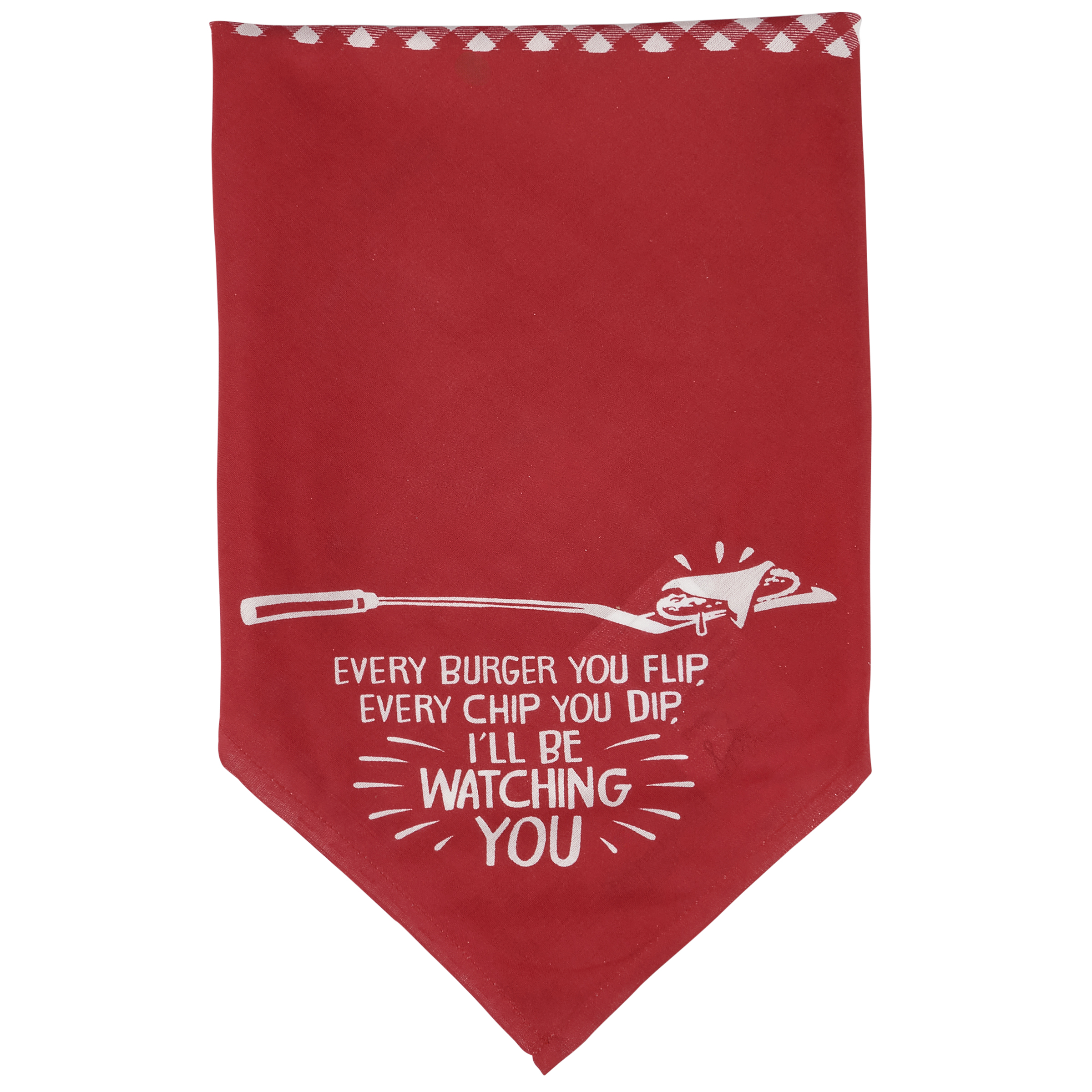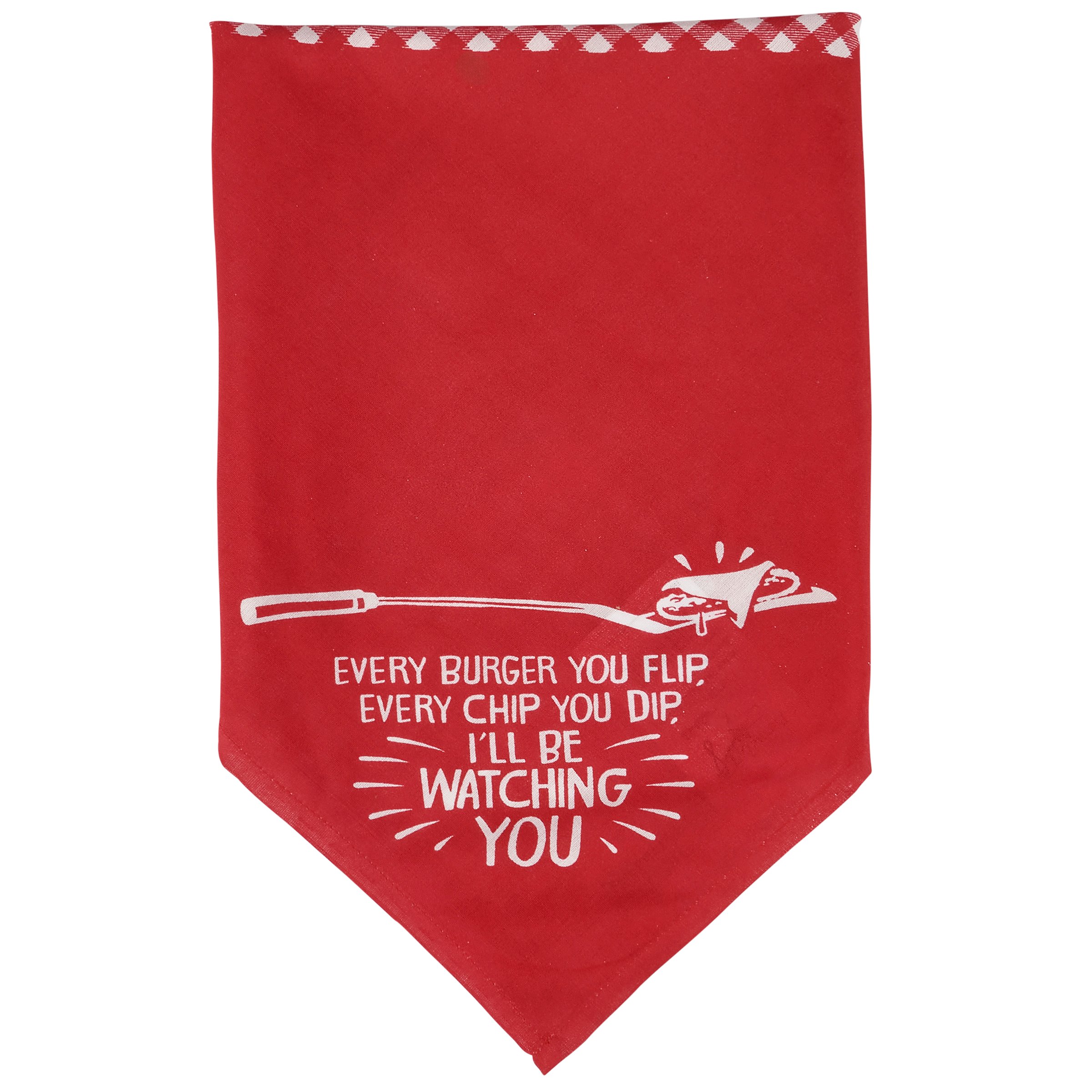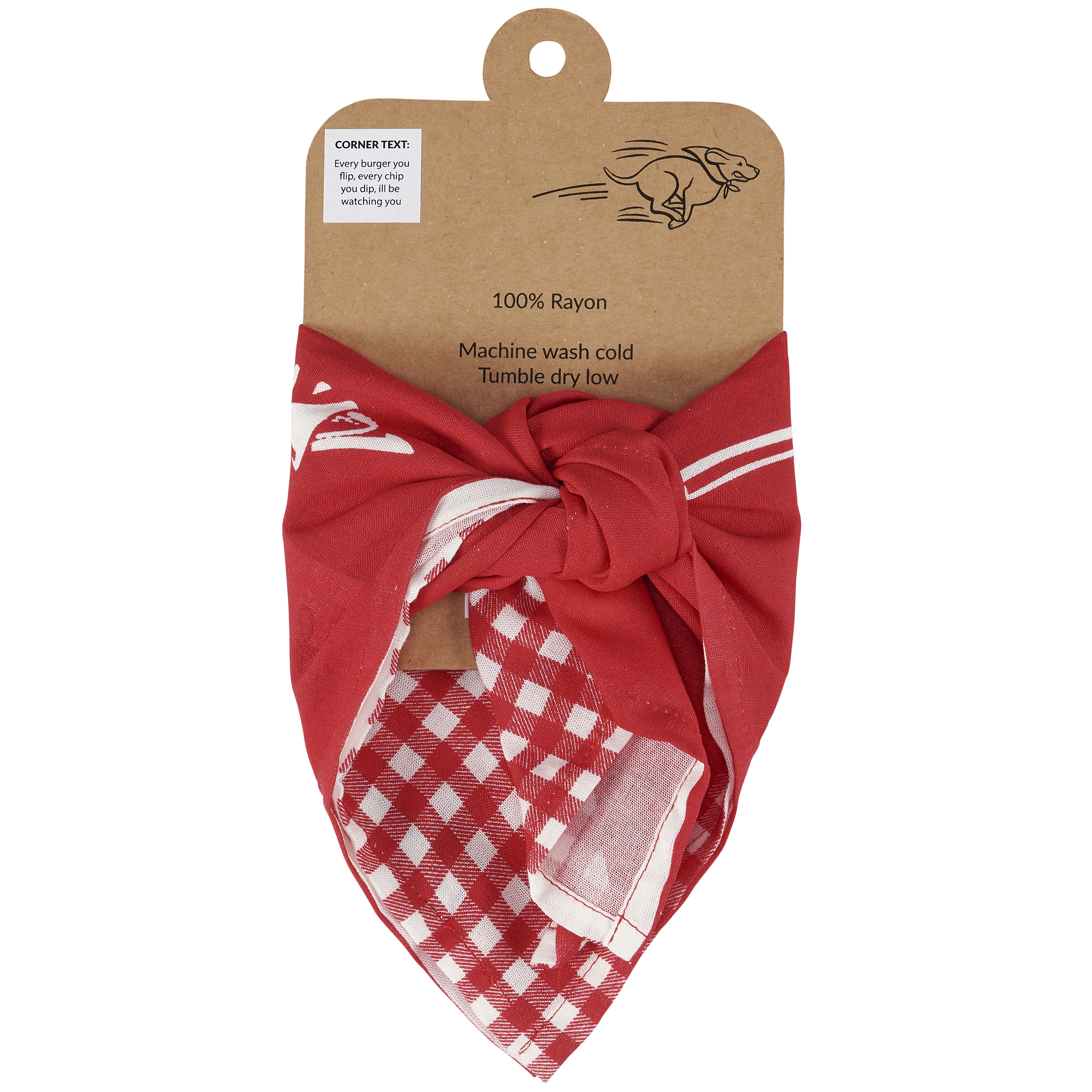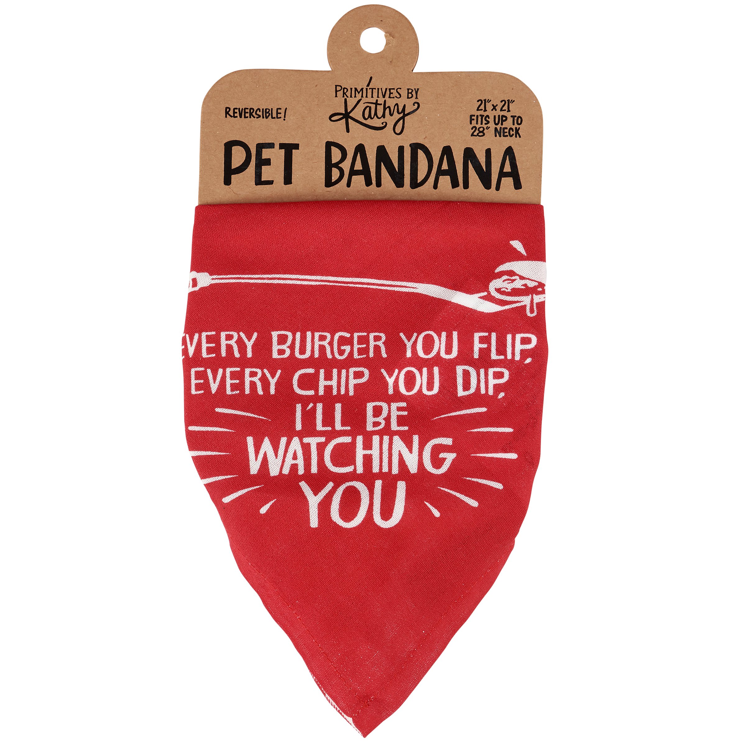 A large reversible pet bandana from our Pet Collection displaying hand illustrated grilling-themed designs on opposite corners for multiple fun style options. Designs include spatula and burger patty with fun food-themed sentiment that reads "Every Burger You Flip, Every Chip You Dip, I'll Be Watching You" on one corner and red check pattern on the other corner. Bandana features soft rayon material to resist dirt. Our large Every Burger pet bandana is machine-washable for convenient cleaning. Packaged on a cardboard backer with hole to easily display on rack and wash instructions on the back. A stylish grilling-themed accessory perfect for any furry family member. Large size fits up to a 28 inch neck.