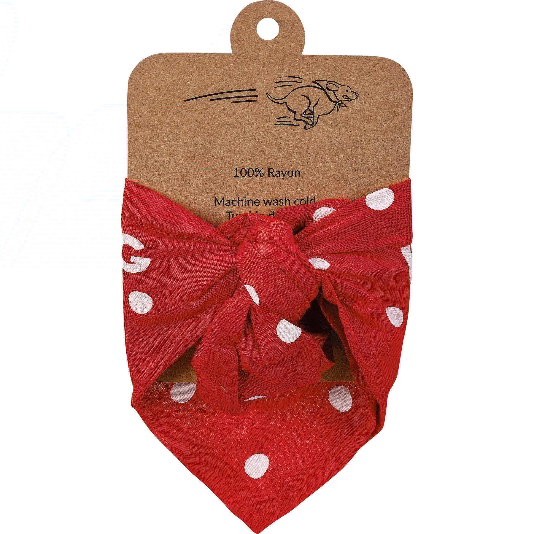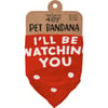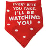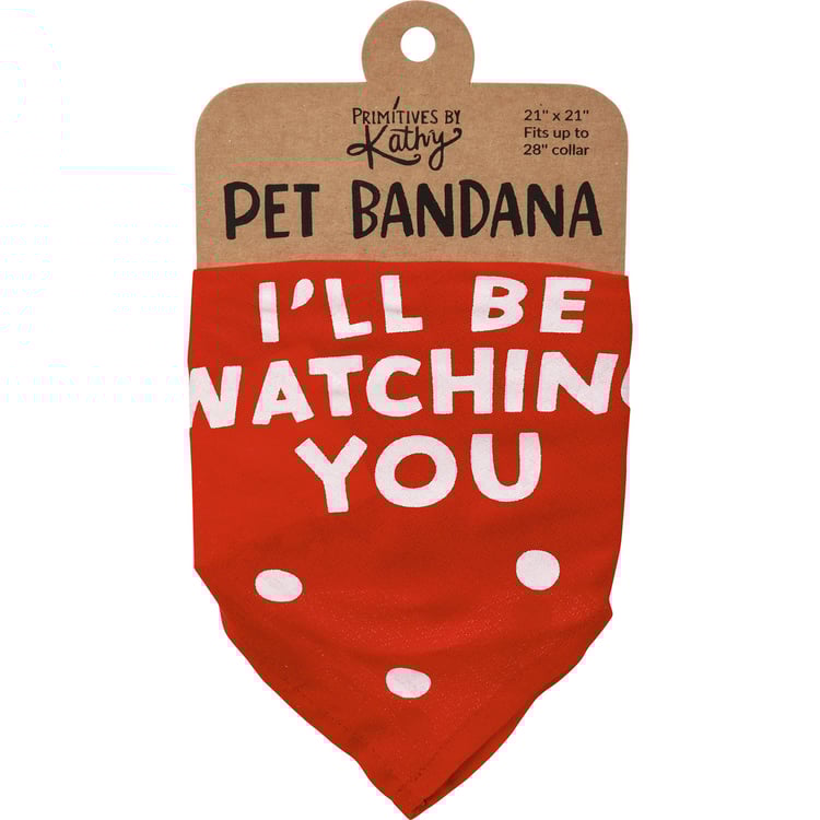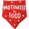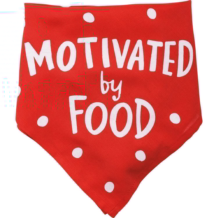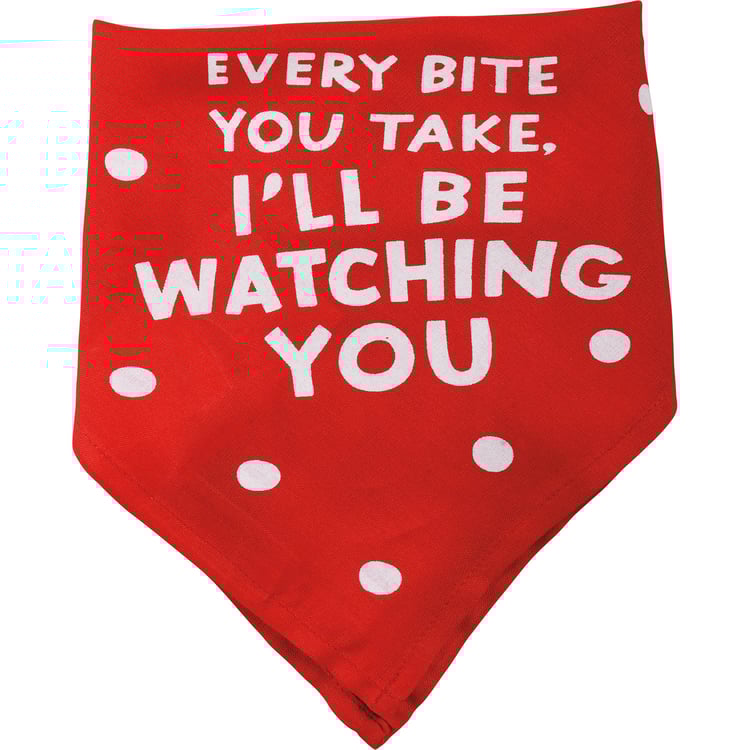 A large reversible pet bandana from our Pet Collection featuring hand lettered "Motivated By Food" sentiment in one corner, hand lettered "Every Bite You Take, I'll Be Watching You" sentiment in the opposite corner, and polka dot design. 21" x 21". Made of soft rayon to resist dirt. Our large Motivated by Food pet bandana is machine-washable.