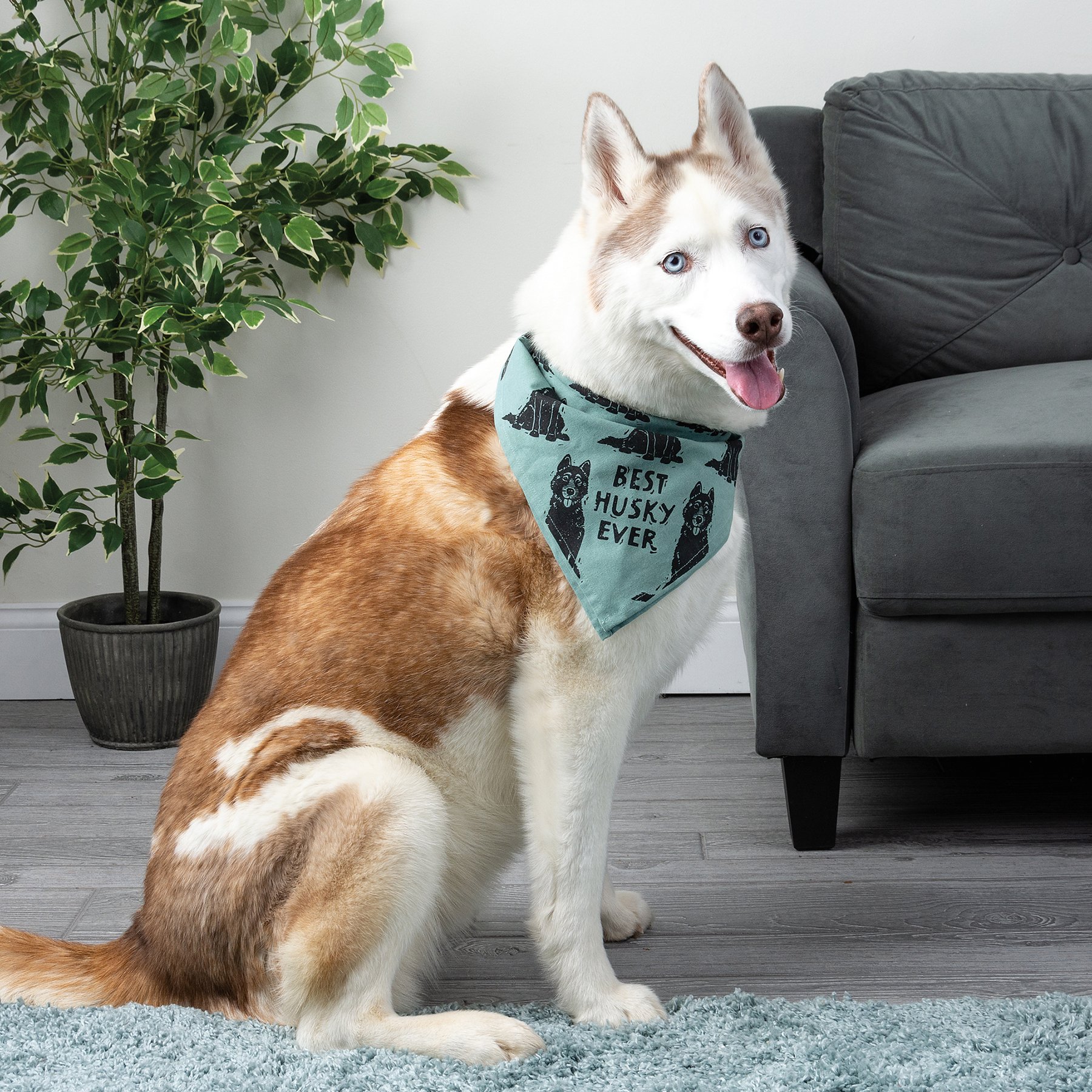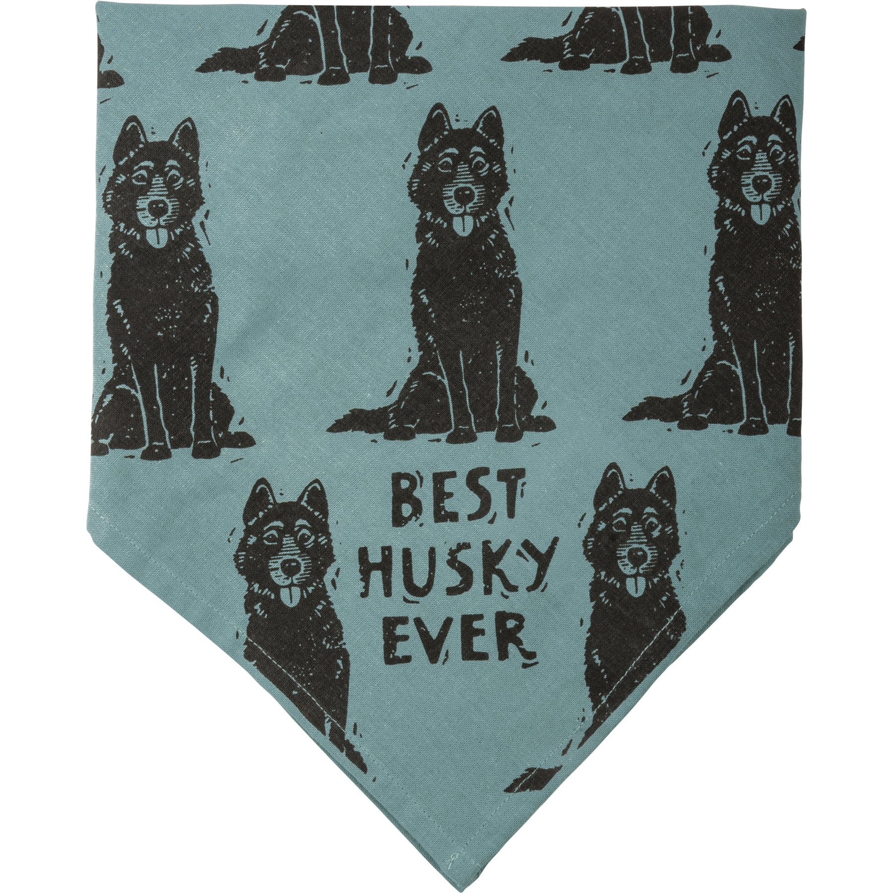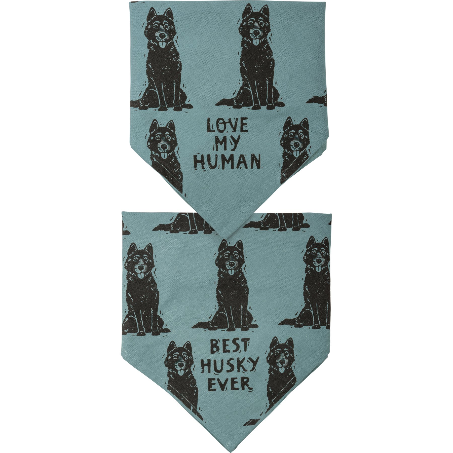 A large reversible pet bandana from our Pet Collection featuring "Best Husky Ever" and "Love My Human" sentiments on opposite corners with an all-over block print husky design. Bandana is made of cotton and is machine-washable. Best Husky Ever pet bandana coordinates with our Love My Husky Baseball Cap for matching dog and owner outfits.