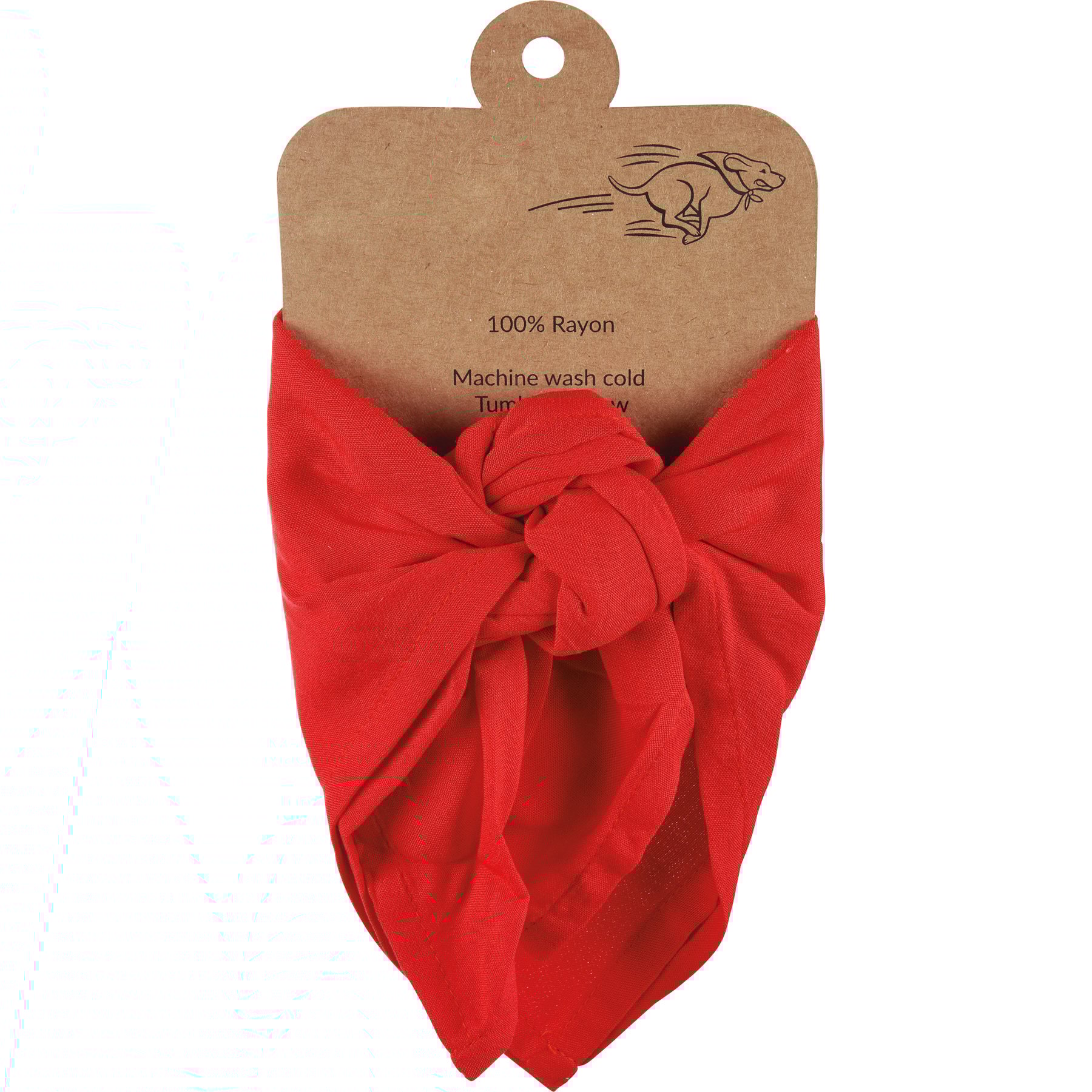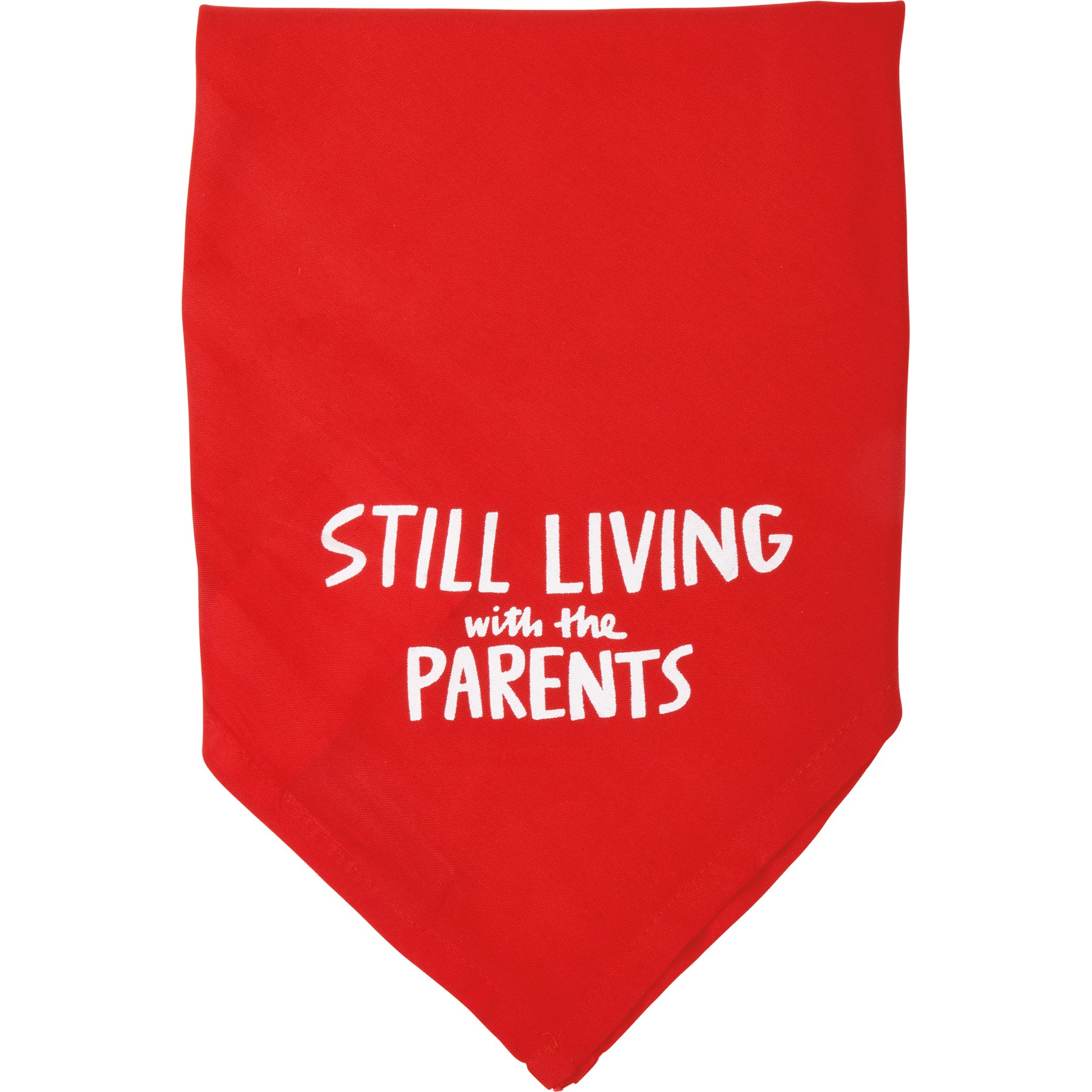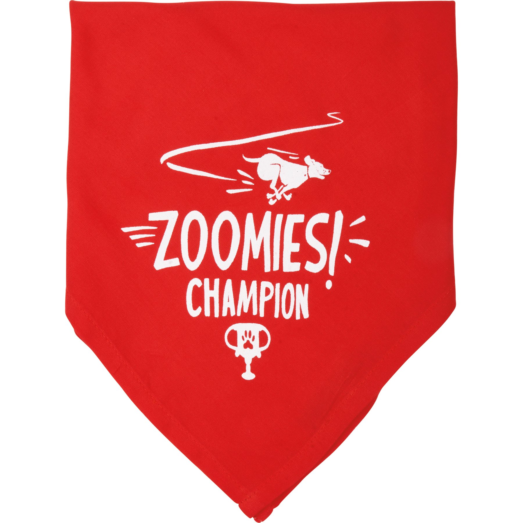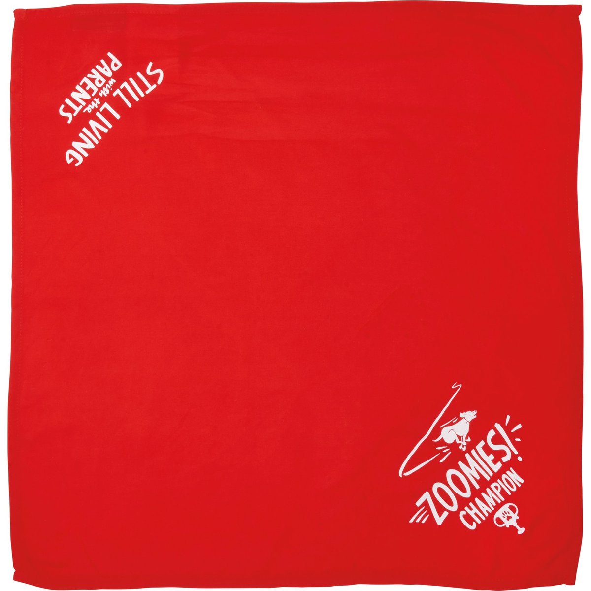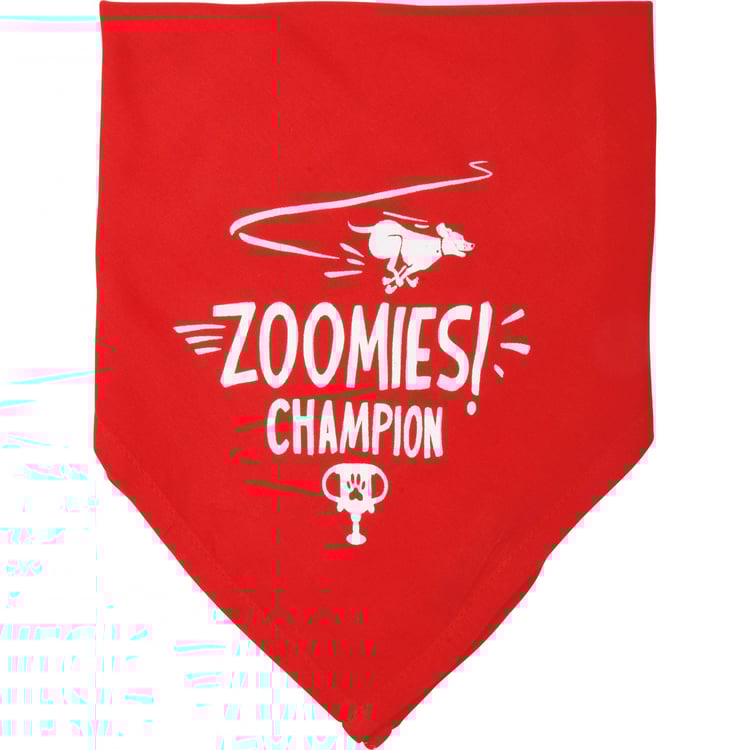 A large reversible pet bandana from our Pet Collection displaying hand illustrated designs on opposite corners for multiple style options. Designs include running dog and trophy with "Zoomies! Champion" sentiment on one corner and "Still Living With The Parents" sentiment on the other corner. Bandana features soft rayon material to resist dirt. Our ZoomiesChampion pet bandana is machine-washable for convenient cleaning. Packaged on a cardboard backer with hole to easily display on rack and wash instructions on the back. A stylish everyday accessory perfect for any furry family member. Large size fits up to a 28 inch neck.