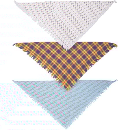 A set of three large pet bandanas from our Pet Collection displaying individual pride-themed designs and fashionable fringed trim. Designs include rainbow paw print pattern, rainbows pattern, and woven rainbow plaid. Pet bandanas coordinate well with complementing scarves and pet bow ties so pet parents and their furry family member can have a sweet matching moment. Each measures 38 inches x 18 inches and fit necks up to 30 inches. Machine-washable for convenient cleaning. Our Rainbow Plaid pet bandana set is folded on a kraft paper card with hole to easily hang on rack. A portion of the proceeds from the sale of this Benefit Item will be donated to Lancaster LGBTQ+ Coalition to support their commitment to building a more inclusive Lancaster County abundant in opportunities for LGBTQQIA+ individuals.