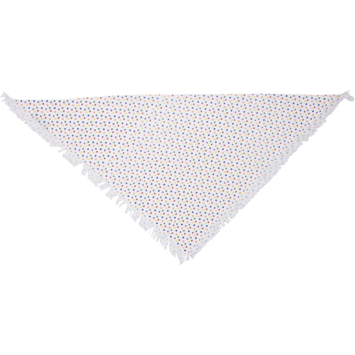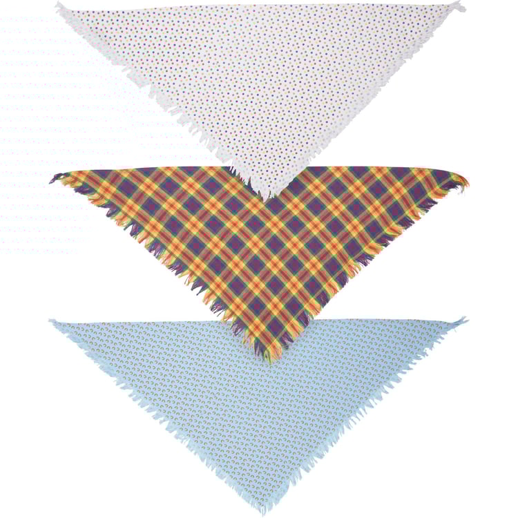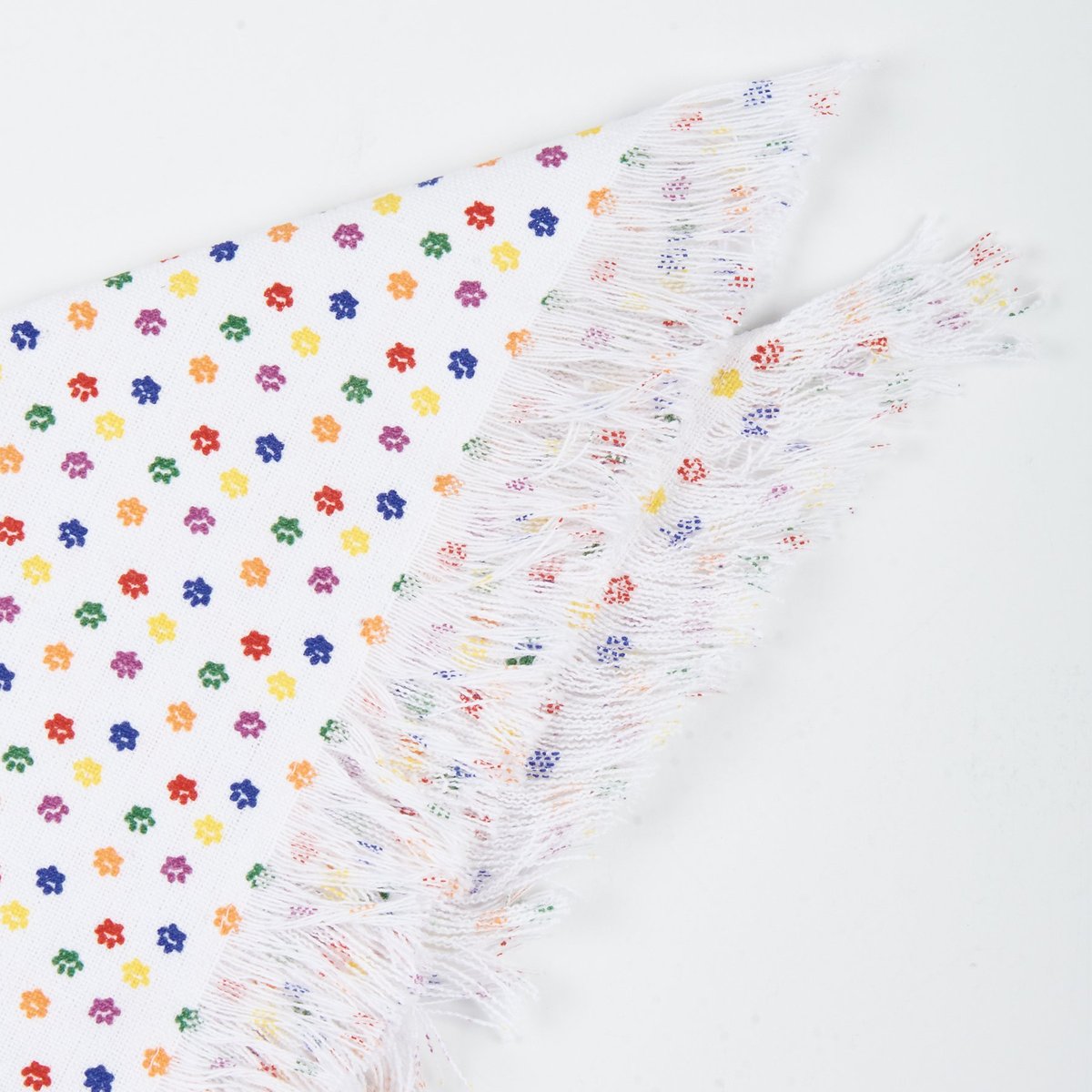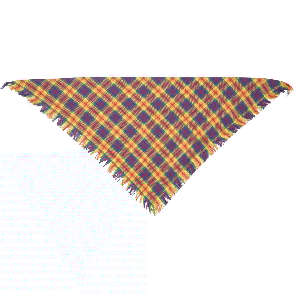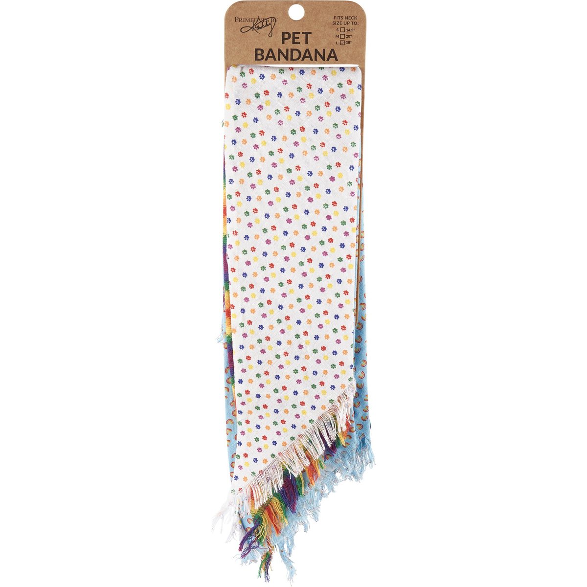 A set of three large pet bandanas from our Pet Collection displaying individual pride-themed designs and fashionable fringed trim. Designs include rainbow paw print pattern, rainbows pattern, and woven rainbow plaid. Pet bandanas coordinate well with complementing scarves and pet bow ties so pet parents and their furry family member can have a sweet matching moment. Each measures 38 inches x 18 inches and fit necks up to 30 inches. Machine-washable for convenient cleaning. Our Rainbow Plaid pet bandana set is folded on a kraft paper card with hole to easily hang on rack. A portion of the proceeds from the sale of this Benefit Item will be donated to Lancaster LGBTQ+ Coalition to support their commitment to building a more inclusive Lancaster County abundant in opportunities for LGBTQQIA+ individuals.