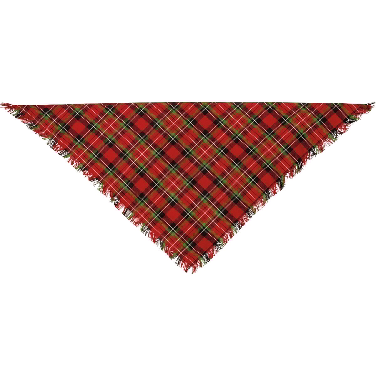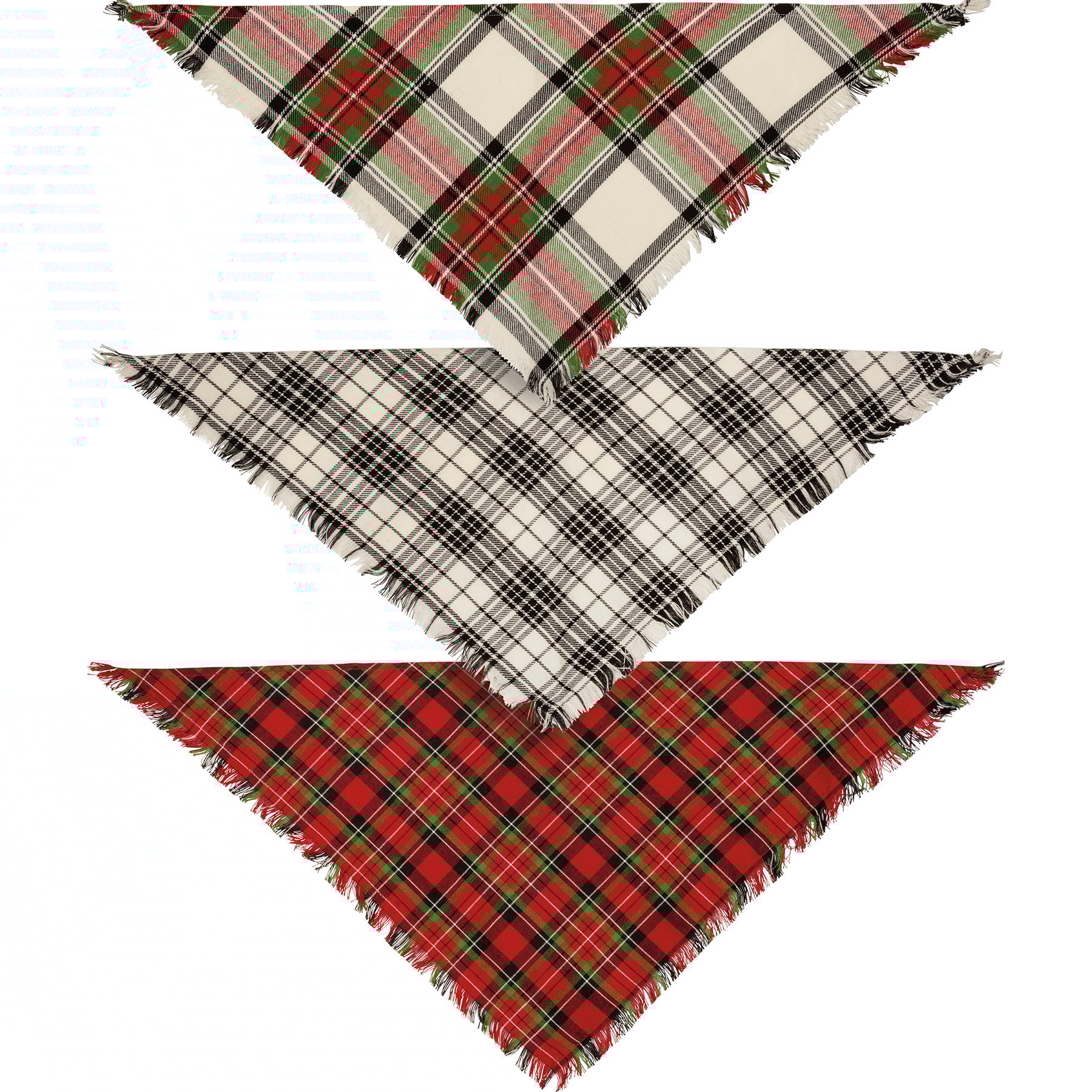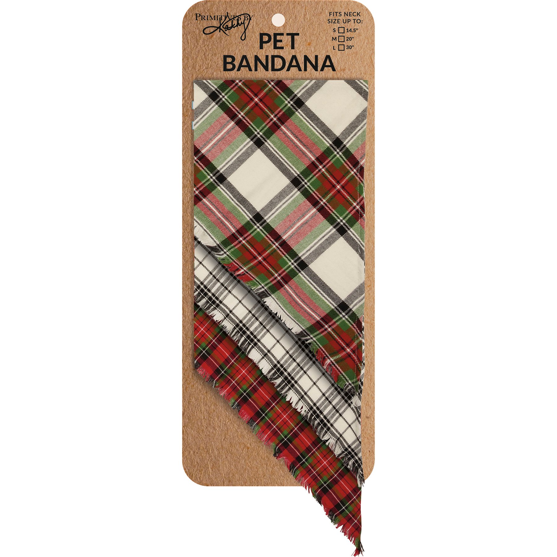 A set of three medium pet bandanas from our Pet Collectionfeaturing holiday plaid designs and fashionable fringed trim. Bandanas are folded on a kraft paper card and packaged in a protective polybag. Card includes a cutout to easily hang on rack and package includes an insert with instructions for use. Bandanas are 28" x 14" and fits necks up to 20". Machine-washable. Plaid Christmas Pet bandanas coordinate well with complementing people scarves and pet bow ties so pet parents and their fur babies can have a sweet matching moment.