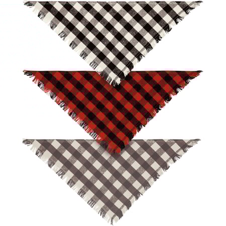 A set of three small pet bandanas featuring buffalo check designs and fashionable fringed trim. Bandanas are folded on a kraft paper card and packaged in a protective polybag. Card includes a cutout to easily hang on rack and package includes an insert with instructions for use. Bandanas are 20" x 10" and fit necks up to 14.50". Machine-washable. Pet bandanas coordinate well with complementing people scarves and pet bow ties so pet parents and their fur babies can have a sweet matching moment.