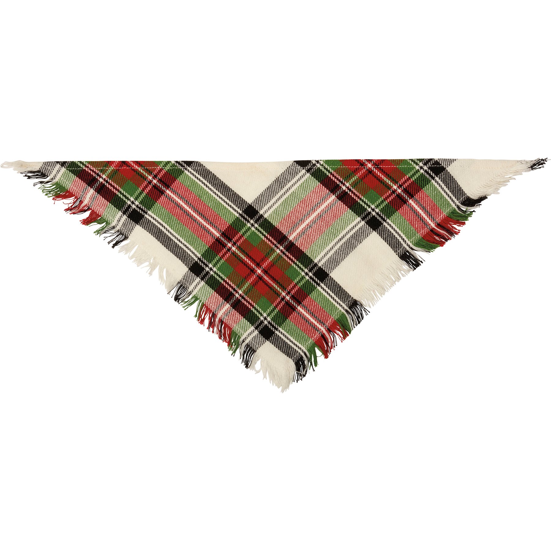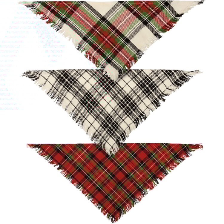 A set of three small pet bandanas from our Pet Collection featuring holiday plaid designs and fashionable fringed trim. Bandanas are folded on a kraft paper card and packaged in a protective polybag. Card includes a cutout to easily hang on rack and package includes an insert with instructions for use. Bandanas are 20" x 10" and fit necks up to 14.50". Machine-washable.Plaid Christmas Pet bandanas coordinate well with complementing people scarves and pet bow ties so pet parents and their fur babies can have a sweet matching moment.