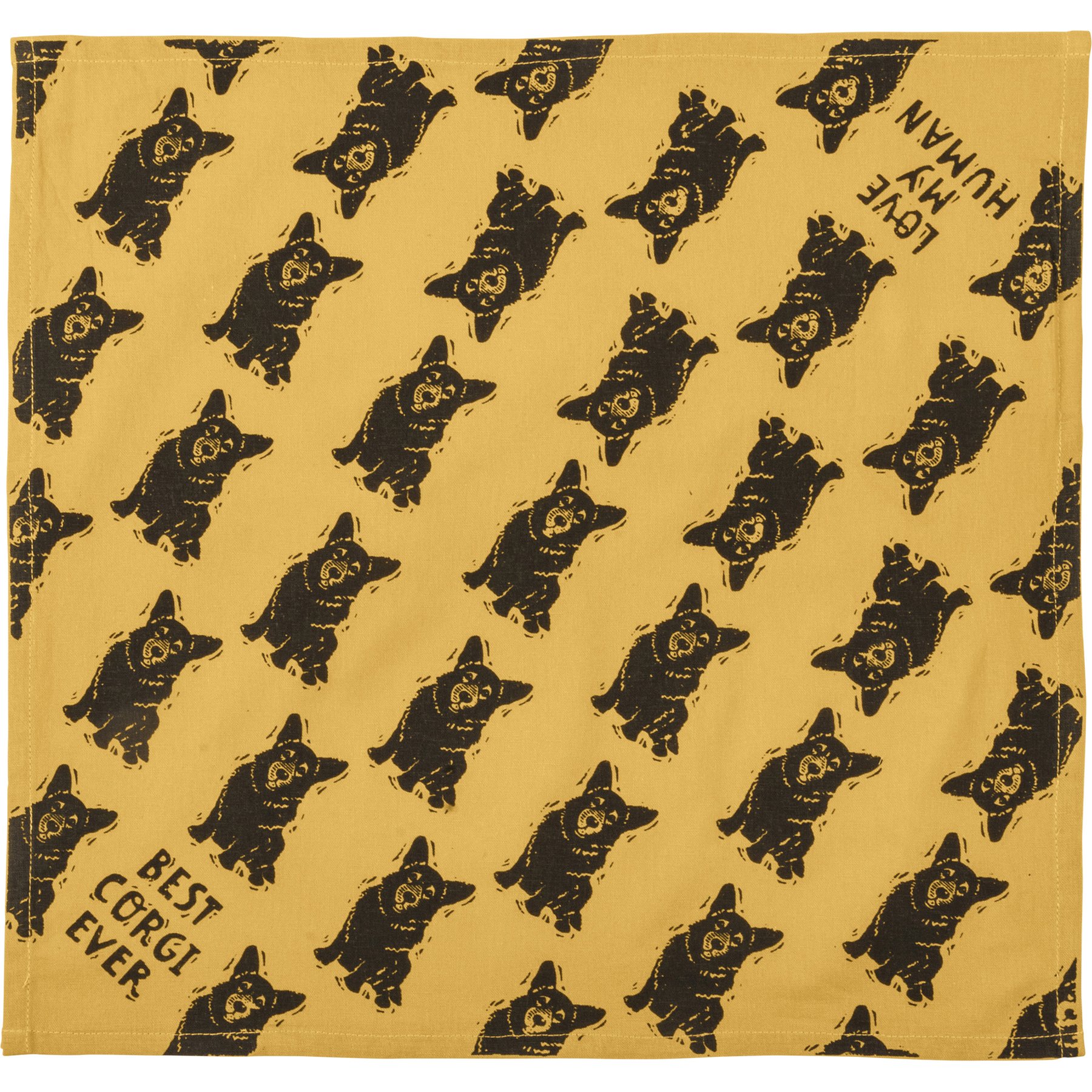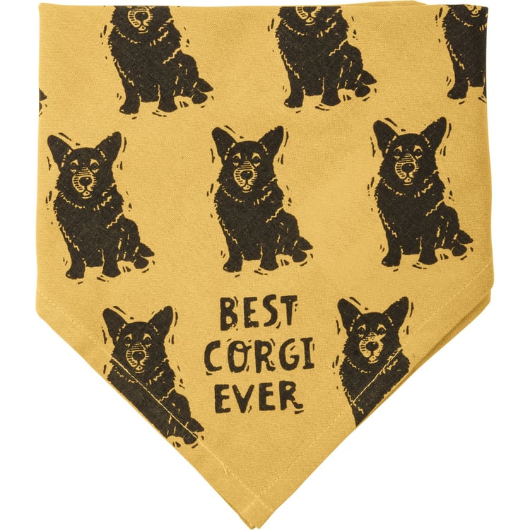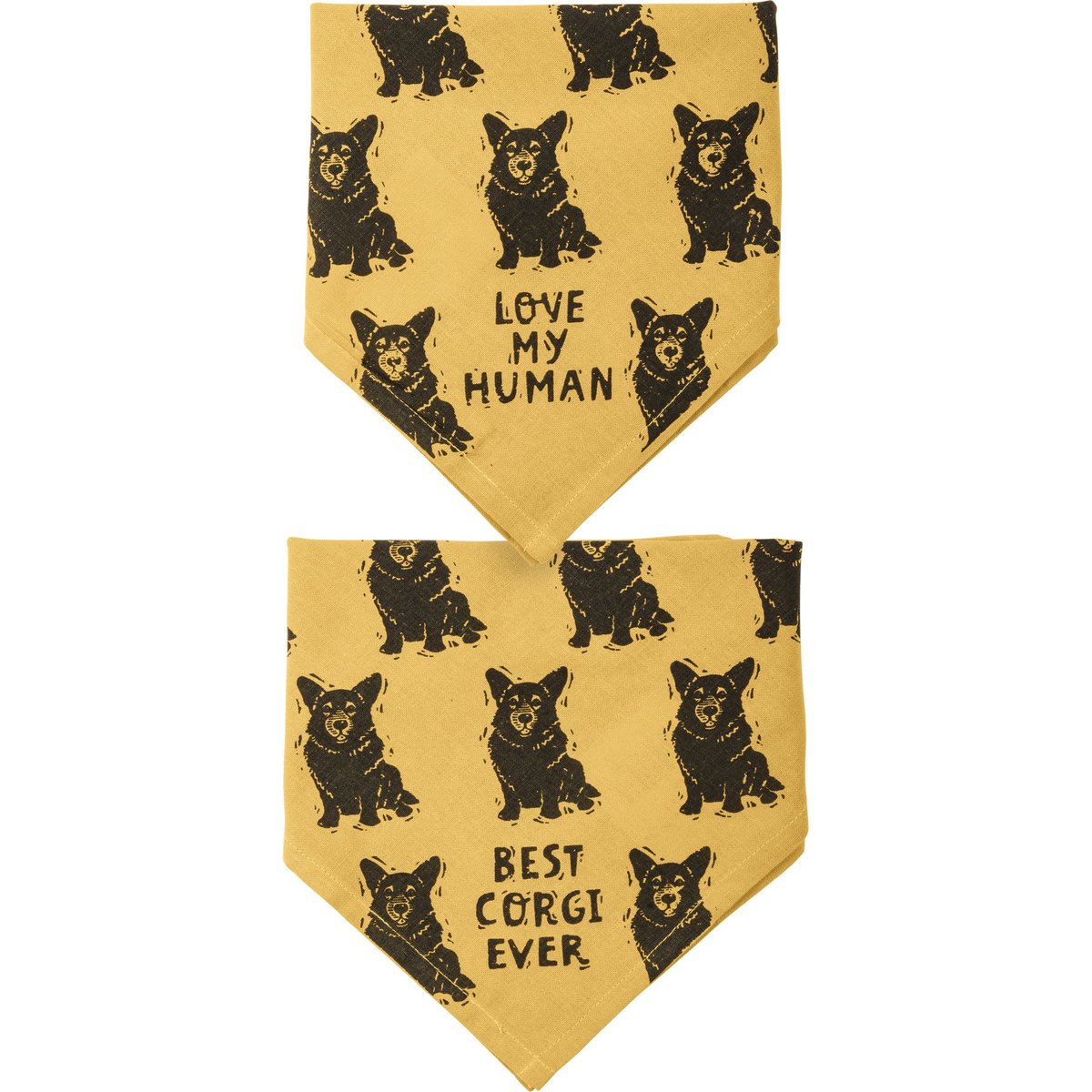 A small reversible pet bandana from our Pet Collection featuring "Best Corgi Ever" and "Love My Human" sentiments on opposite corners with an all-over block print corgi design. Bandana is made of cotton and is machine-washable. Best Corgi Ever pet bandana coordinates with our Love My Corgi Baseball Cap for matching dog and owner outfits.