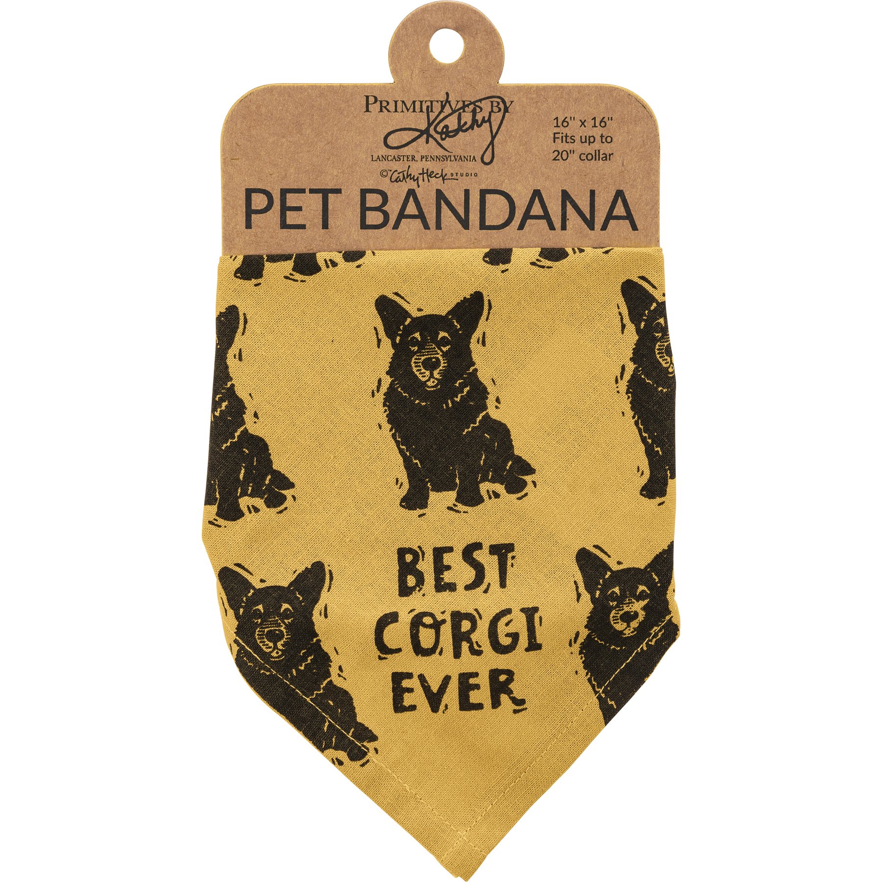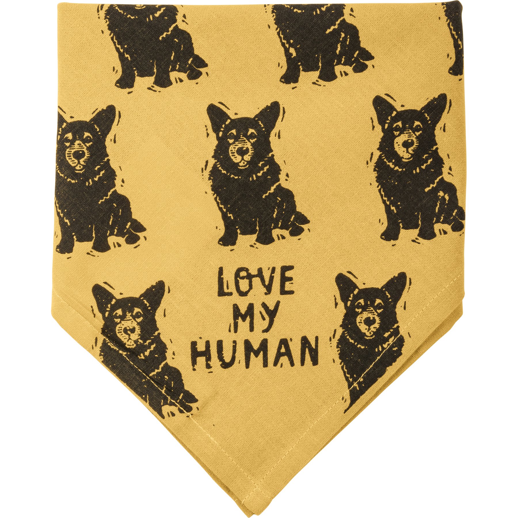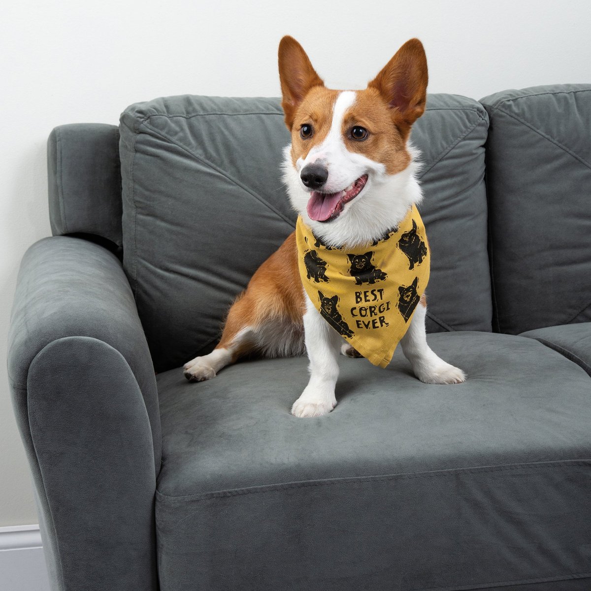 A small reversible pet bandana from our Pet Collection featuring "Best Corgi Ever" and "Love My Human" sentiments on opposite corners with an all-over block print corgi design. Bandana is made of cotton and is machine-washable. Best Corgi Ever pet bandana coordinates with our Love My Corgi Baseball Cap for matching dog and owner outfits.