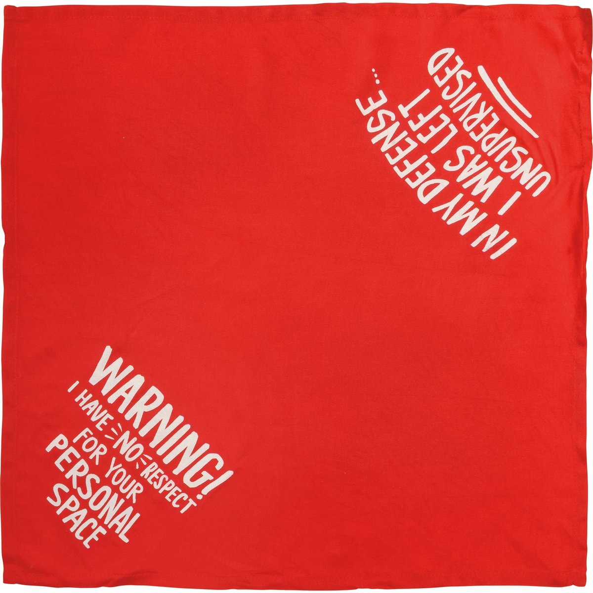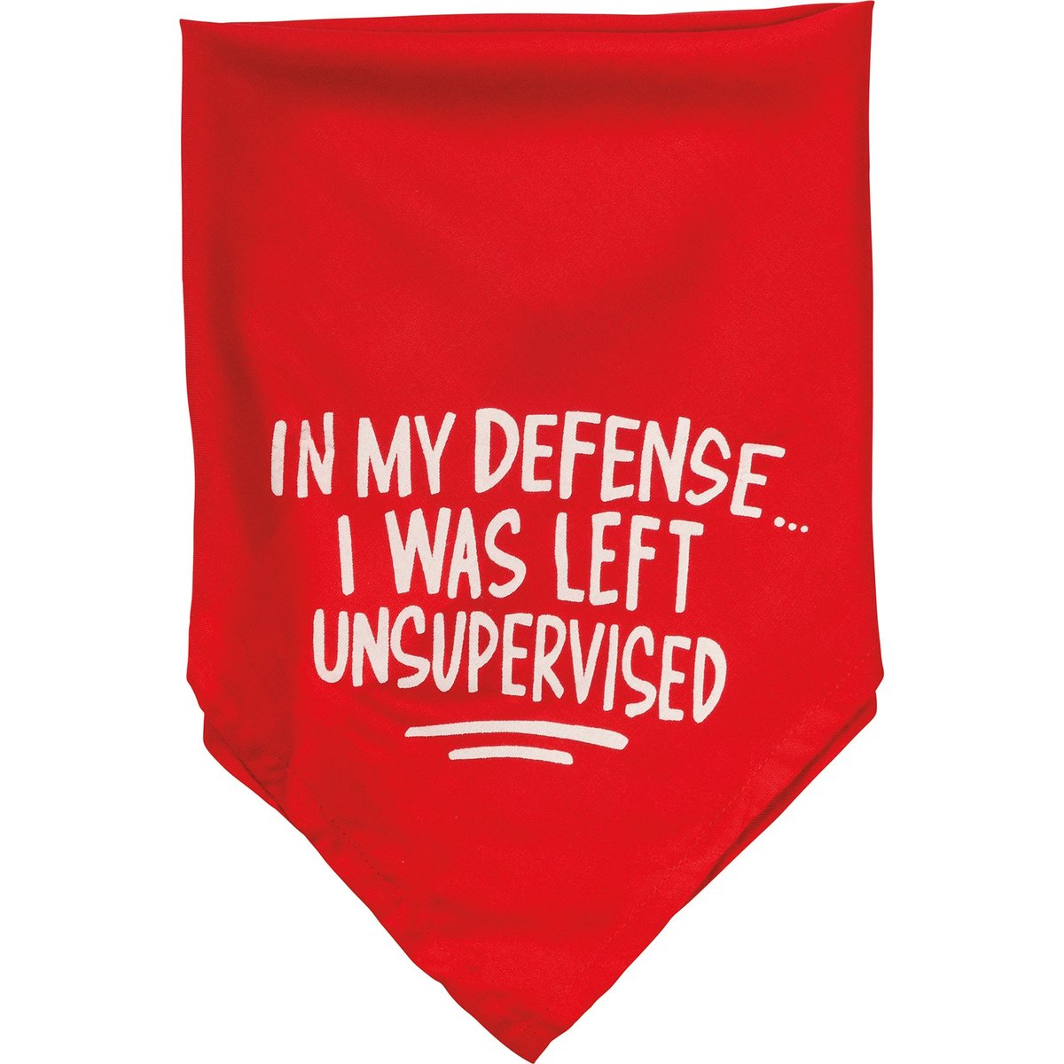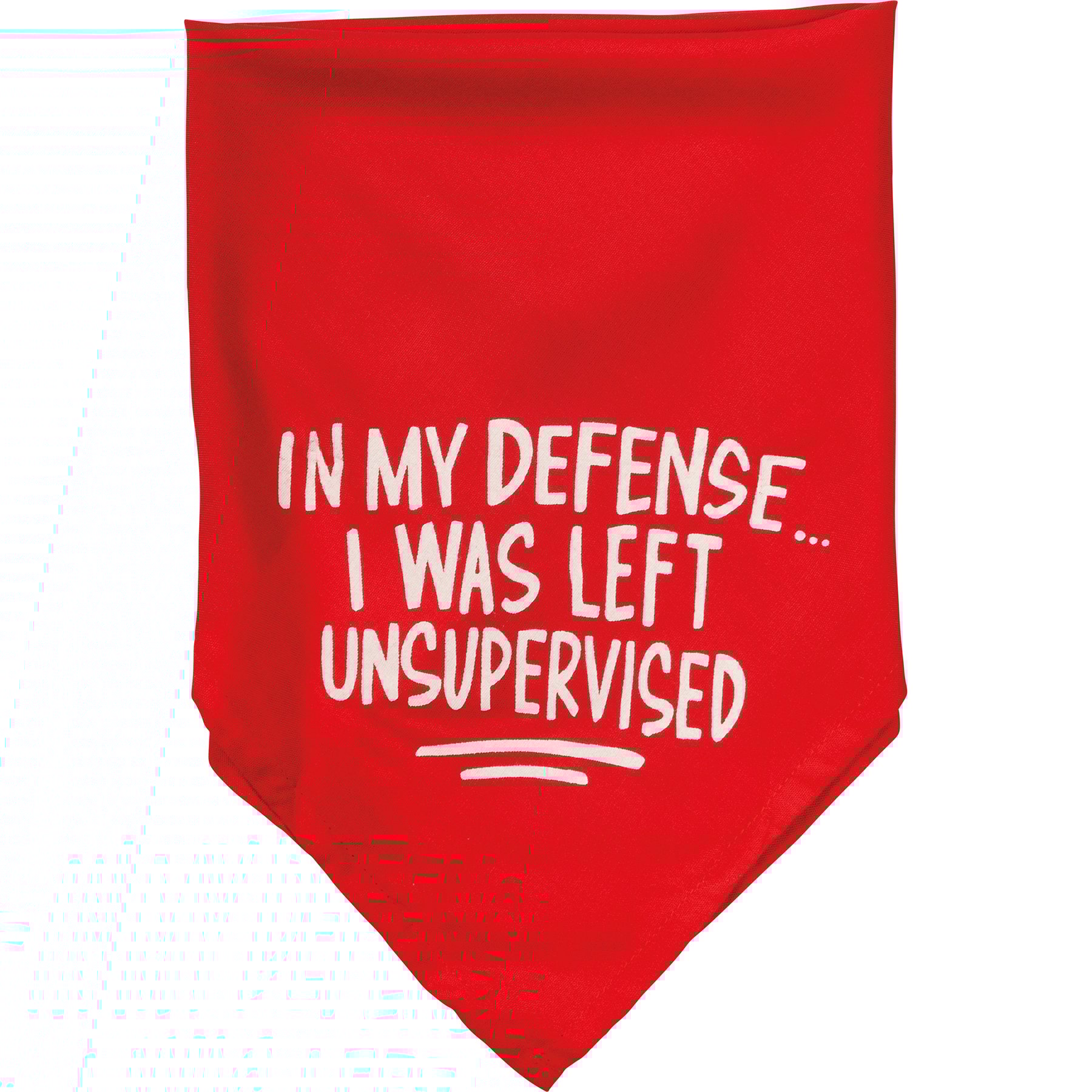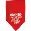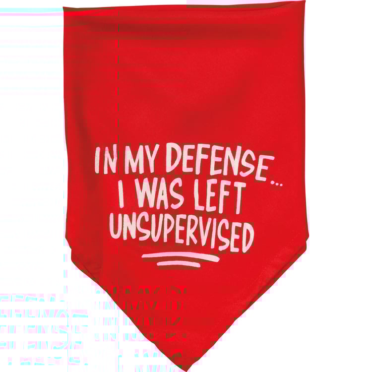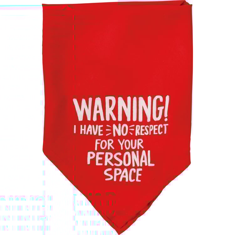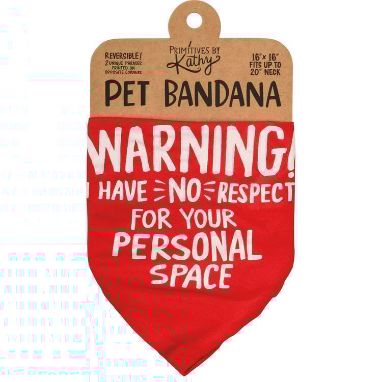 A small reversible pet bandana featuring hand lettered "Warning! I Have No Respect For Your Personal Space" and "In My Defenseā¦I Was Left Unsupervised" sentiments on opposite corners. 16" x 16". Made of soft rayon to resist dirt. Machine-washable.