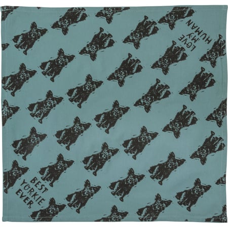 A small reversible pet bandana from our Pet Collection featuring "Best Yorkie Ever" and "Love My Human" sentiments on opposite corners with an all-over block print yorkie design. Bandana is made of cotton and is machine-washable. Best Yorkie Ever pet bandana coordinates with our Love My Yorkie Baseball Cap for matching dog and owner outfits.