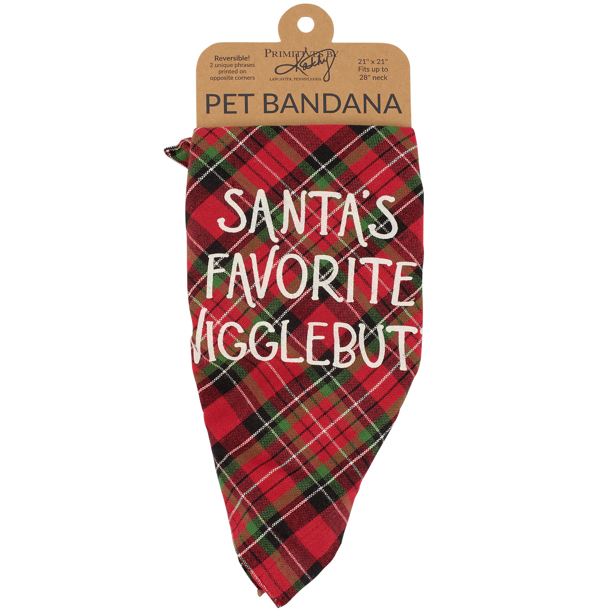 A reversible pet bandana sized for large pets from our Holiday Pet Collection displaying a Christmas inspired plaid with pet-themed seasonal sentiments on opposite corners for multiple style options. Holiday pet sentiments include "Santa's Favorite Wigglebutt" on one corner and "I Ate The Naughty List" on the other corner. Our large Wiggle/List pet bandana is conveniently machine-washable for easy cleaning. Seasonal pet bandana is packaged on a cardboard backer with hole for easy store rack display. A fun pet-themed Christmas gift perfect for any furry family member up to a 28 inch neck.