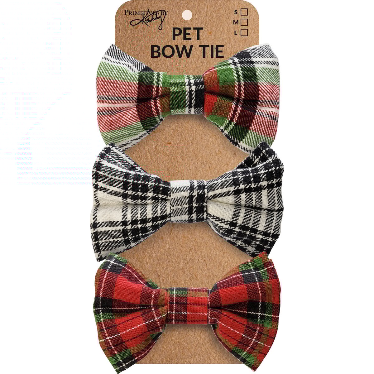 A set of three large pet bow ties featuring Christmas plaid designs. Each bow tie is made of soft cotton and easily attaches to a collar using a single velcro loop. Bow ties come attached to a kraft paper card with a keyhole to easily display on rack. Hand wash only. Pet bow ties coordinate well with complementing people scarves and pet bandanas so pet parents and their fur babies can have a sweet matching moment.