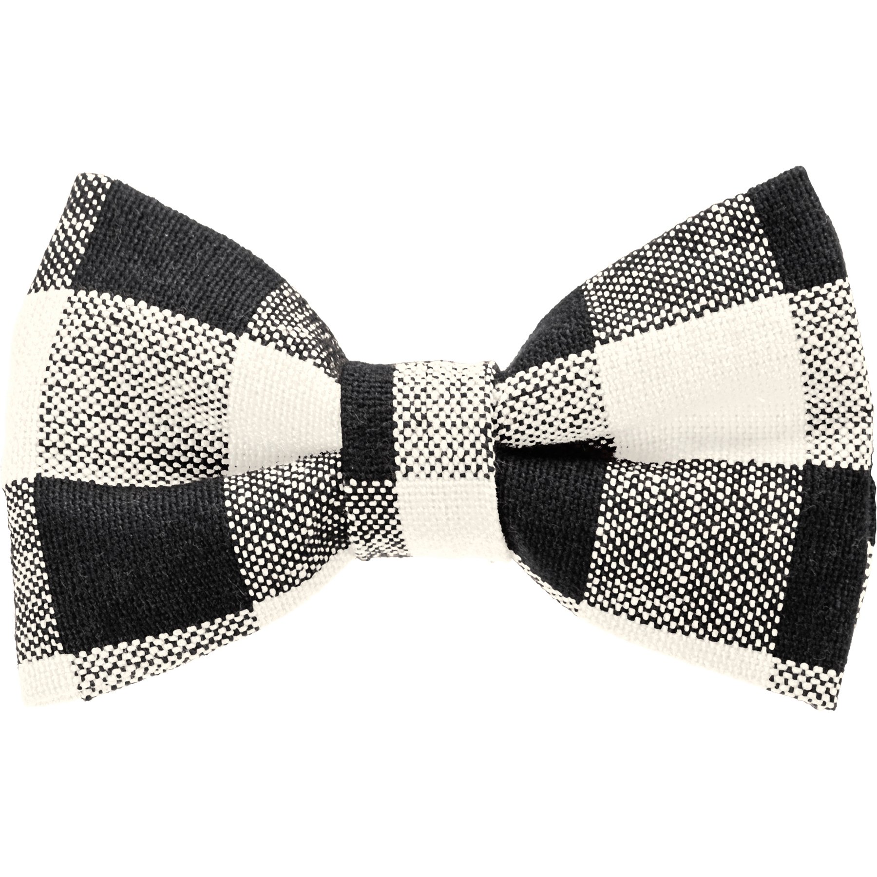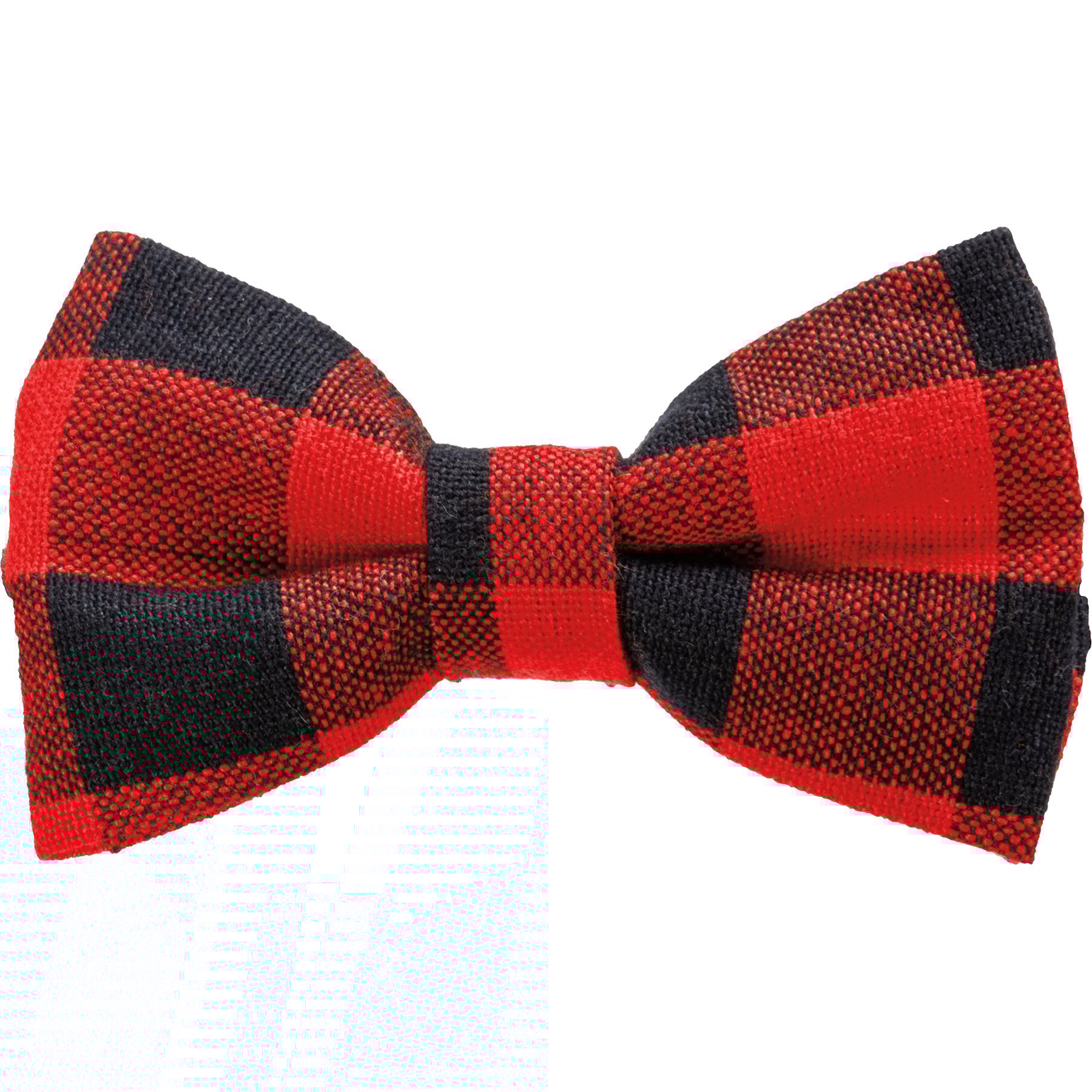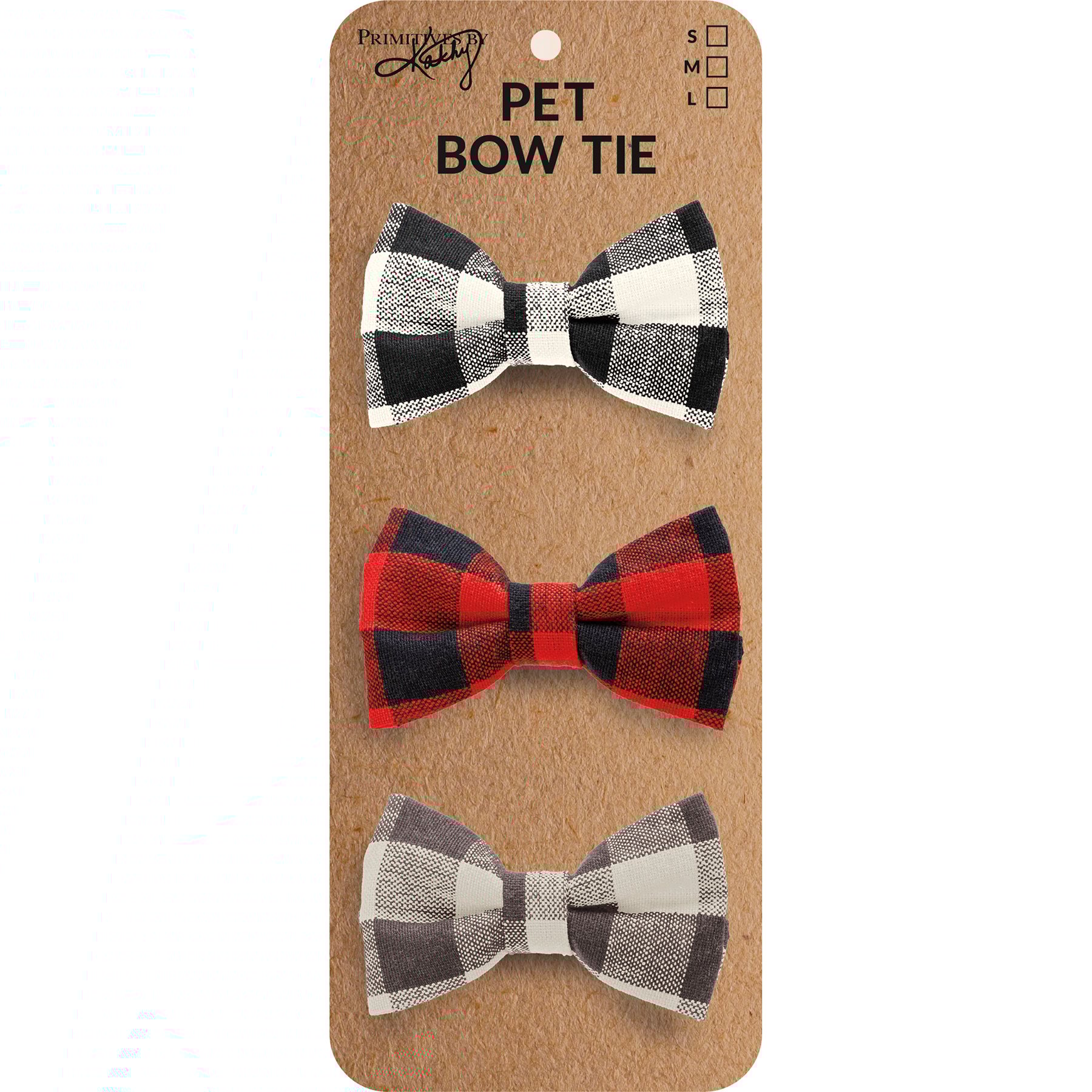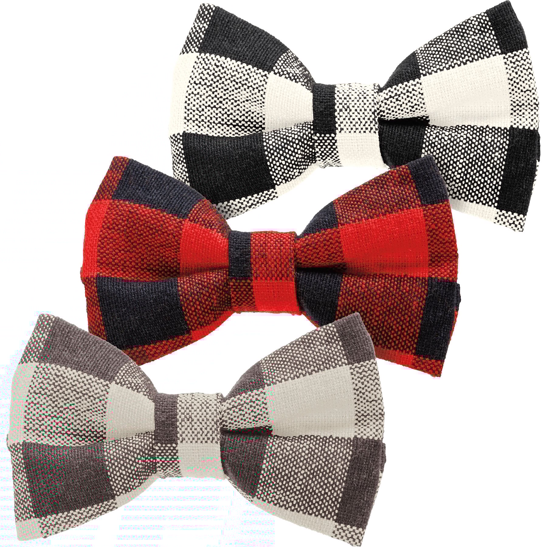 A set of three medium pet bow ties featuring buffalo check designs. Each bow tie is made of soft cotton and easily attaches to a collar using a single velcro loop. Bow ties come attached to a kraft paper card with a keyhole to easily display on rack. Hand wash only. Pet bow ties coordinate well with complementing people scarves and pet bandanas so pet parents and their fur babies can have a sweet matching moment.