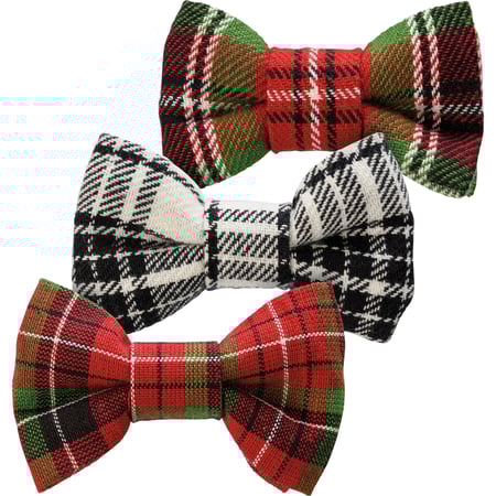A set of three medium pet bow ties featuring Christmas plaid designs. Each bow tie is made of soft cotton and easily attaches to a collar using a single velcro loop. Bow ties come attached to a kraft paper card with a keyhole to easily display on rack. Hand wash only. Pet bow ties coordinate well with complementing people scarves and pet bandanas so pet parents and their fur babies can have a sweet matching moment.