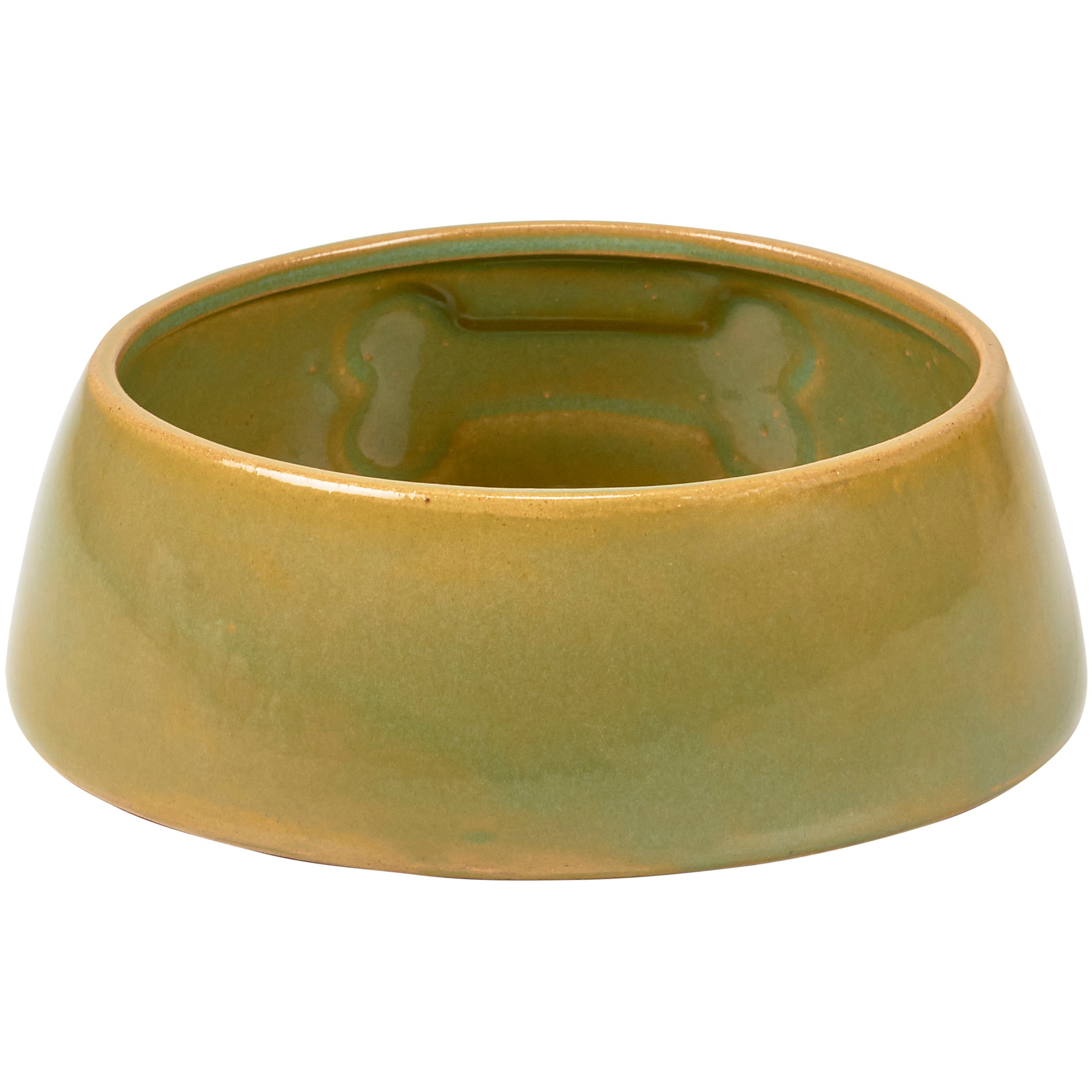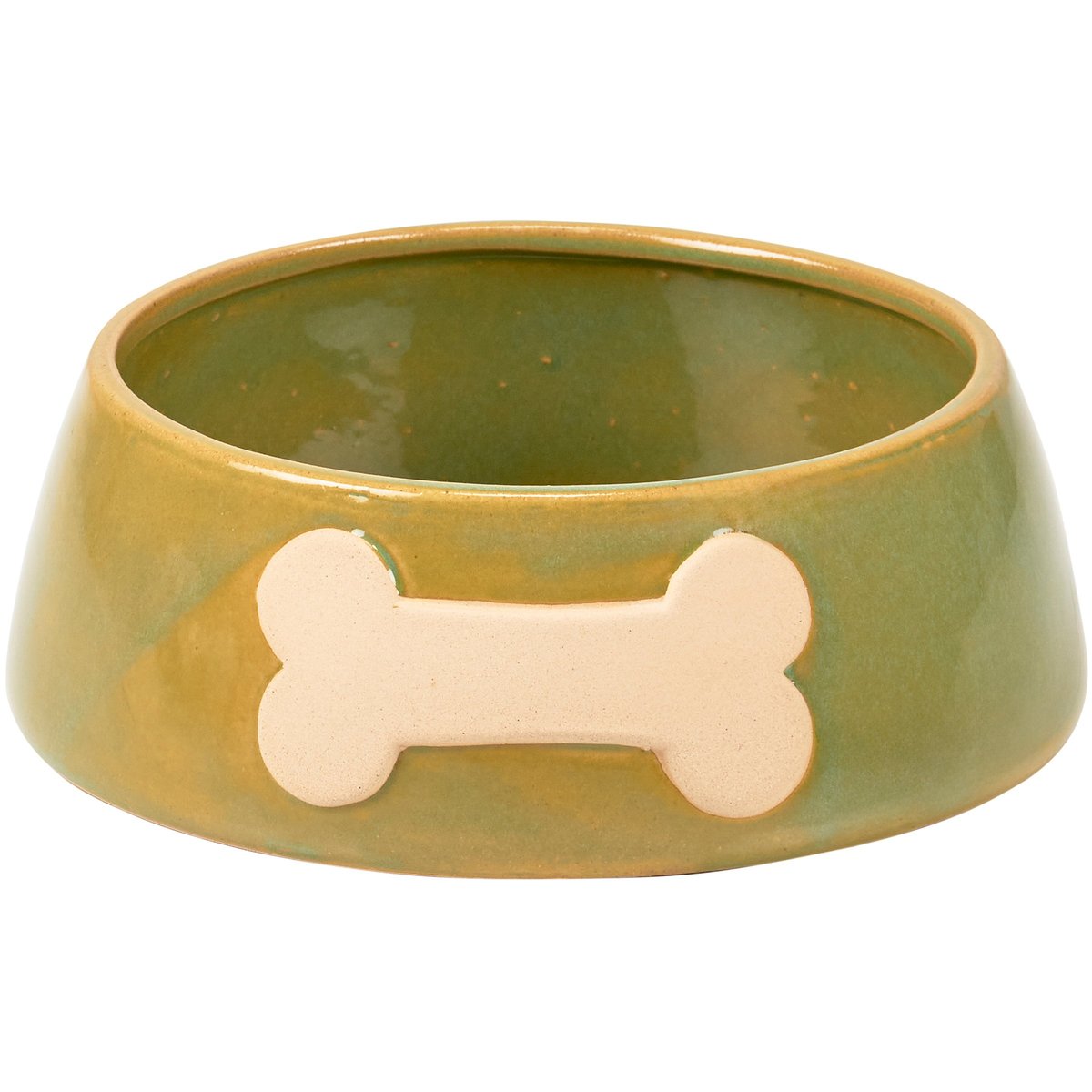 A large stoneware pet bowl from our Pet Collection displaying an olive green glaze finish with an embossed bone design on the front. Pet bowl features bare ceramic accents on the bone design for a handmade style. Our Bone pet bowl is conveniently dishwasher safe for easy cleaning. A stylish pet accessory perfect for everyday use.